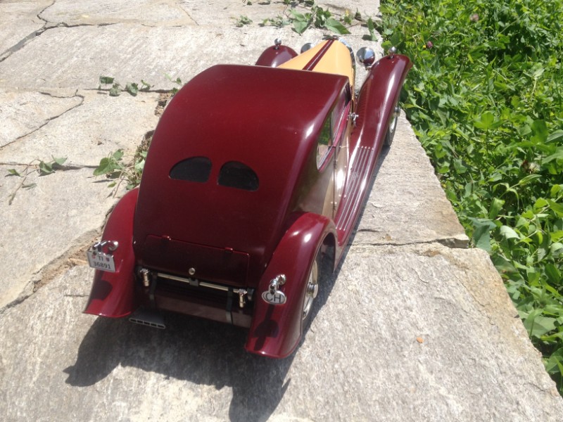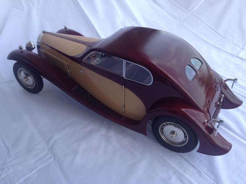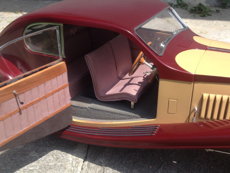 The builder's choices of colors and materials are delightful and the result is that one can 'see' the model and not be confined to seeing what one expects. Without expectations, the design can be appreciated for its intrinsic qualities: Sweeping fastback with split rear window; Jean Bugatti signature curve of the perfectly named 'wings'; and thrusting, imperial hood. It is no mistake that the Type 50 was often referred to as the 'petite royale' in a reference to the gigantic eight Bugatti Royales which rolled on 36"diameter wheels and were meant for royal owners, and Righetti's version lives up to the tradition.