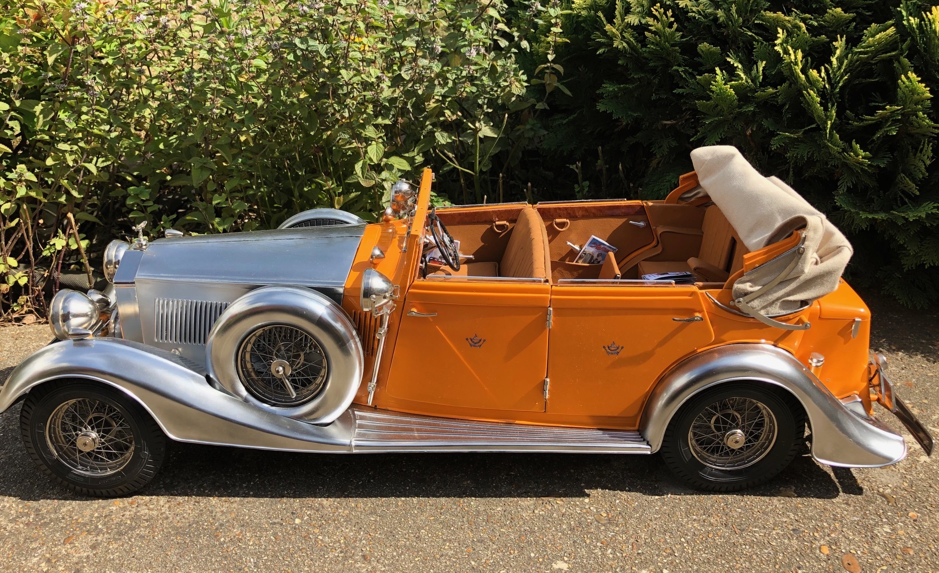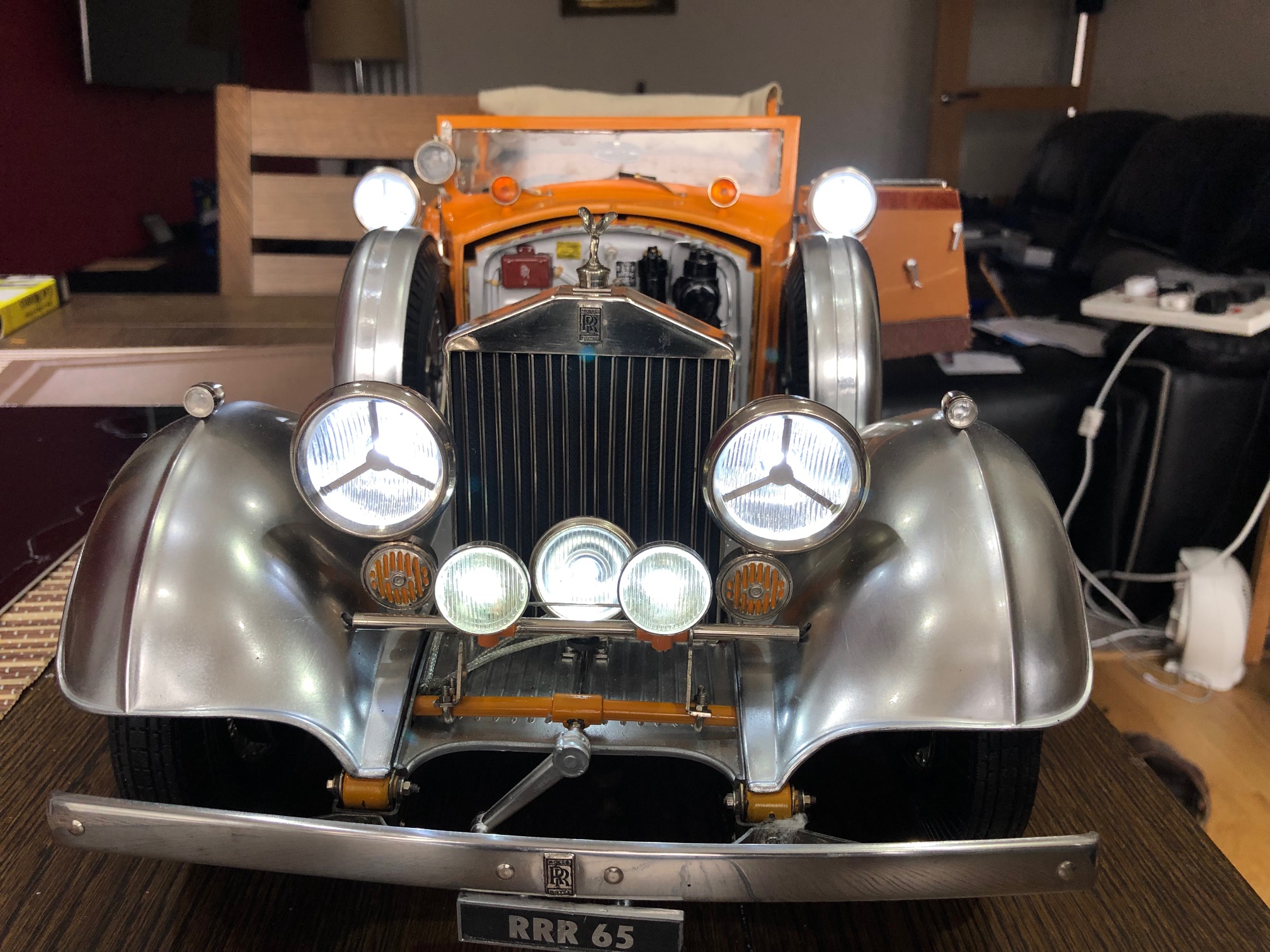 One of Pocher's most iconic and striking prototypes is the Rolls-Royce four-door cabriolet built for the Rajkot state in 1934 on a Phantom II chassis. Aside from all of the striking features of any other PII, 188PY was adorned with polished aluminum wings and bonnet, huge hunting spotlights on the sides of the body, and an assortment of crests and lights deemed appropriate for the majesty of the maharajah himself. As such, the car was an early masterpiece of branding, and the introduction of the 1:8 scale kits by Pocher did the same thing for them. Few model builders are unaware of the kit, and fewer still have had the temerity to take on such a project. Fifty years after its introduction, this kit is still making a big noise among model builders, and among the select group who have successfully assembled one, the model occupies a special place in their model collection, and assures their membership in a very exclusive club. In some circles, having one of these beasts on the man-cave shelf is a first class ticket to celebrity.