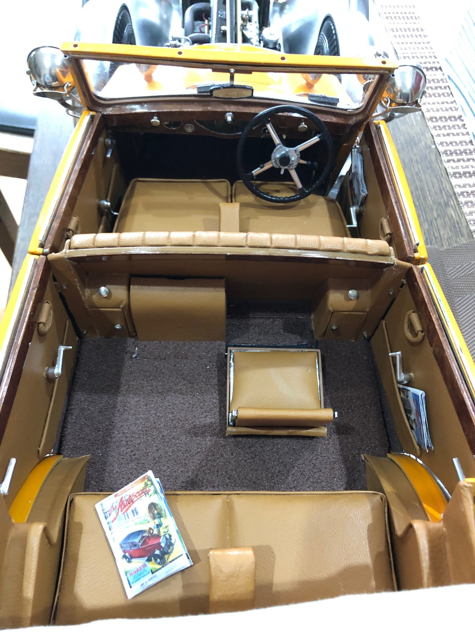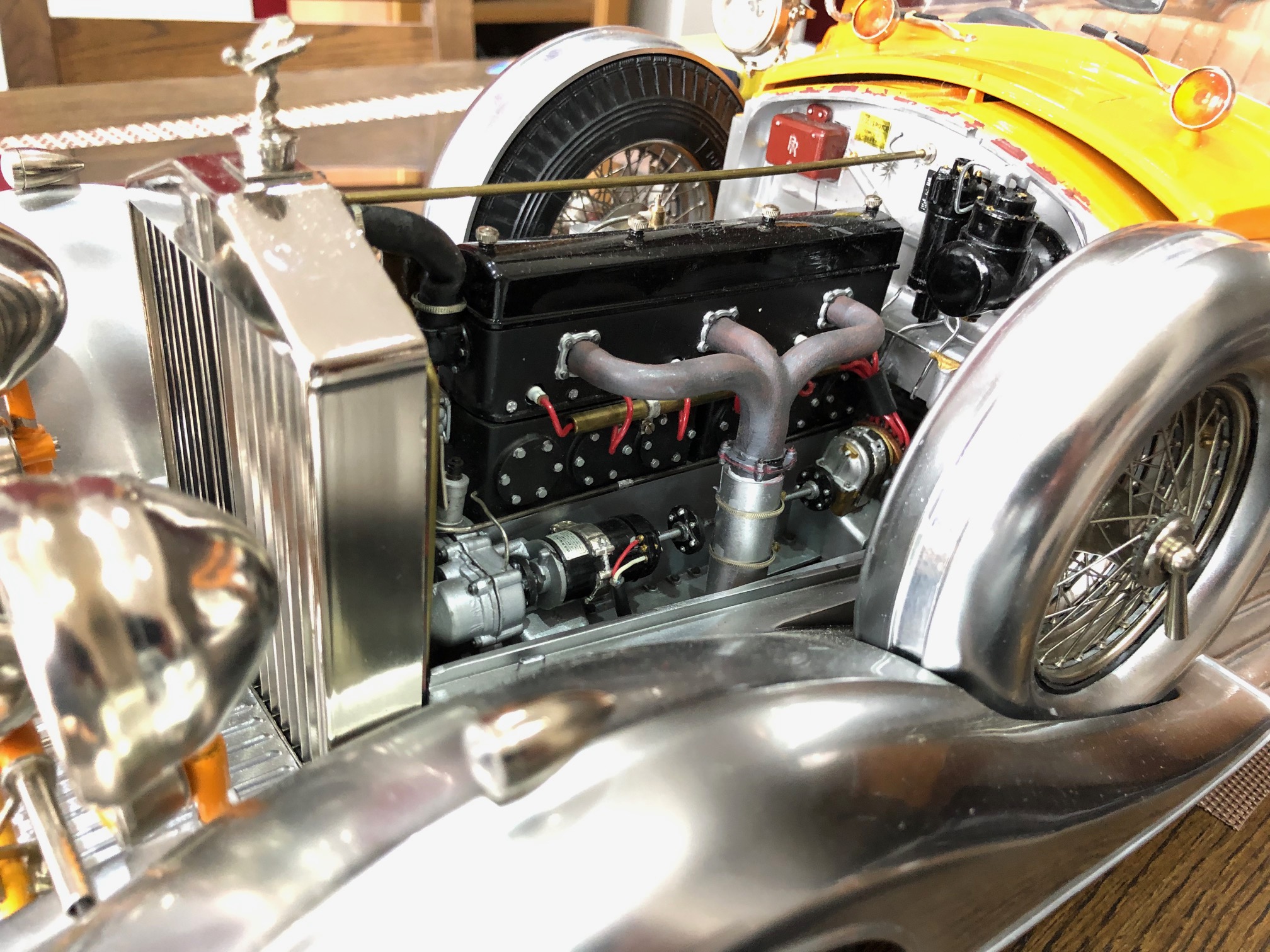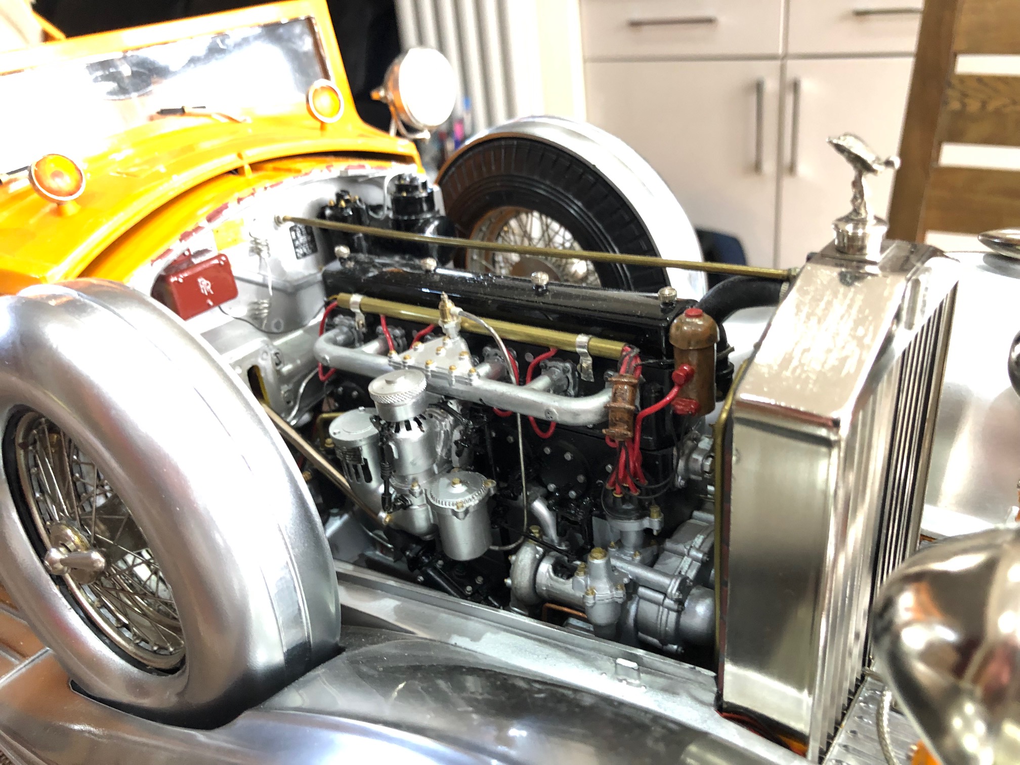 All of this brings us to Bap Athwal (UK) and his version of this legendary kit. Evidently, 3000 components was not enough for Mr. Athwal, who has added even more details to his model, including door pulls, engine details, wood veneer, real leather and working lights. His model is a testament to his determination and attention to detail-even the RR logo on the electrical box is high-lighted. From the miniature Autocar magazine on the rear seat to the working tiger lights, Mr. Athwal's model is a handsome tribute to both the prototype and the kit.