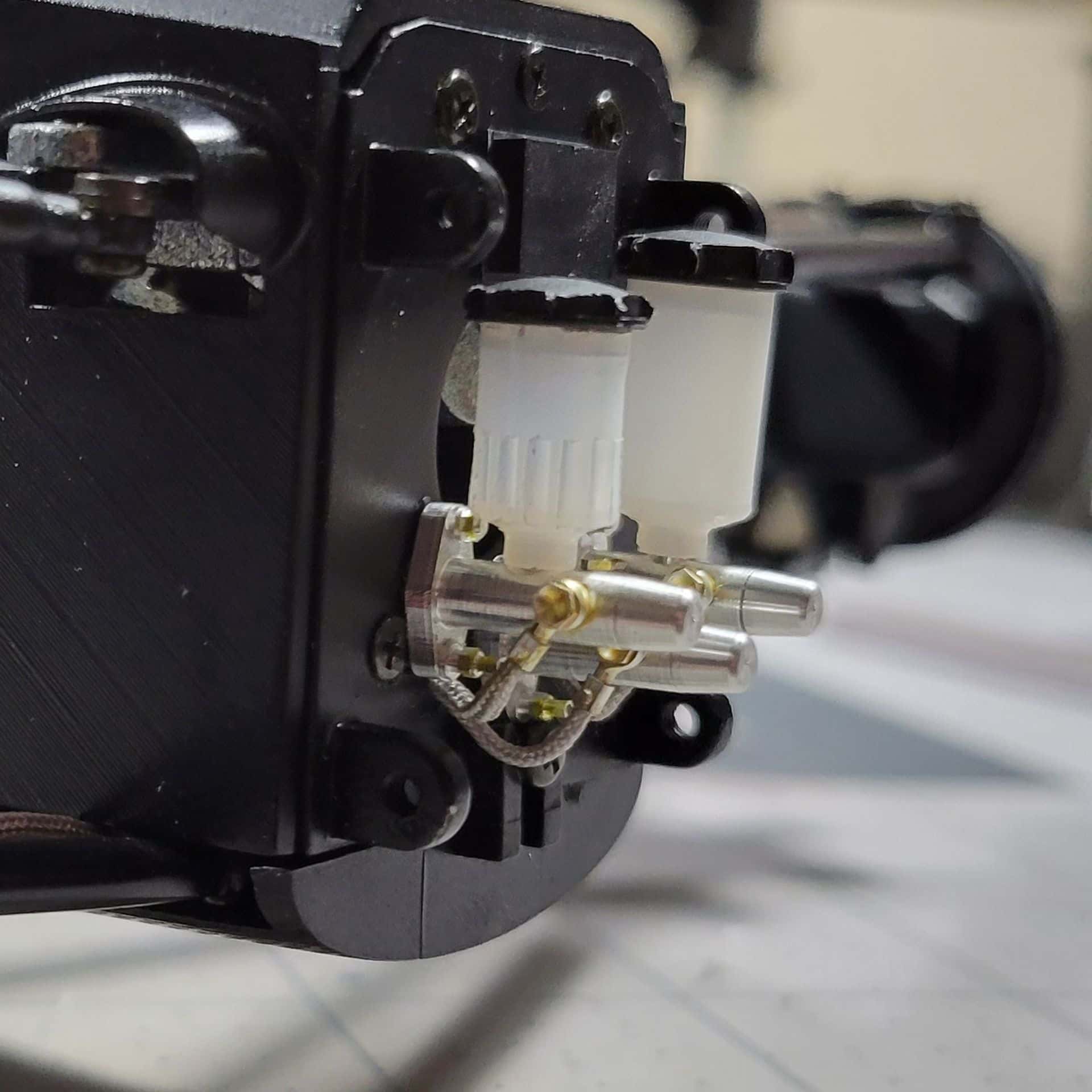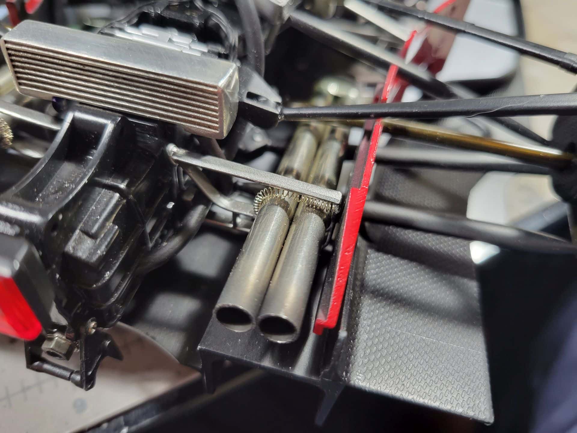My build includes Rosso's own detail set that they offered when the kit was new, which includes photoetch, metal parts, decals, and various other materials to add some detail. I also used quite a bit of Formula Perfect's parts including shocks, wheels, fuel injectors, engine parts, and a lot more. Scratched parts were also used and various other materials from companies like Anyz such as the braided line used for the brake lines. Electrical wiring was added where appropriate.
