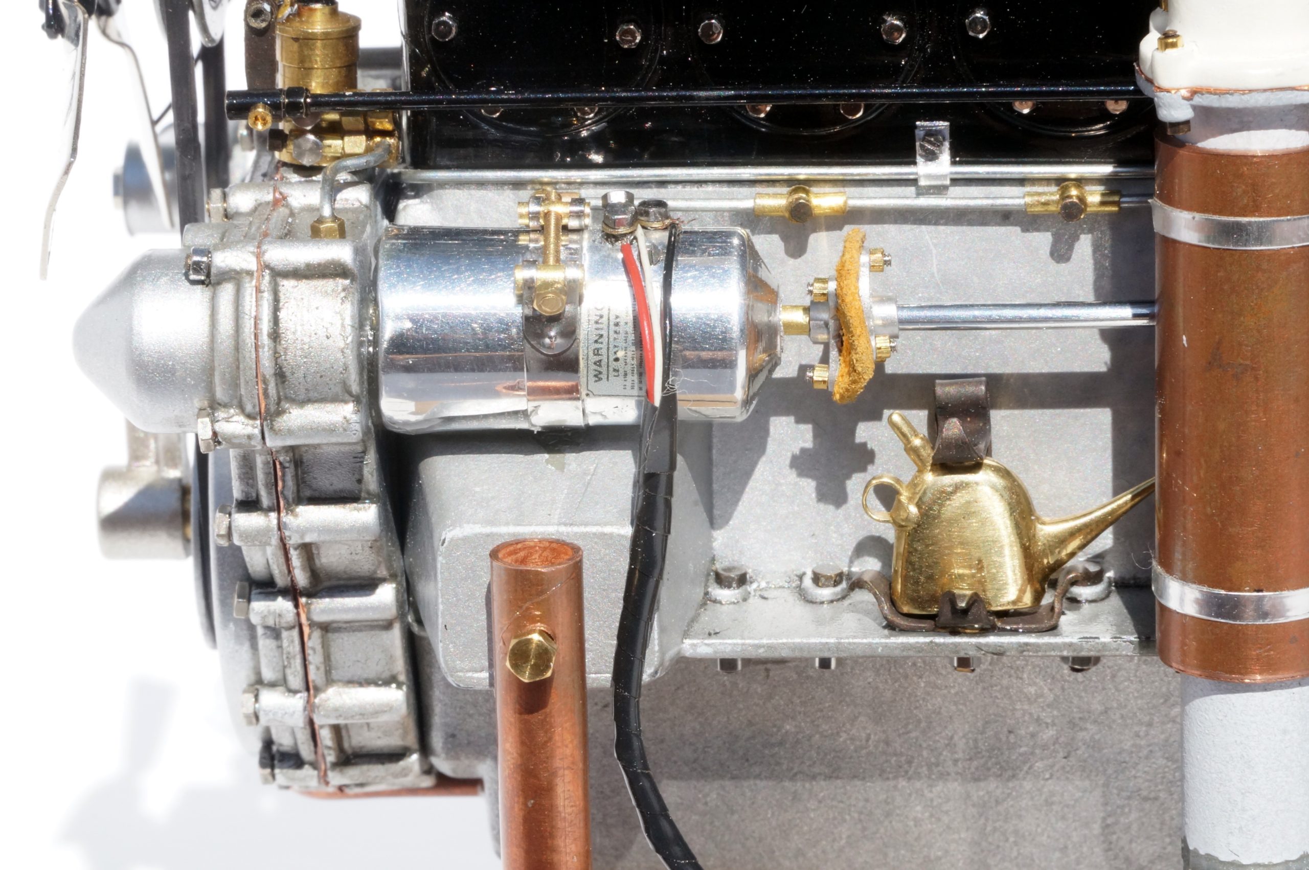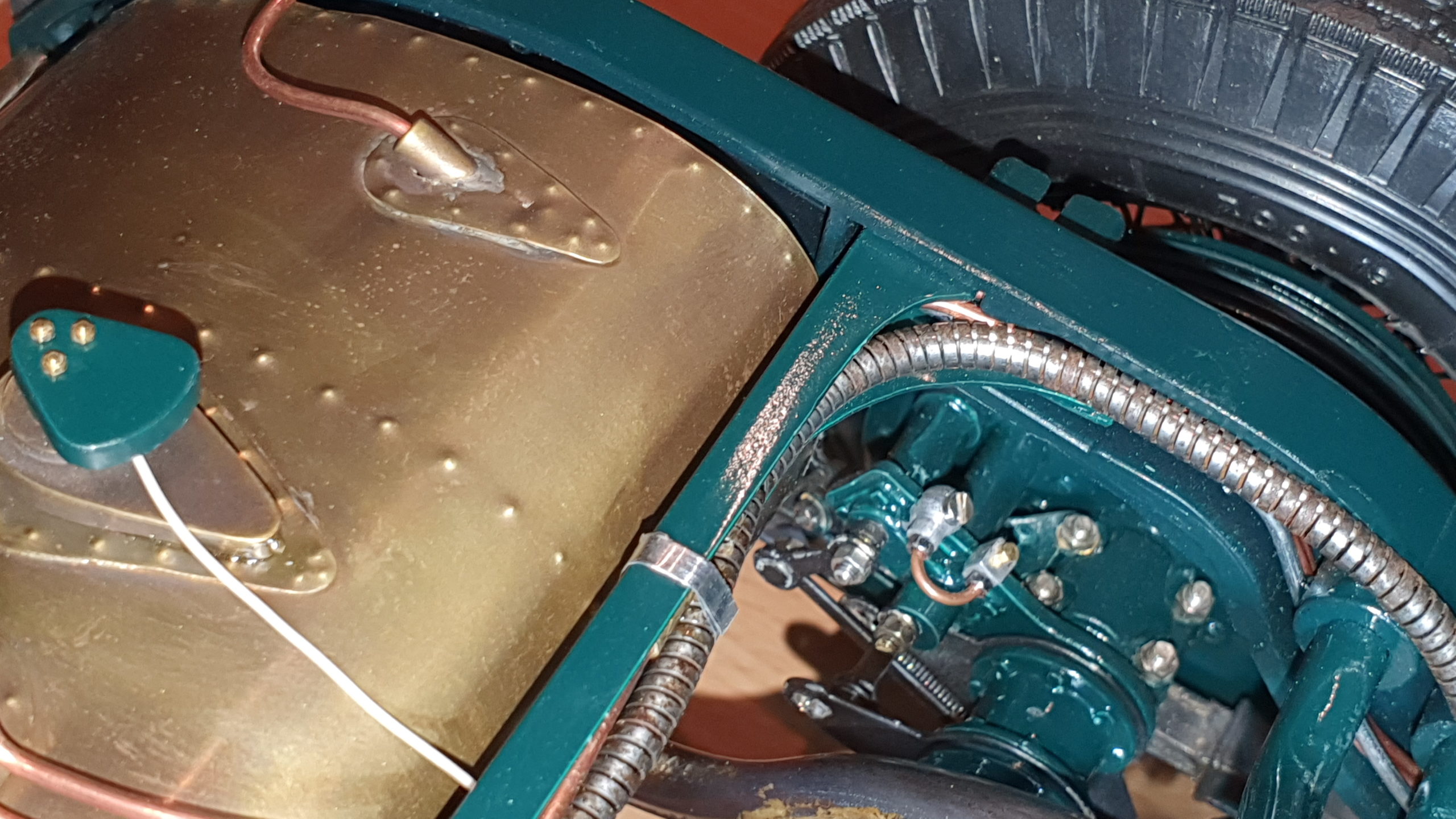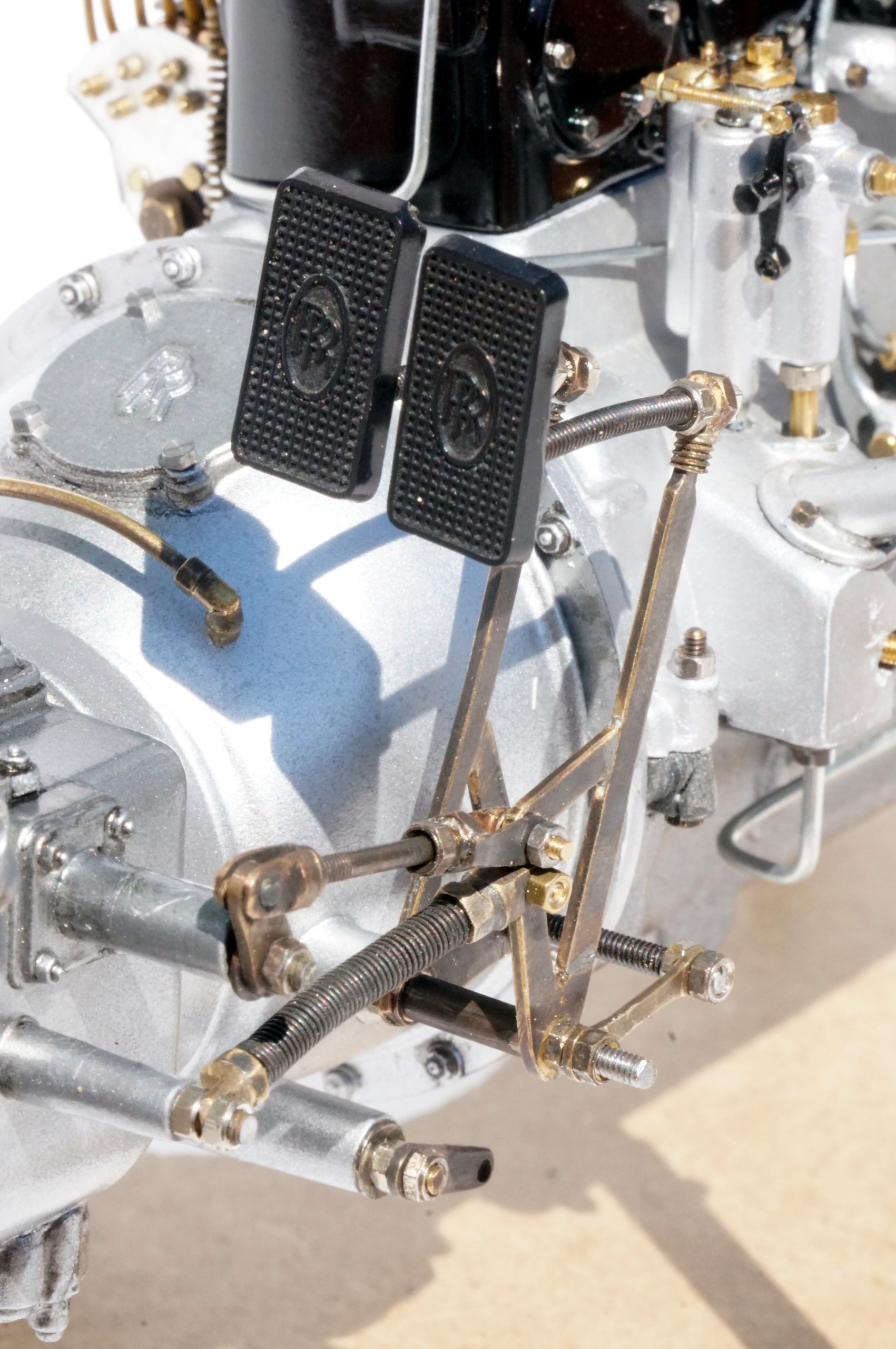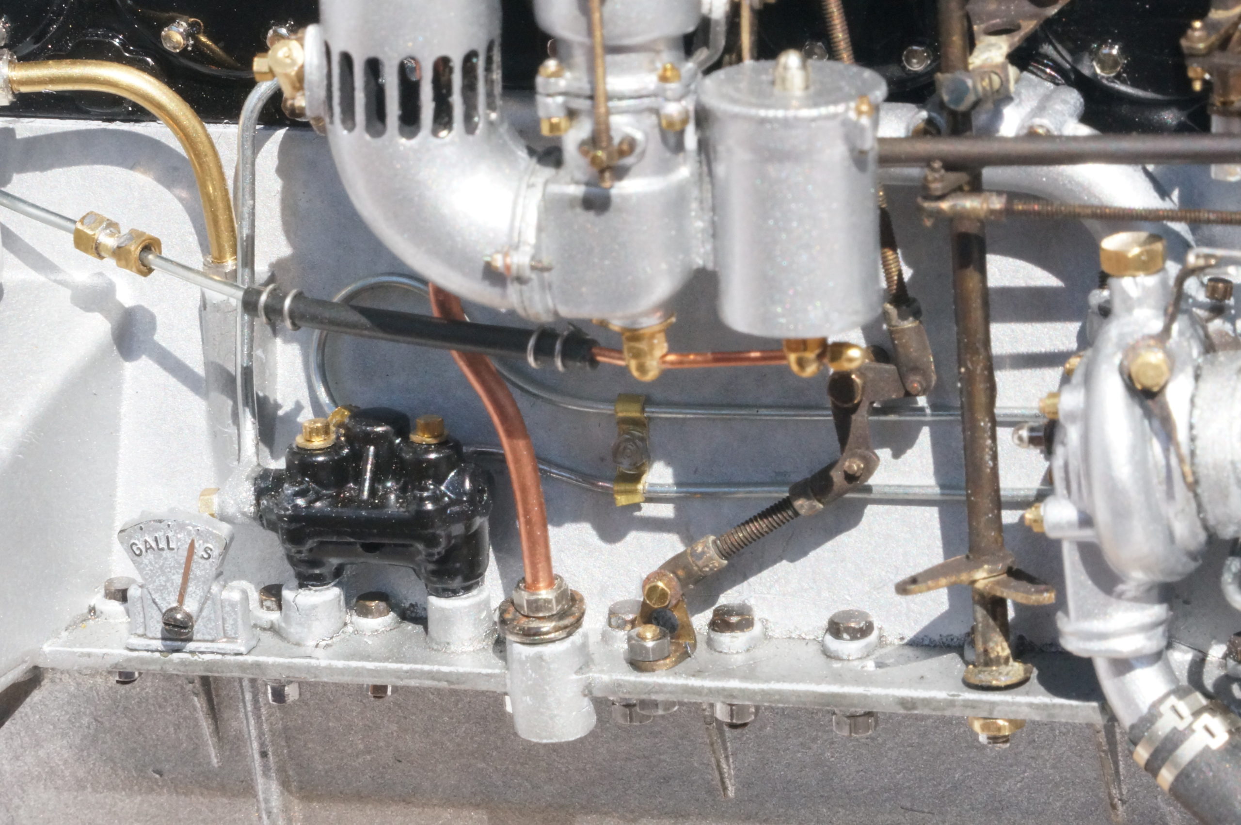 The process of slowing down and concentrating on each element as if it were a separate model works to assure an impressive outcome, but in this case, Christian Hey has begged the question, why would anyone want to cover up this chassis with a body? This question has probably been asked by nearly every Pocher builder, but in this case, we have proof that each element was scrutinized for accuracy and artistry. By using the natural colors of the materials-copper, brass, steel, wood-details which might have been invisible are accented and the builder's skills accentuated. The artistry of the Rolls-Royce designers, which is usually obscured by black enamel paint, is high-lighted and made into a narrative. The chassis has become a teaching tool which illustrates and animates the Rolls-Royce design.