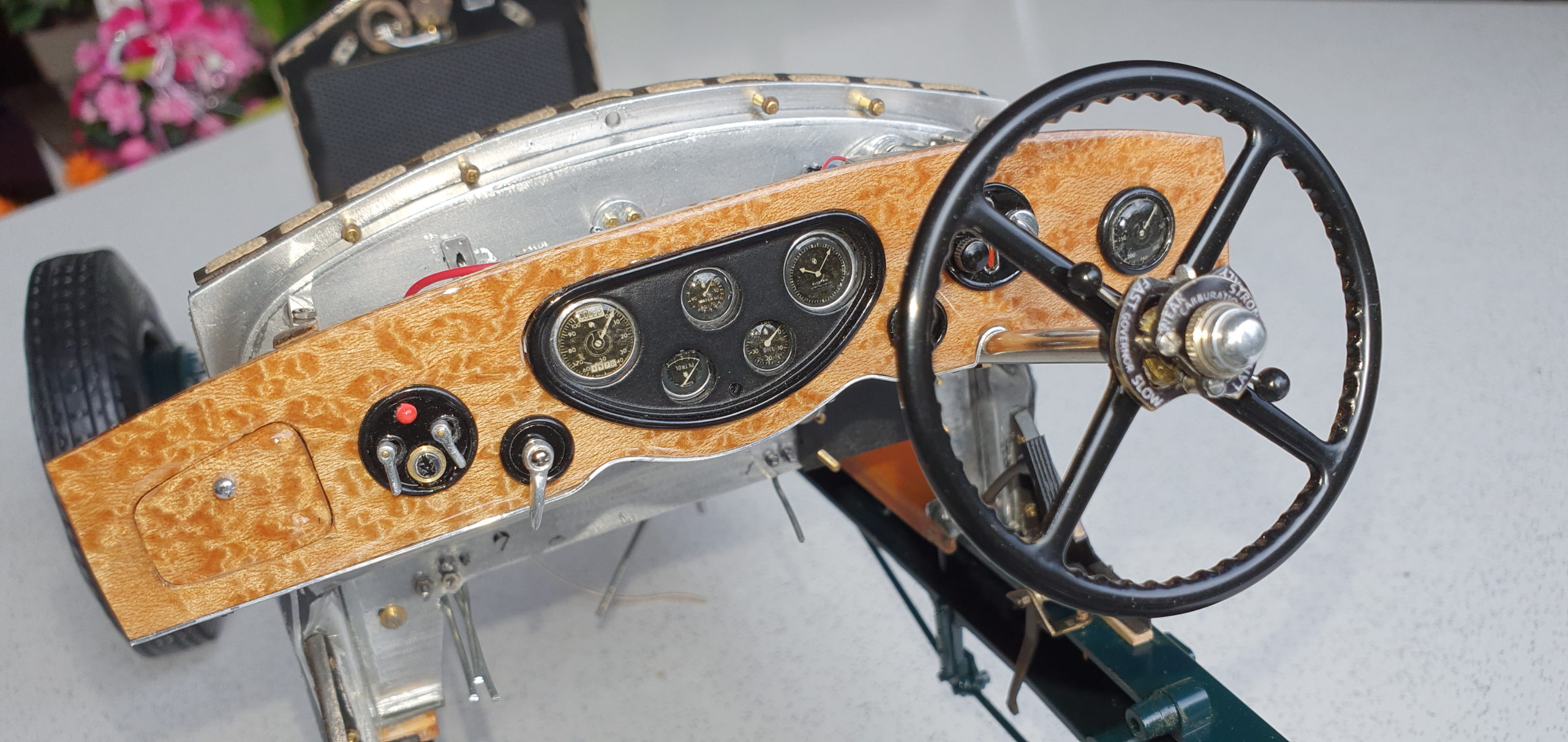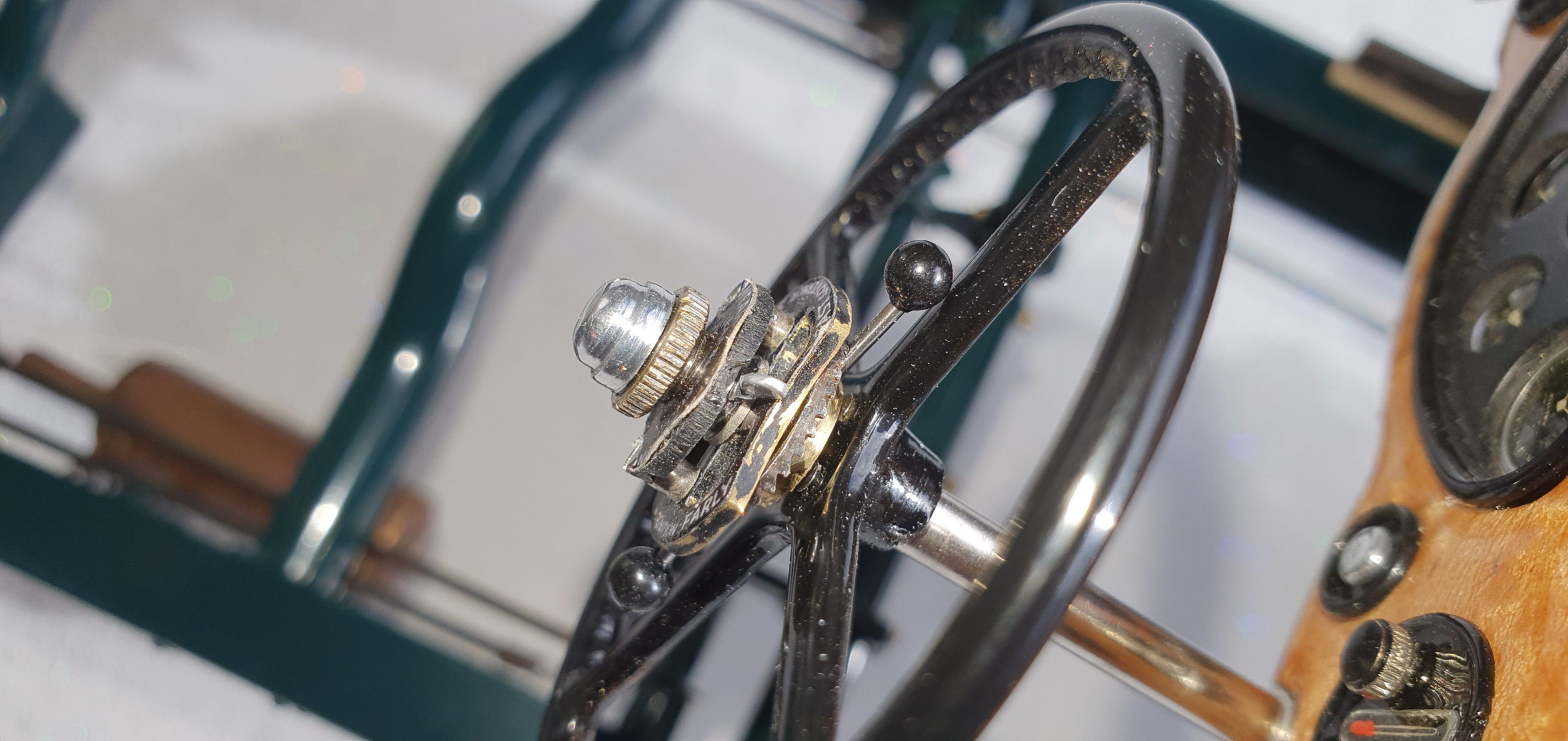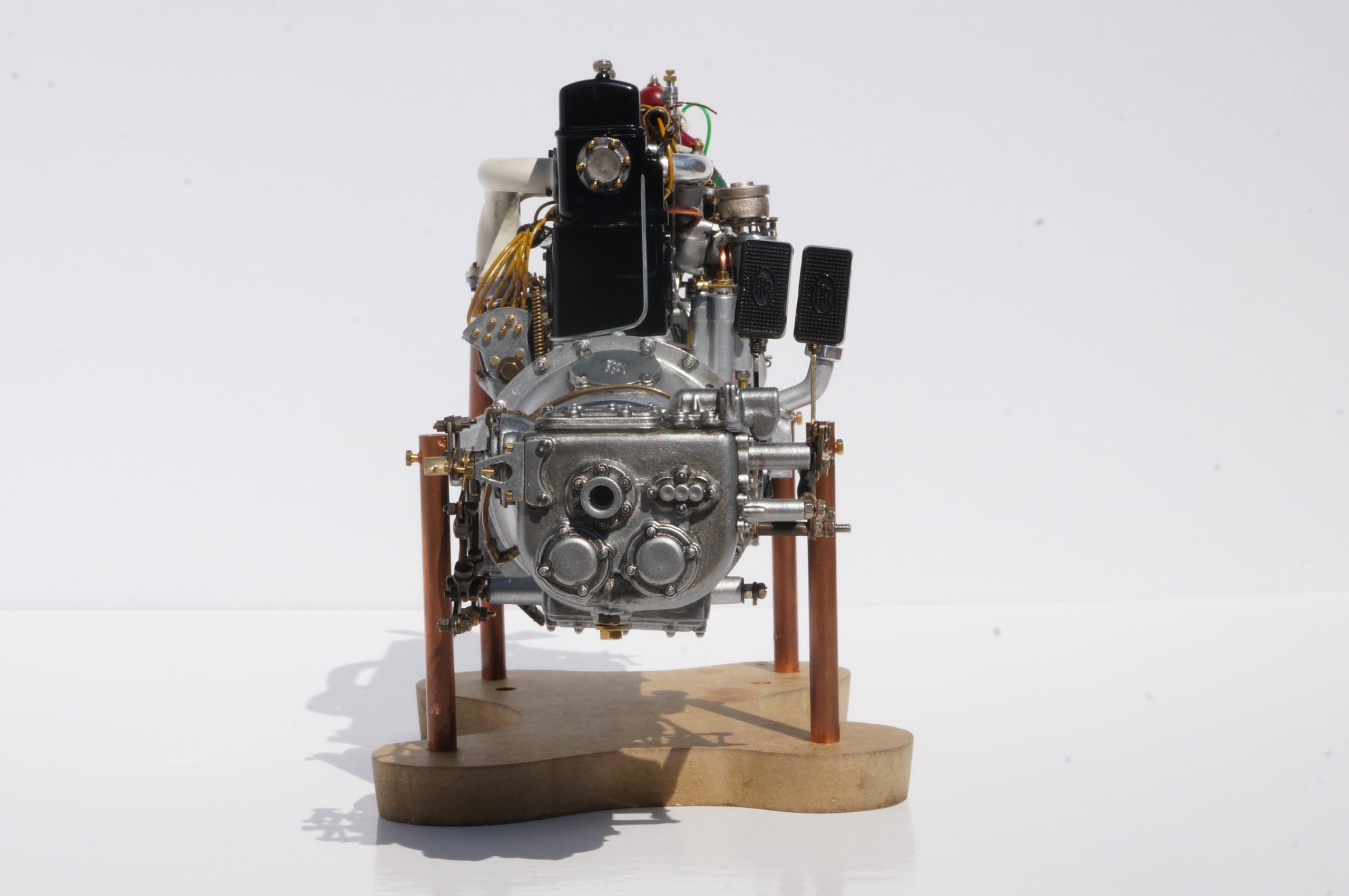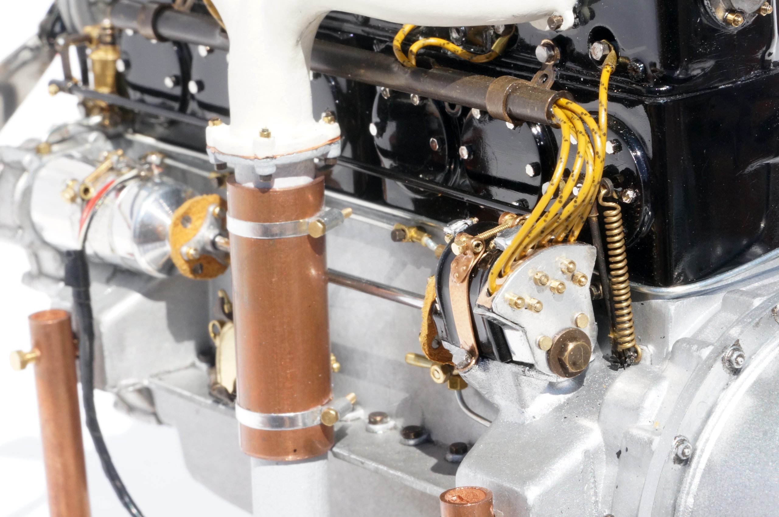 The process of slowing down and concentrating on each element as if it were a separate model works to assure an impressive outcome, but in this case, Christian Hey has begged the question, why would anyone want to cover up this chassis with a body? This question has probably been asked by nearly every Pocher builder, but in this case, we have proof that each element was scrutinized for accuracy and artistry. By using the natural colors of the materials-copper, brass, steel, wood-details which might have been invisible are accented and the builder's skills accentuated. The artistry of the Rolls-Royce designers, which is usually obscured by black enamel paint, is high-lighted and made into a narrative. The chassis has become a teaching tool which illustrates and animates the Rolls-Royce design.