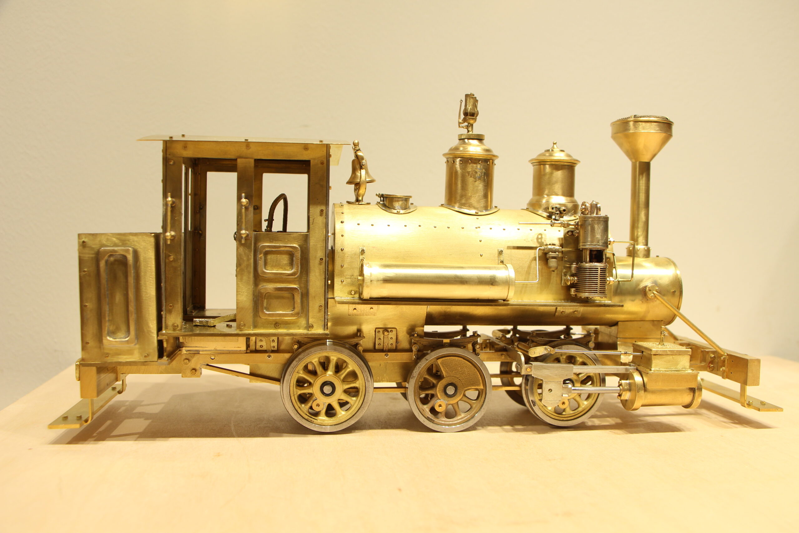 The only commercial parts used in this model are inside of the cab, valves, levers, gauges & bell. The wheels castings are also a commercial product. The tires for the wheels were made by a friend for the engine. The air pump is a prototype piece made by someone else.