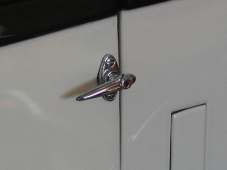Once your doors are painted, you must re-drill the holes to eliminate build-up and glue the bases to the exterior. To avoid messing up a wonderful finish, we used a toothpick to guide and hold the bases while the glue dried up. Below you will see some pictures of the finished installation. Although several steps are required to fit the handle system, the results are spectacular and 100% accurate to the prototype. We hope you enjoy this challenging but fun process!