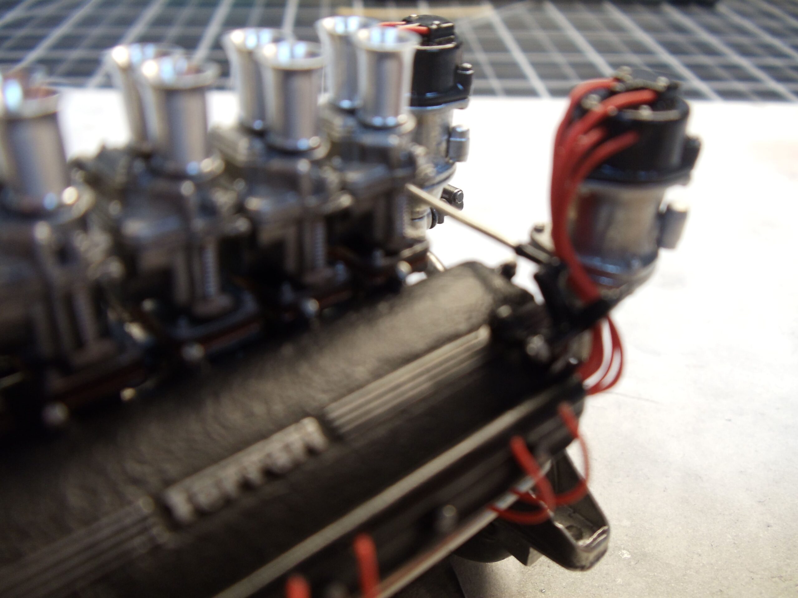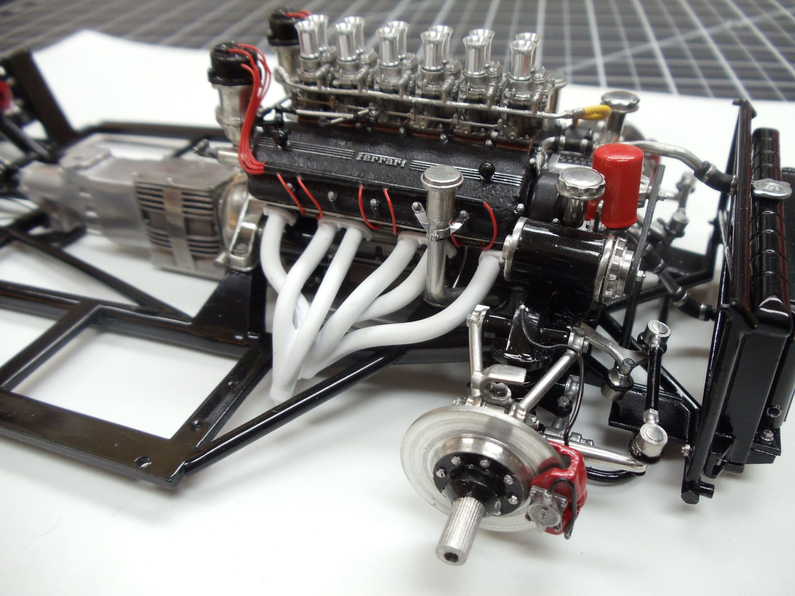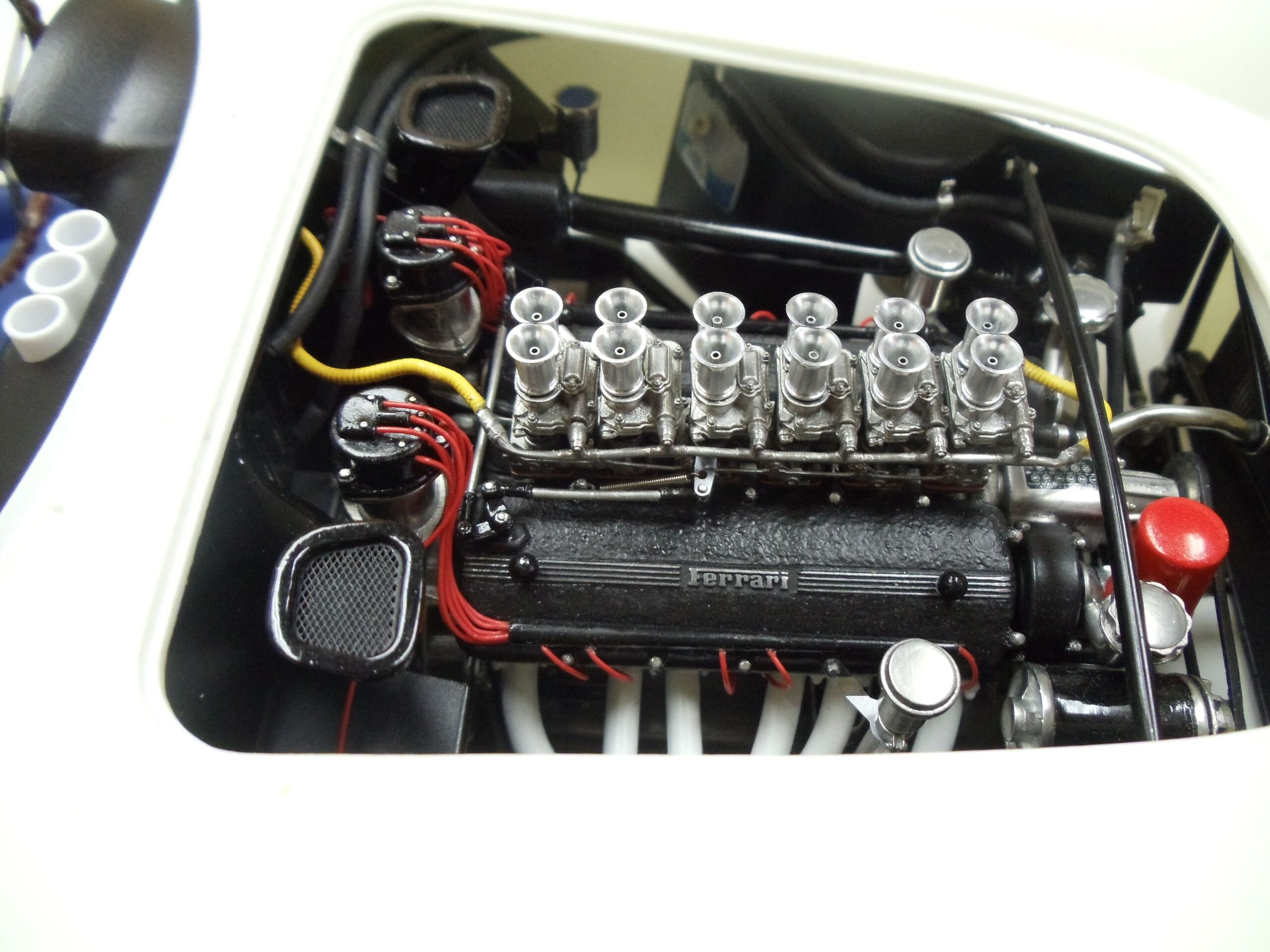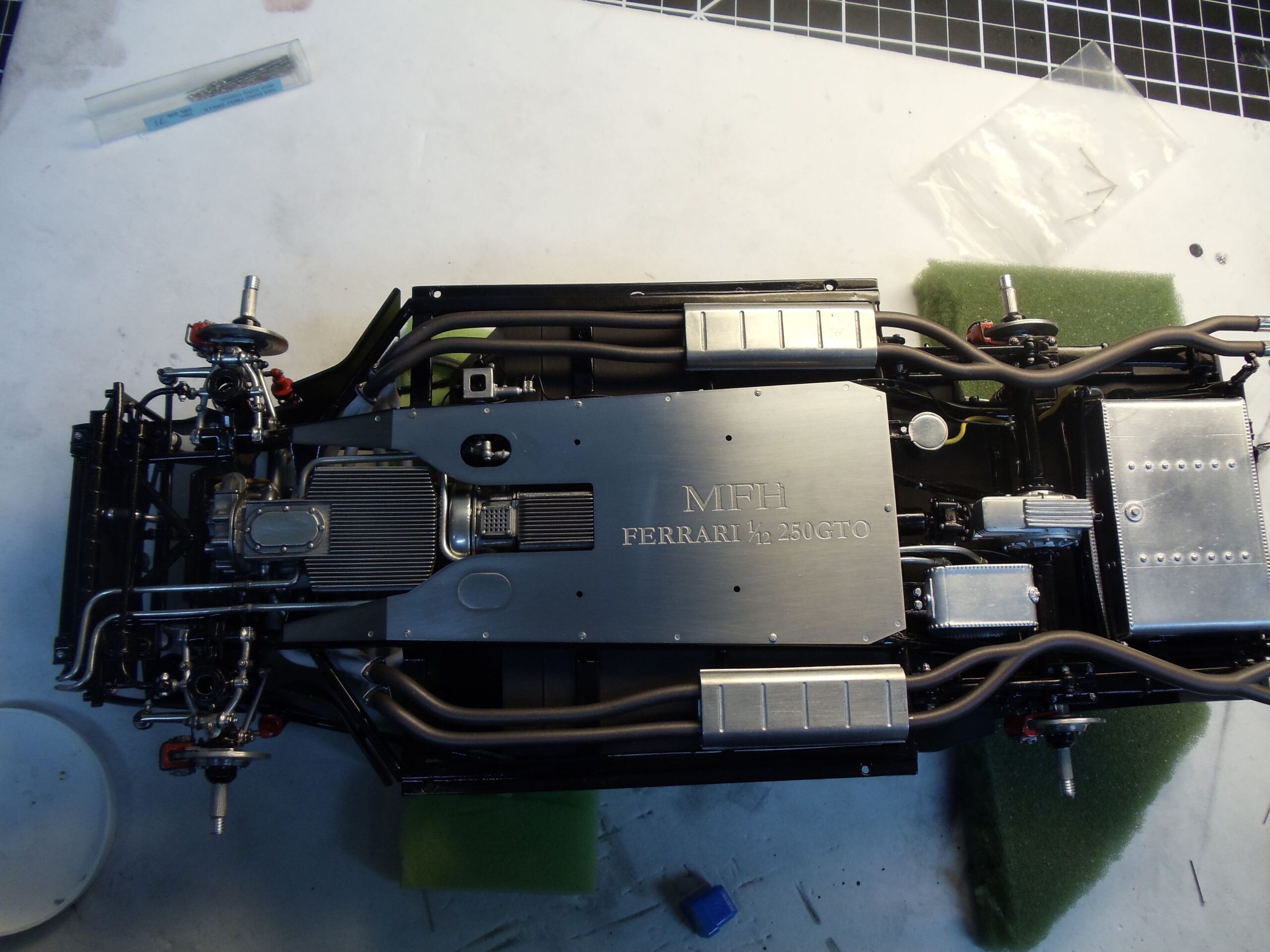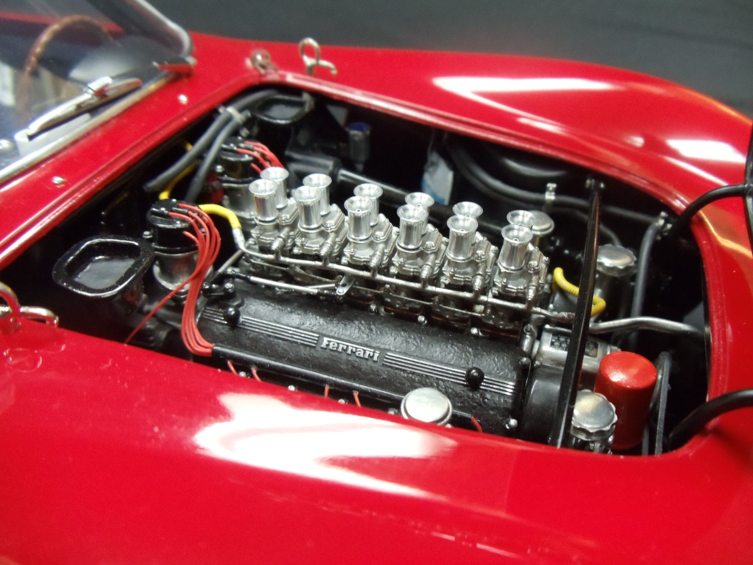 I cannot say enough great things about the MFH Ferrari 250 GTO kit, it is truly amazing. The parts fit is excellent and it can in fact be built without scratch building anything but it is not without it’s challenges. Most of the parts are cast white metal that need to be cleaned and mold lines removed as well as polished if you want to use them without paint. Unfortunately the parts come in bags without part numbers so they needed to be sorted by appearance only. Considering that there are hundreds of parts sorting them is a task. I located the parts for each step and bagged them marking each bag with the step number. I spent a lot of time just preparing parts but when I finally started construction the real pleasure of the MFH kit started showing through. There is nothing in model building that is more satisfying than assembling an engine that when you turn the flywheel all the pistons move along with all the timing gears and rocker arms. Although the internal parts of the Ferrari engine will never be seen again it was worth the hours of construction to see the entire engine function. The remainder of the kit was just as detailed even including the linkage from the gas pedal to the carburetors.