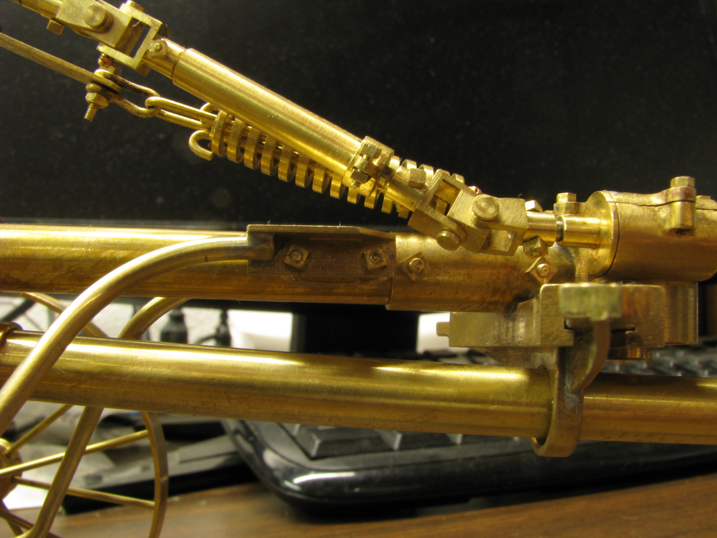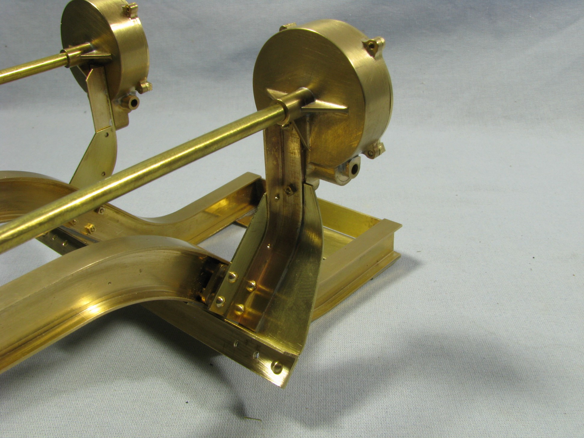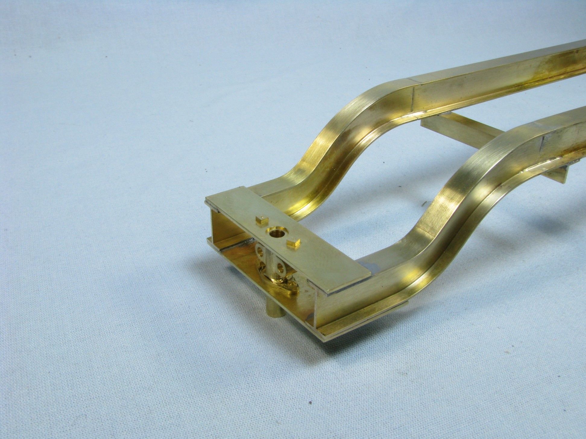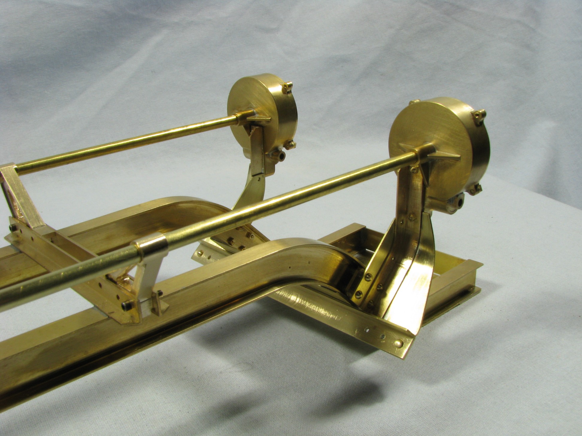 The model started with the frame rails which had to be made in 2 pieces due to the length requirements. After machining they were fixtured and silver soldered together. To locate the many holes on the frame templates were cut from prints of the drawings and then marked on the rails for drilling or tapping. As the building progressed the thought process had to be two steps ahead because a lot of the parts were soldered together and adding adjacent parts could undo what was already put together.