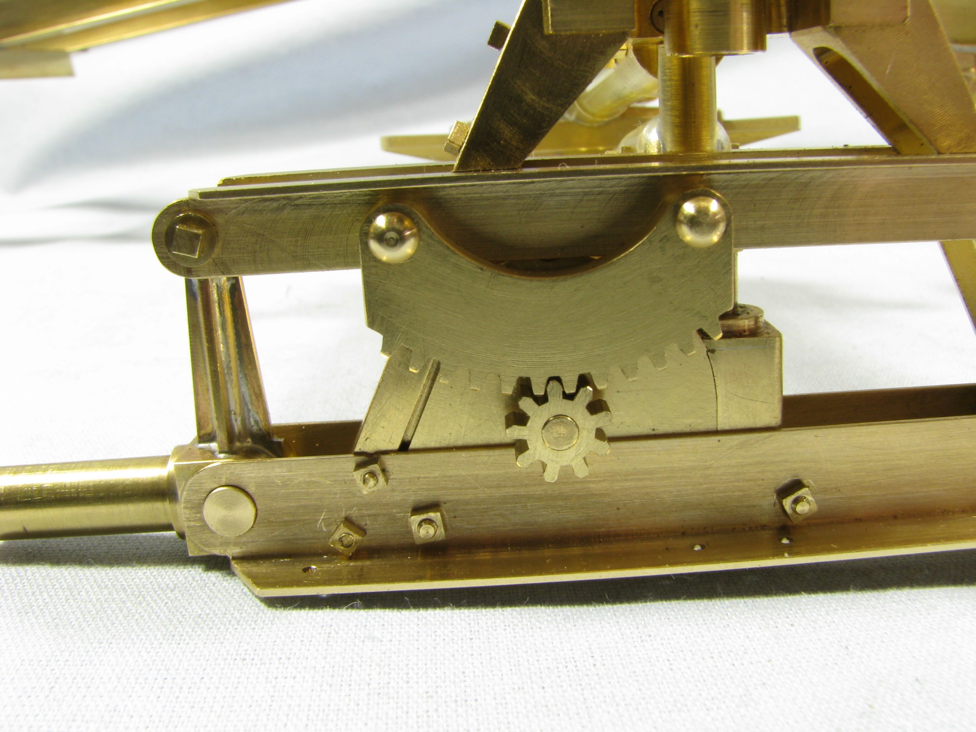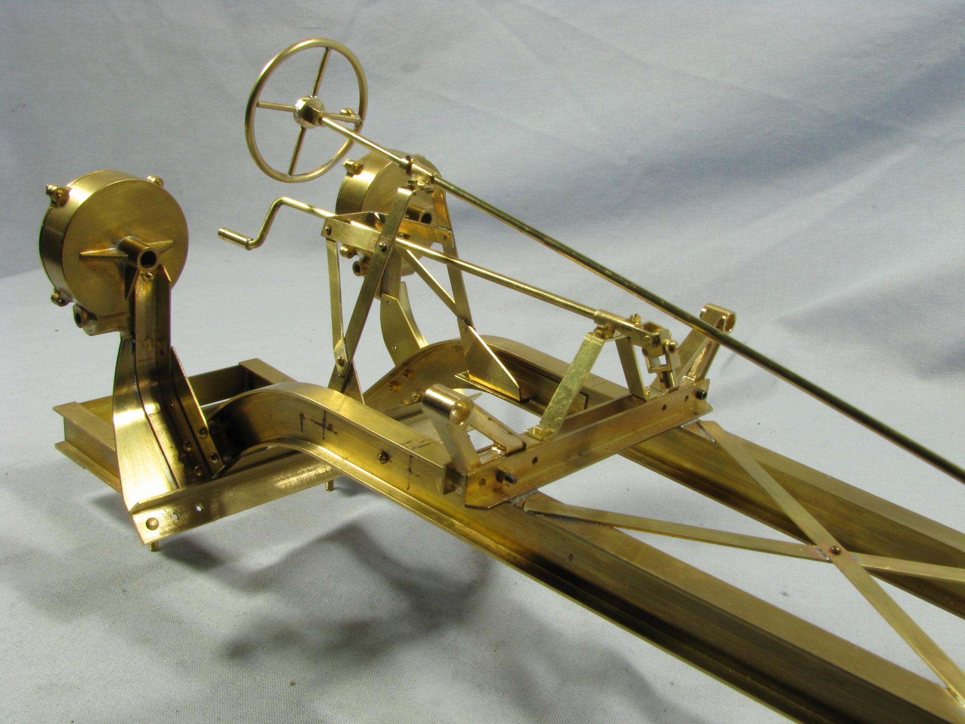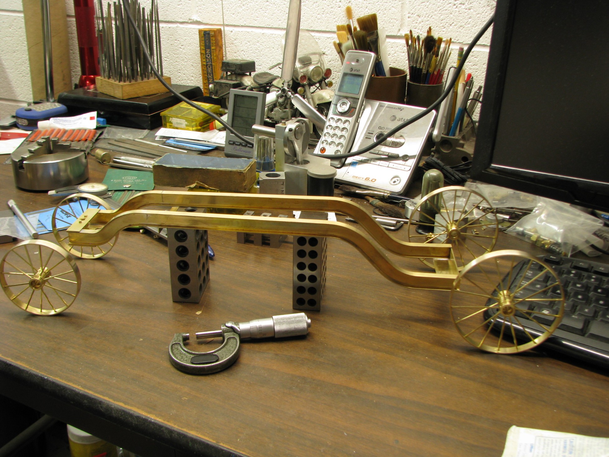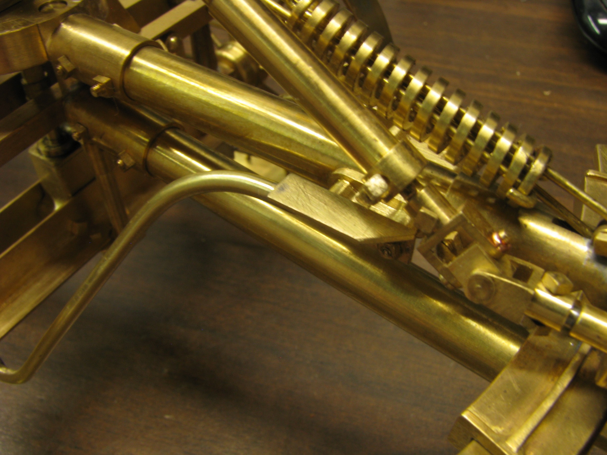 The model started with the frame rails which had to be made in 2 pieces due to the length requirements. After machining they were fixtured and silver soldered together. To locate the many holes on the frame templates were cut from prints of the drawings and then marked on the rails for drilling or tapping. As the building progressed the thought process had to be two steps ahead because a lot of the parts were soldered together and adding adjacent parts could undo what was already put together.