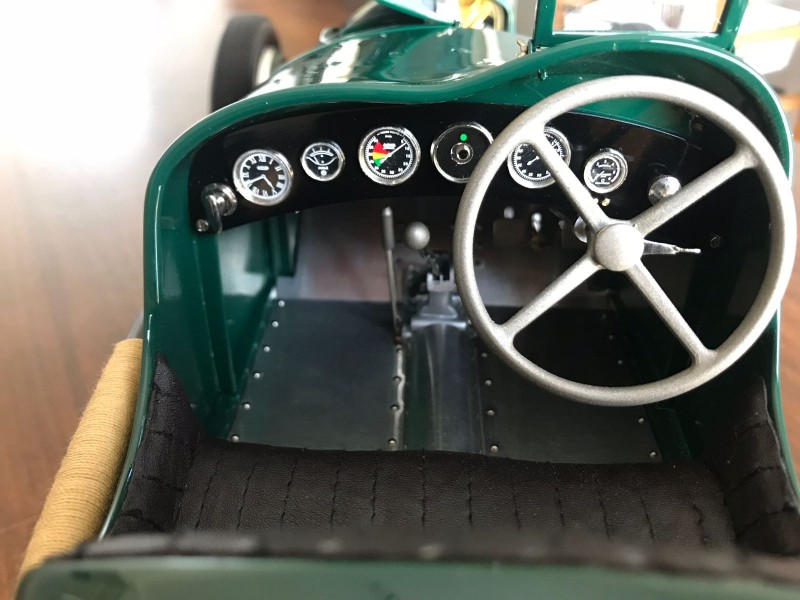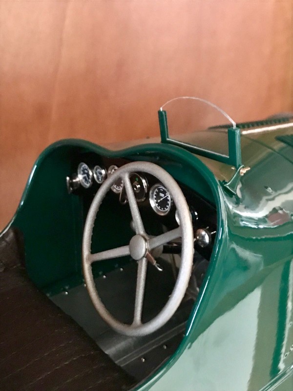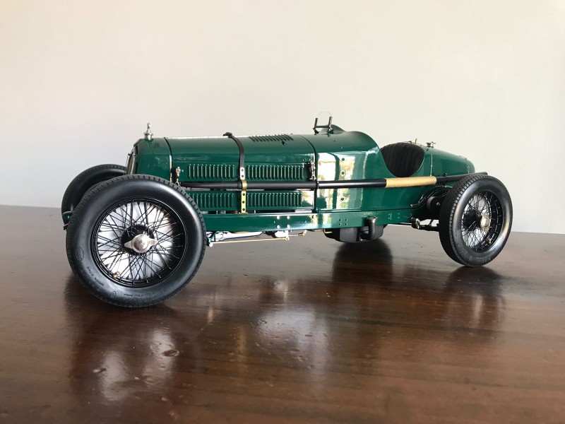 The choice of dark green paint invites a narrative involving British races and a British driver, and one easily can picture the car pounding around Brooklands or skimming the walls at the Isle of Man. The ubiquitous black wire wheels are just the right touch to add familiarity and realism, and the model calls out for a 1:8 scale Blower Bentley to offer proof of its compact dimensions. It is as if Gianolio knows what makes this car such an icon.
