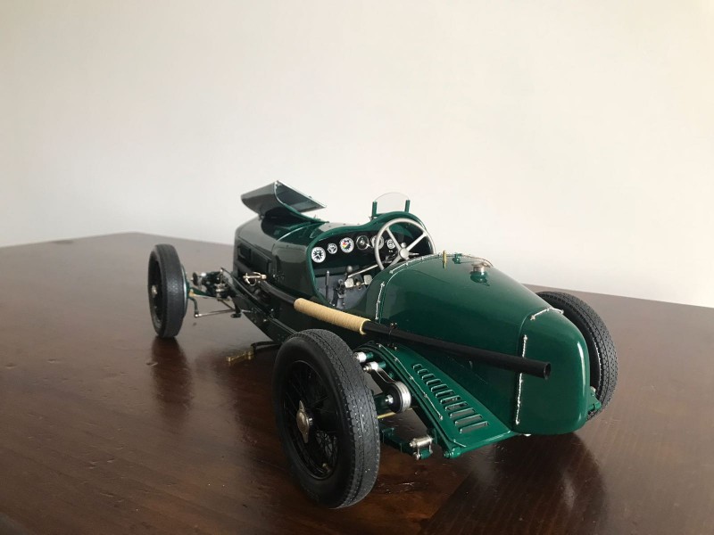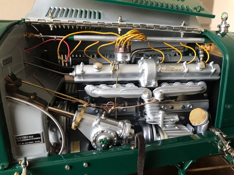 It has to be said that the star of the show is the selection of such wonderful finishes-flawless and shiny green on the body, perfectly done black enamel on the wheels, and the finishes on the engine and under the hoods-all contribute to a formidable expression of what a Pocher Corsa can be. Perhaps there is something special in the Italian air that so effectively transfers the spirit of Alfa Romeo. All in all, seeing this model is a charming holiday gift for all of us.