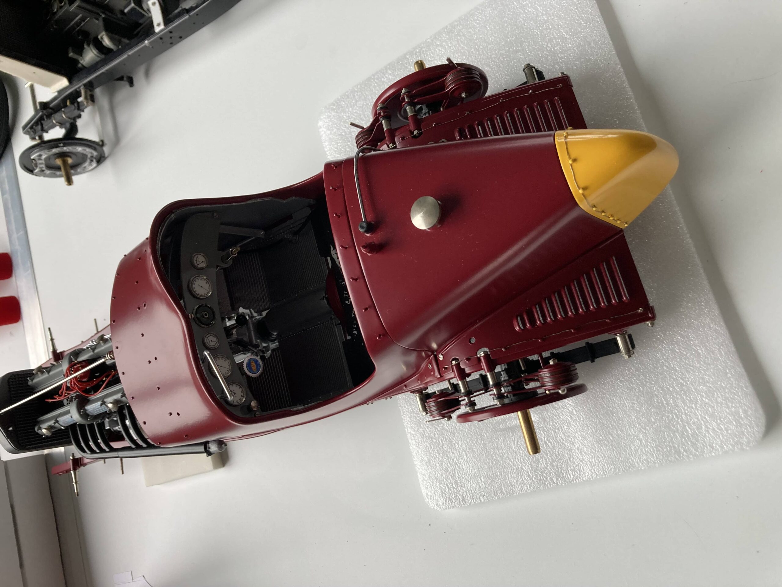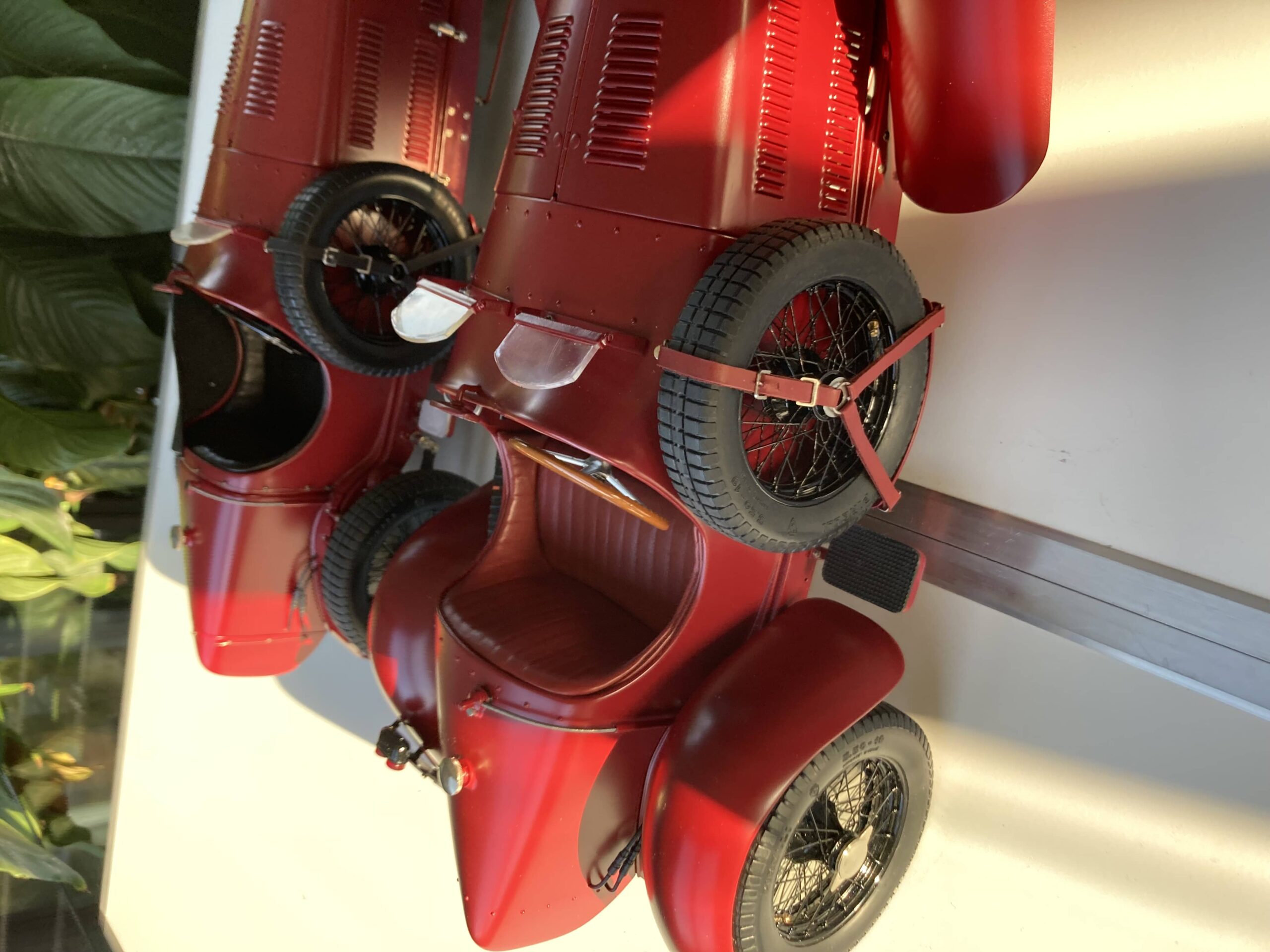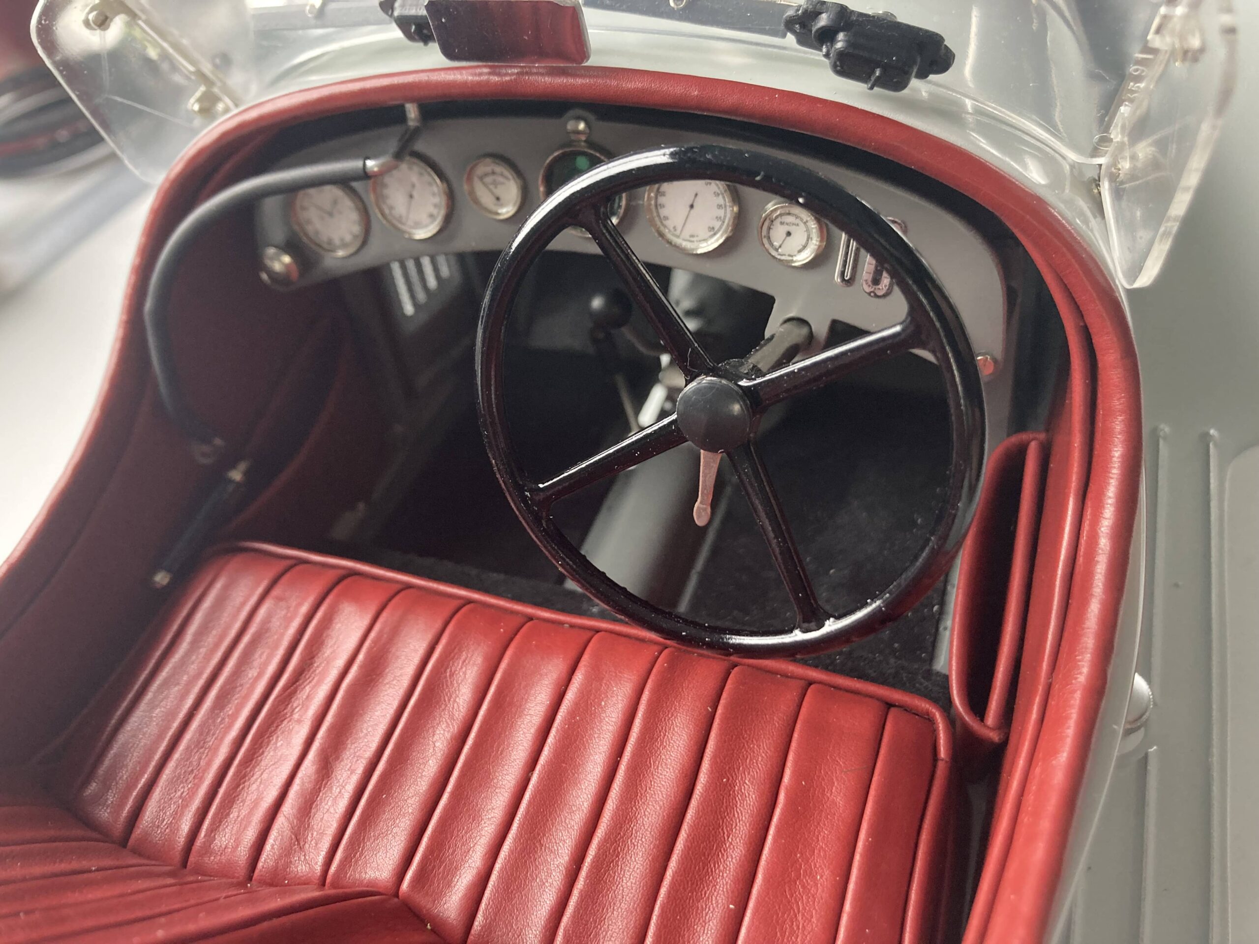 The pair of Monzas are particularly interesting in that they provide a study in subtle variations. One car sports bobbed fenders from a spider which are a surprising compliment to the boat- tail Corsa body, and both cars have side-mounted spare wheel. The open-wheeled Corsa version looks as if it has been lifted straight out of a historic Monaco race, and both cars capture the look of well-kept racers. Small details are everywhere, and viewers can be forgiven if they forget they are examining models and not the full-size cars. From the straps retaining the spare wheels (different colors for each car) to the vents on the fuel fillers and the two versions of step plates, these models make a handsome and compelling pair. The Pocher Alfas may have been a challenge to build, but there is no sign of struggle in these two. They look as if you could climb in and drive them away.