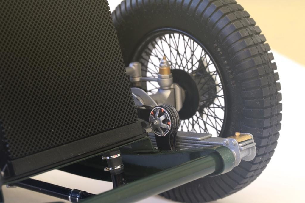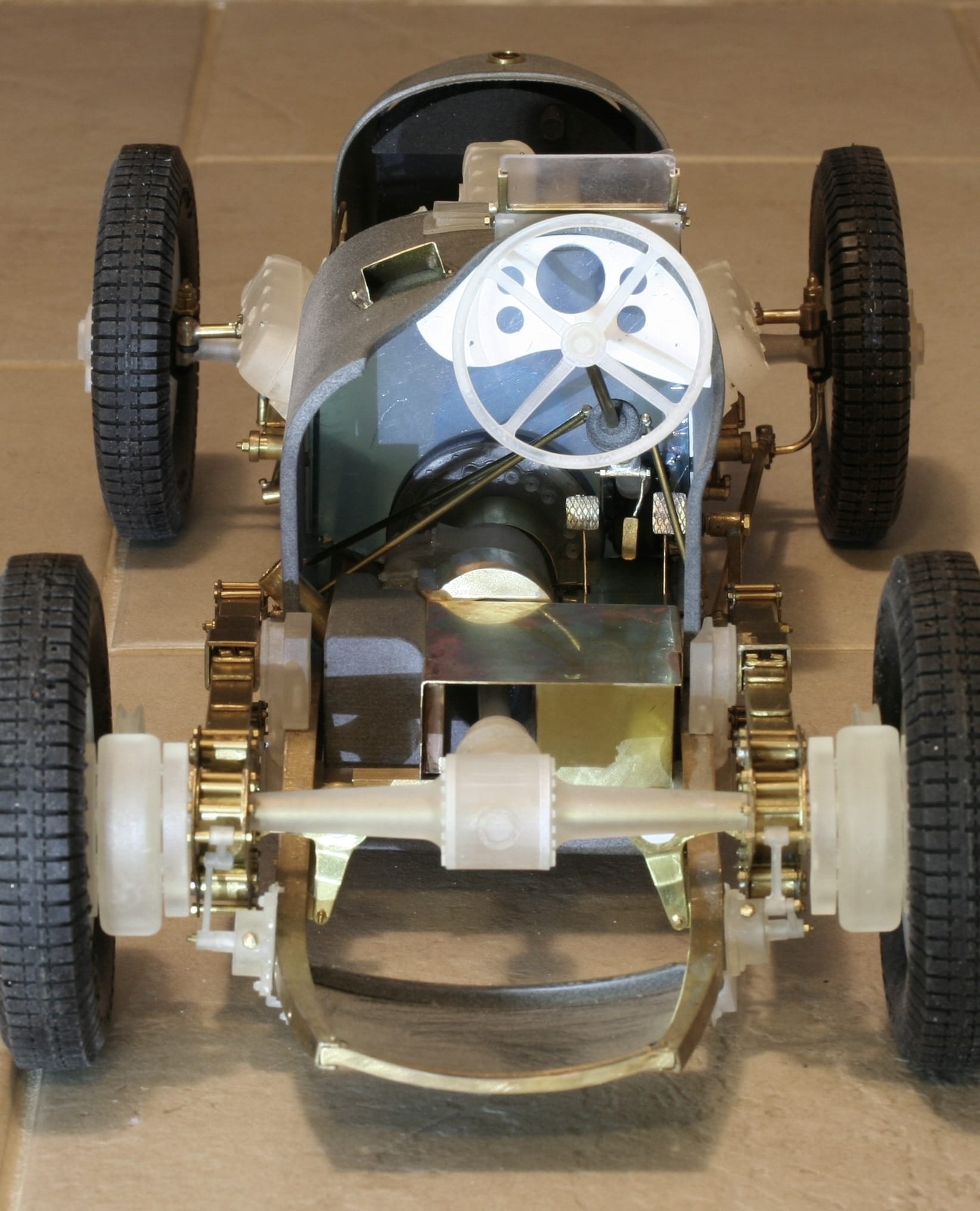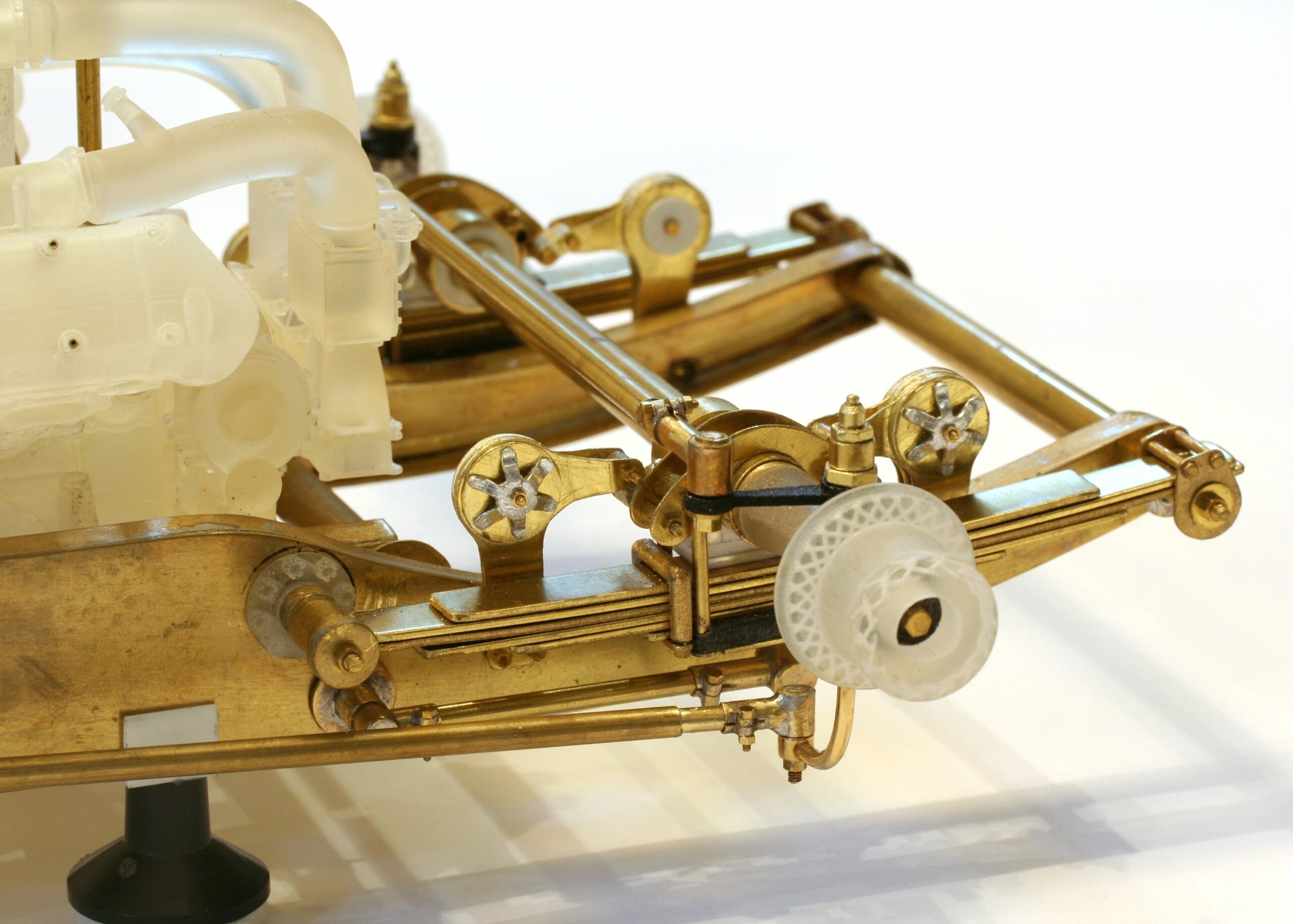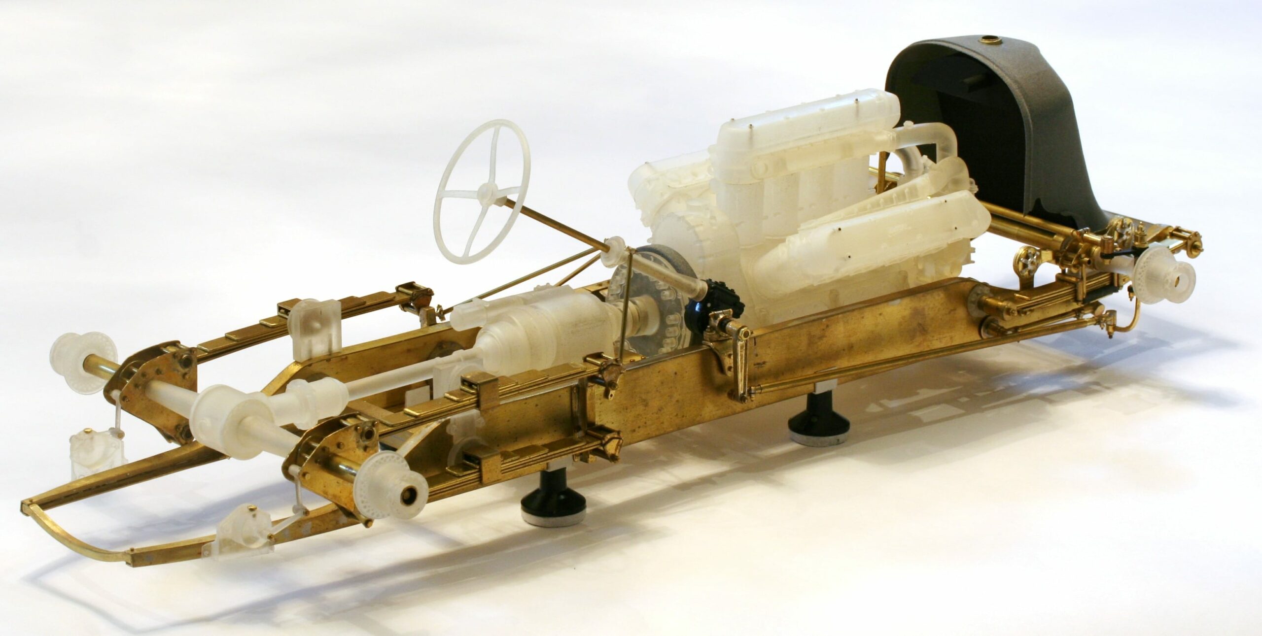 The chassis is largely of brass construction but the engine, drivetrain and radiator assembly are largely built from 3D printed acrylic parts. The body panels were also 3D printed, in 0.8mm thick nylon, since my skills in brass forming would not be up to the task.