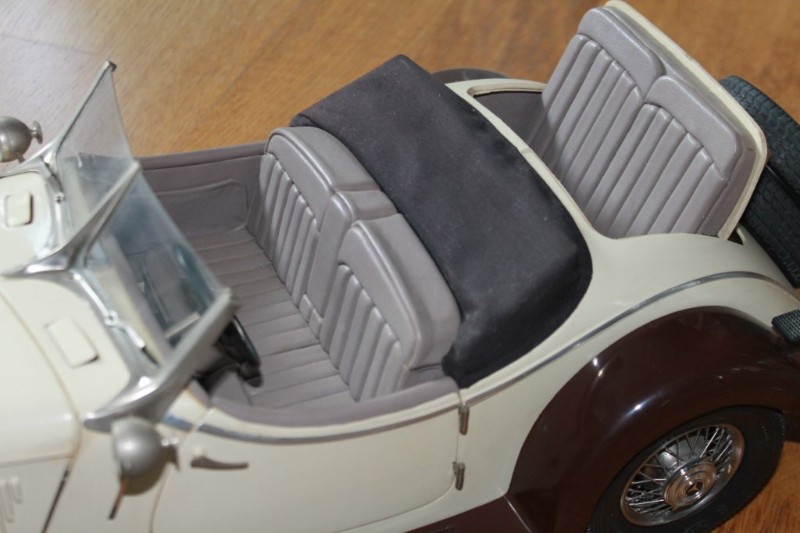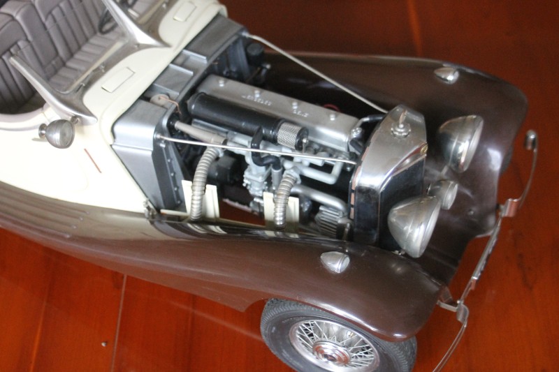 Examination of the engine compartment reveals a neat and accurate job that makes the most of the Pocher design. The same can be said of the chassis and running gear, all of which reveals workman-like care in its assembly. The choice to retain the factory colors may simply have been a reluctance to go astray from the prototype, or it may have been based on nothing more than a vote for the appropriateness of the color scheme. Interestingly, the photos reveal something of a mystery, and careful examination of them show the struggle with the wire wheels-which may have been the central challenge of the model-but they show no evidence of the complicated upholstery work, suggesting to this viewer that the leather may have served as a motivation for the model but not its central challenge.