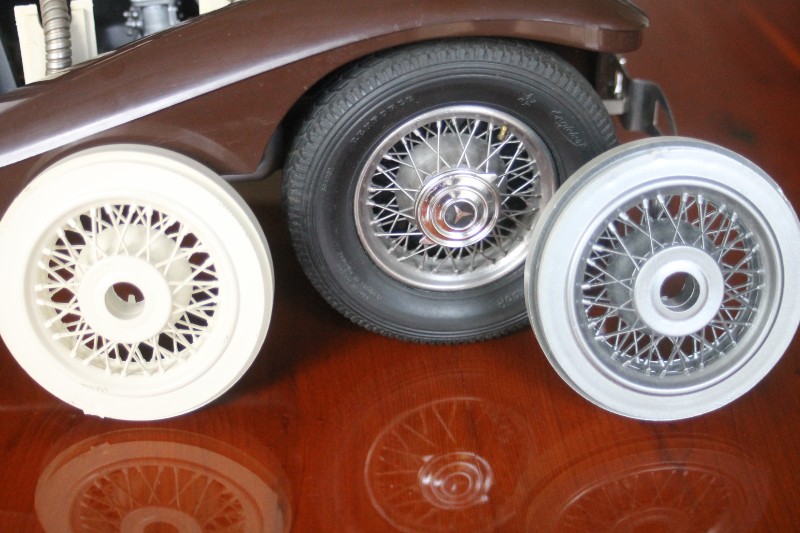 In addition to offering a starting point for speculations, the photos of Mr. Dungworth's Mercedes suggest another puzzle. The slight patina on the nickel trim and the traces of dust on the upper surfaces of the model stand in stark contrast with the bright and shiny underside and chassis. The fact that this model was clearly completed some time ago begs the question of whether the struggle with those wheels was one which required an extended period of recovery.
