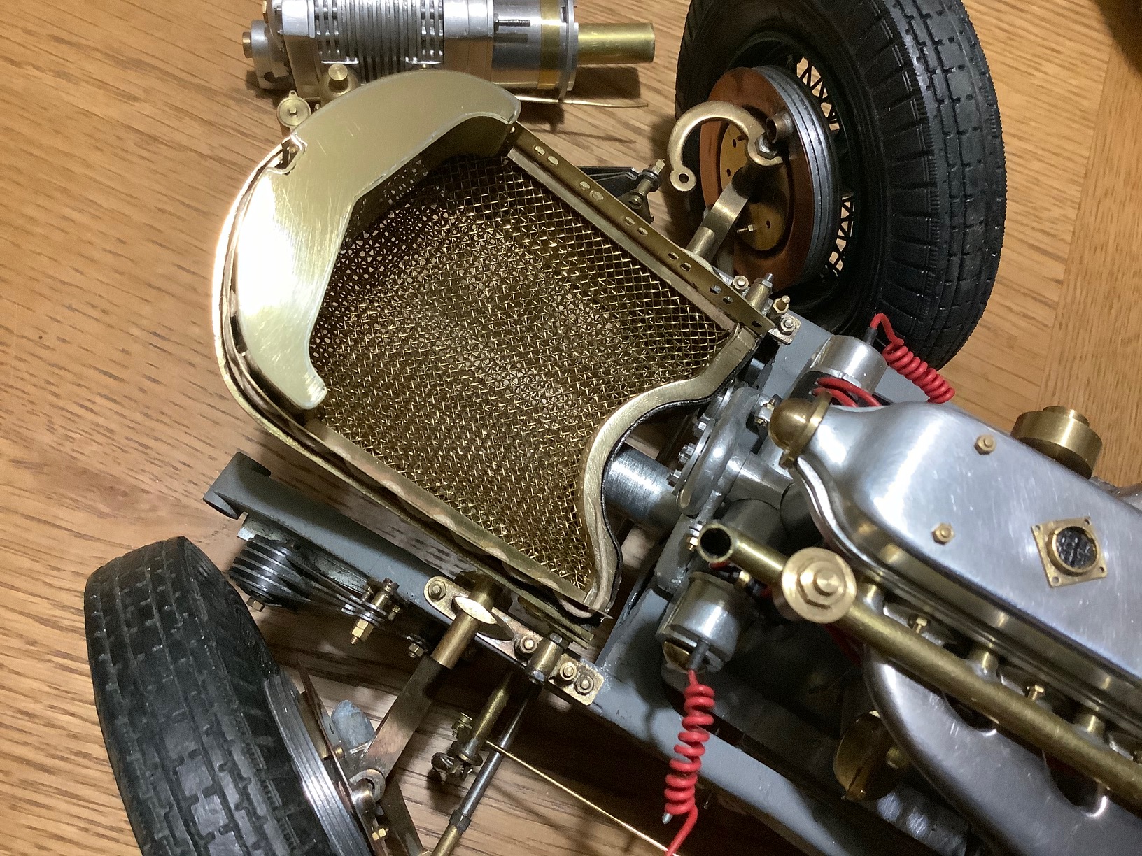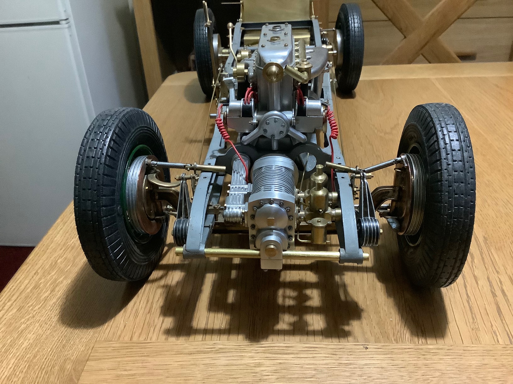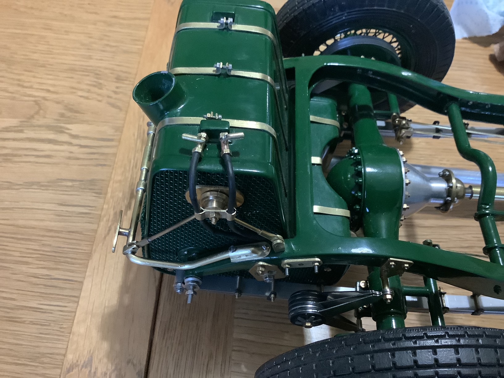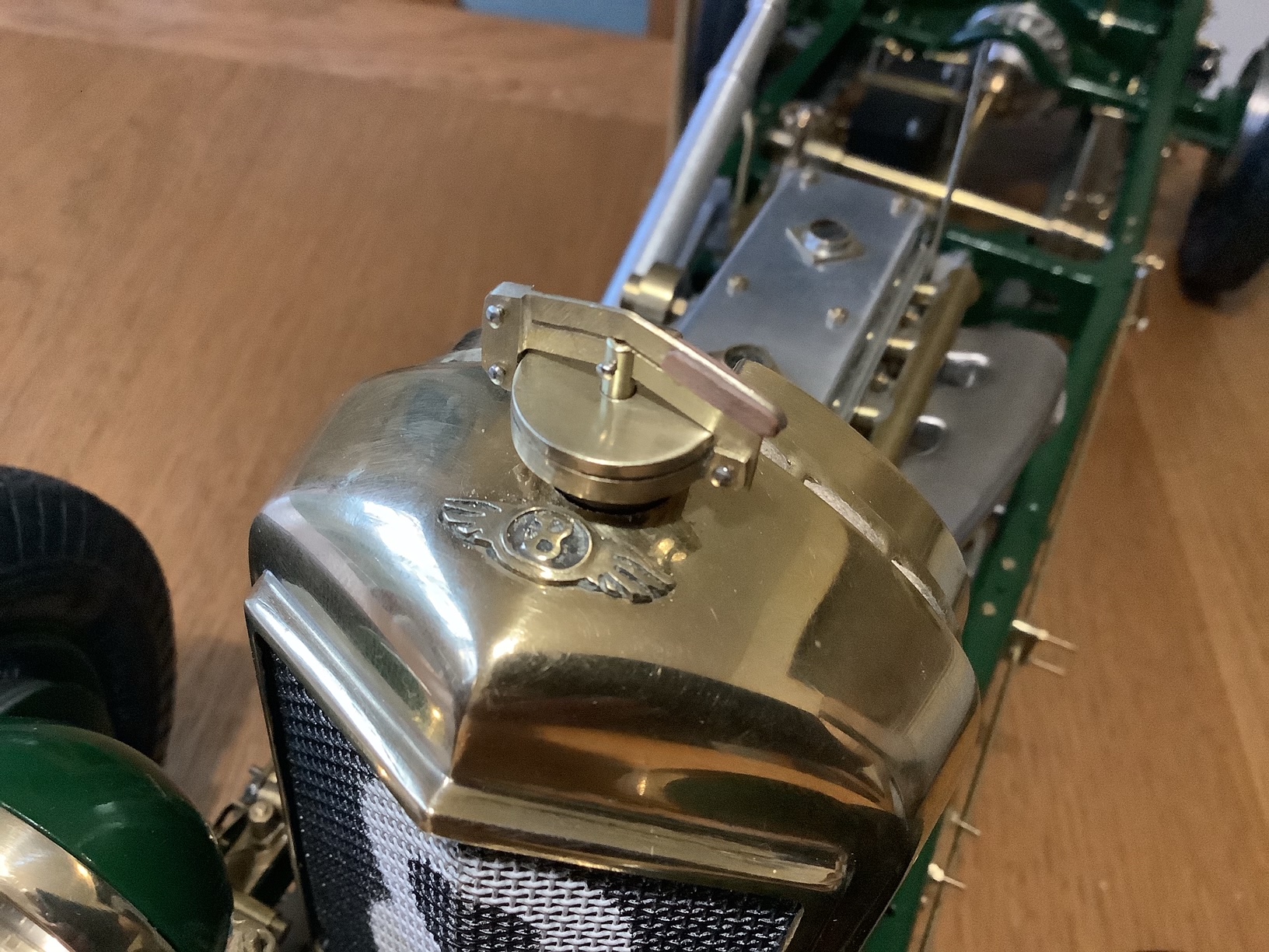 This is not a kit, I have made every part from scratch except the tyres, and they are Pocher Rolls Royce donated by Model Motorcars. I had no lathe or milling machine. The radiator was the first part I made, this is constructed from brass sheet and bar. A hardwood pattern was made first, I used this to make a cardboard template of the sides and top because the radiator tapers it couldn't be just a flat strip, more of a very flat "N" shape but with added flaps that would form the front sides. The cardboard template was transferred onto brass sheet, the front faces bent in and then curved into horseshoe shape, a square block was then silver soldered into the top and filed to give the correct profile, the flanges for the grille then added. The wheel rims were first turned in plaster of Paris molded in rubber, and cast in polyester resin, for the hubs a similar method, but the mold was made to incorporate pre-drilled brass strips bent and soldered into rings which would incorporate the spokes. The spokes themselves are long dressmakers pins, with the heads inside the hubs. Holes for the spokes in the rims were drilled from the inside with help from a pre-drilled template bent into a ring and placed inside the rim, short pieces of plastic wire insulation were slid onto each spoke after being passed through the holes in the hub, then down the spoke until they entered the hole in the rim, all this being done on a gig to keep everything central.