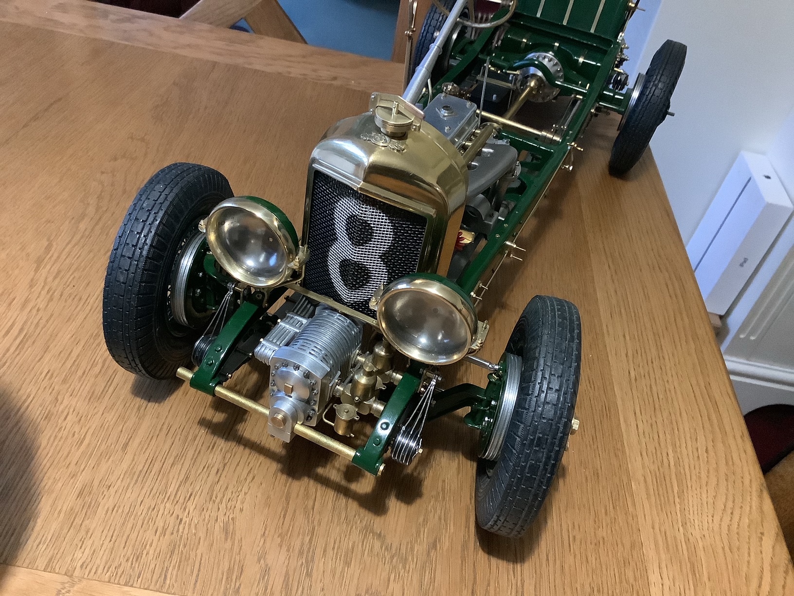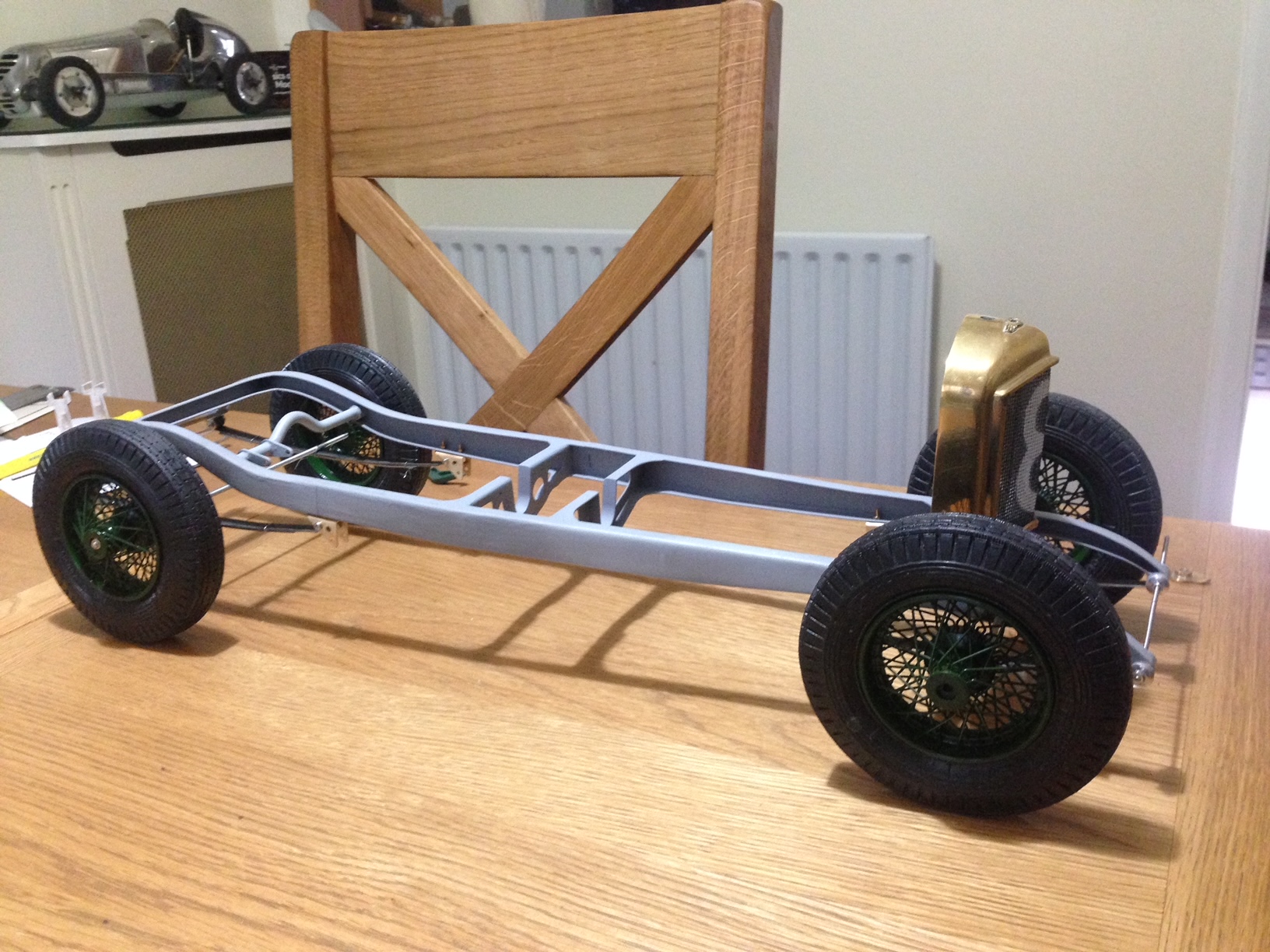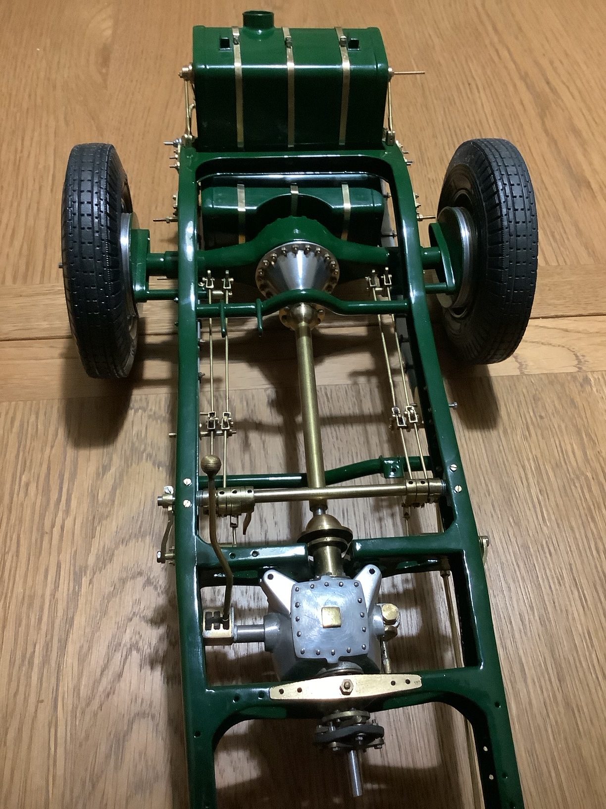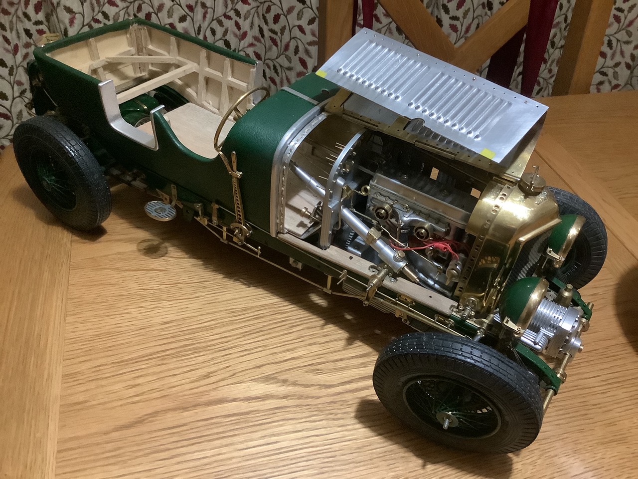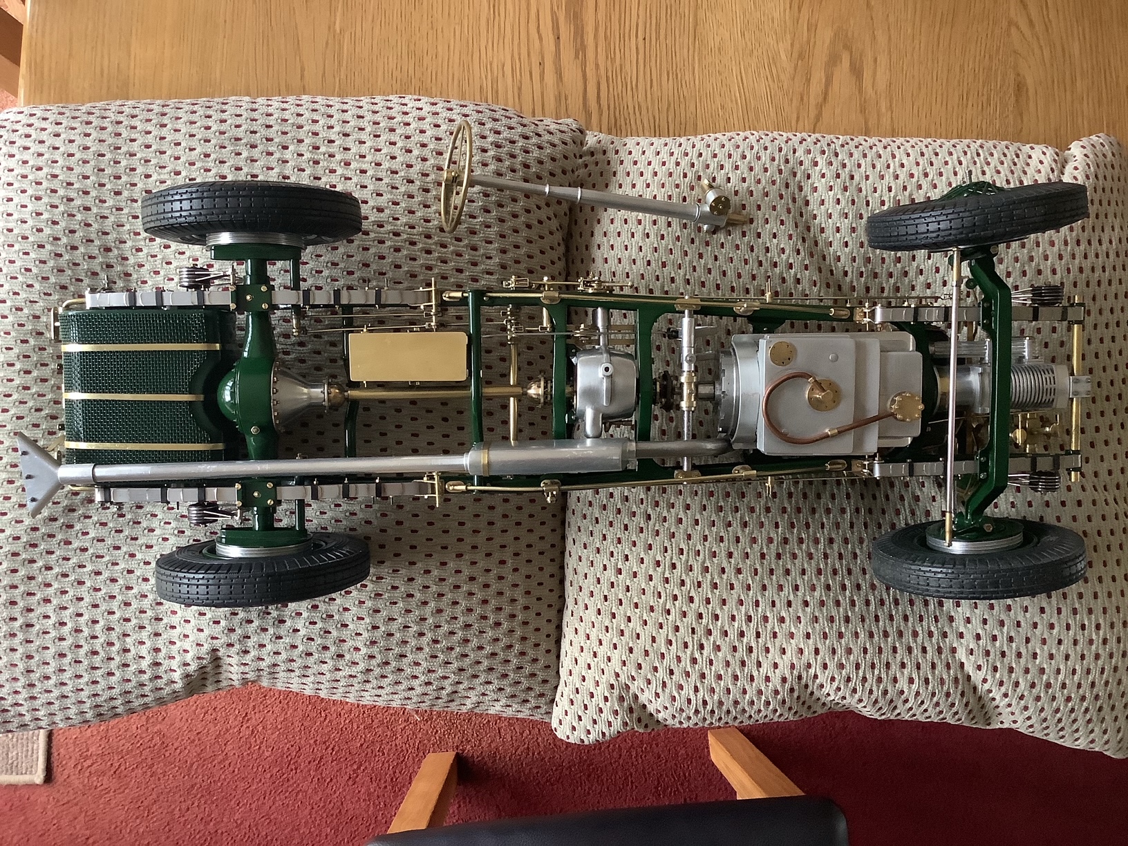 This is not a kit, I have made every part from scratch except the tyres, and they are Pocher Rolls Royce donated by Model Motorcars. I had no lathe or milling machine. The radiator was the first part I made, this is constructed from brass sheet and bar. A hardwood pattern was made first, I used this to make a cardboard template of the sides and top because the radiator tapers it couldn't be just a flat strip, more of a very flat "N" shape but with added flaps that would form the front sides. The cardboard template was transferred onto brass sheet, the front faces bent in and then curved into horseshoe shape, a square block was then silver soldered into the top and filed to give the correct profile, the flanges for the grille then added. The wheel rims were first turned in plaster of Paris molded in rubber, and cast in polyester resin, for the hubs a similar method, but the mold was made to incorporate pre-drilled brass strips bent and soldered into rings which would incorporate the spokes. The spokes themselves are long dressmakers pins, with the heads inside the hubs. Holes for the spokes in the rims were drilled from the inside with help from a pre-drilled template bent into a ring and placed inside the rim, short pieces of plastic wire insulation were slid onto each spoke after being passed through the holes in the hub, then down the spoke until they entered the hole in the rim, all this being done on a gig to keep everything central.