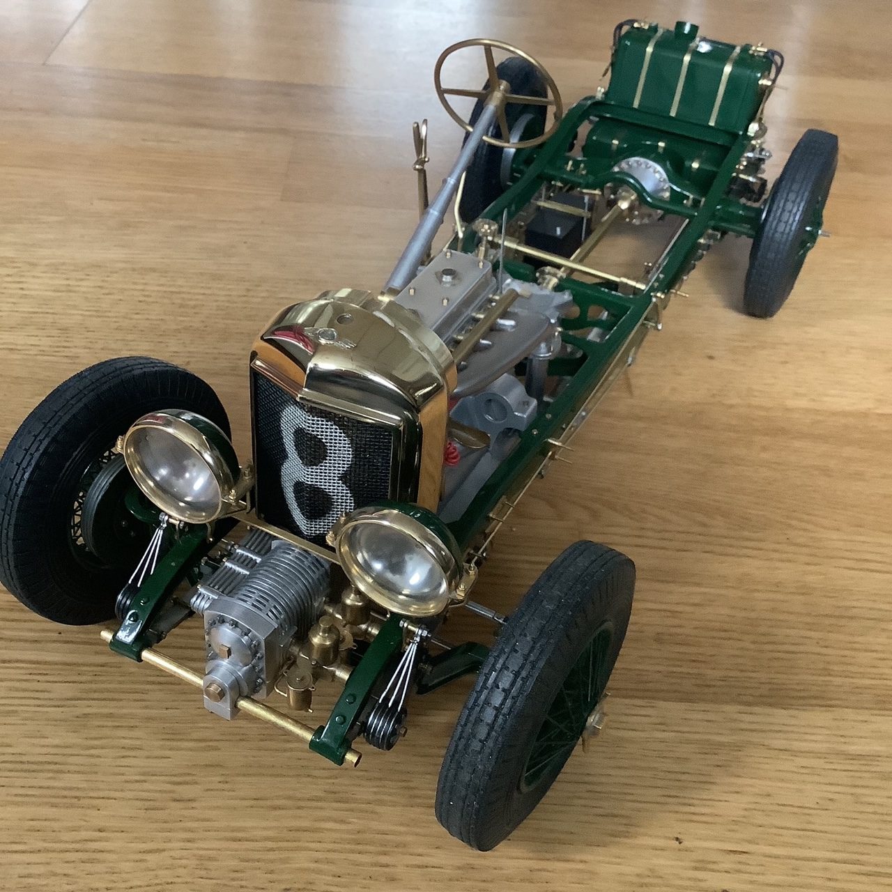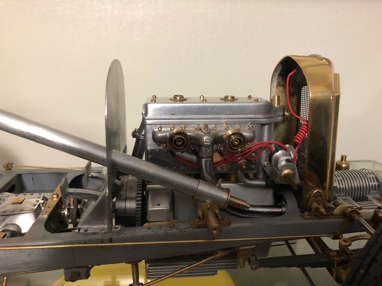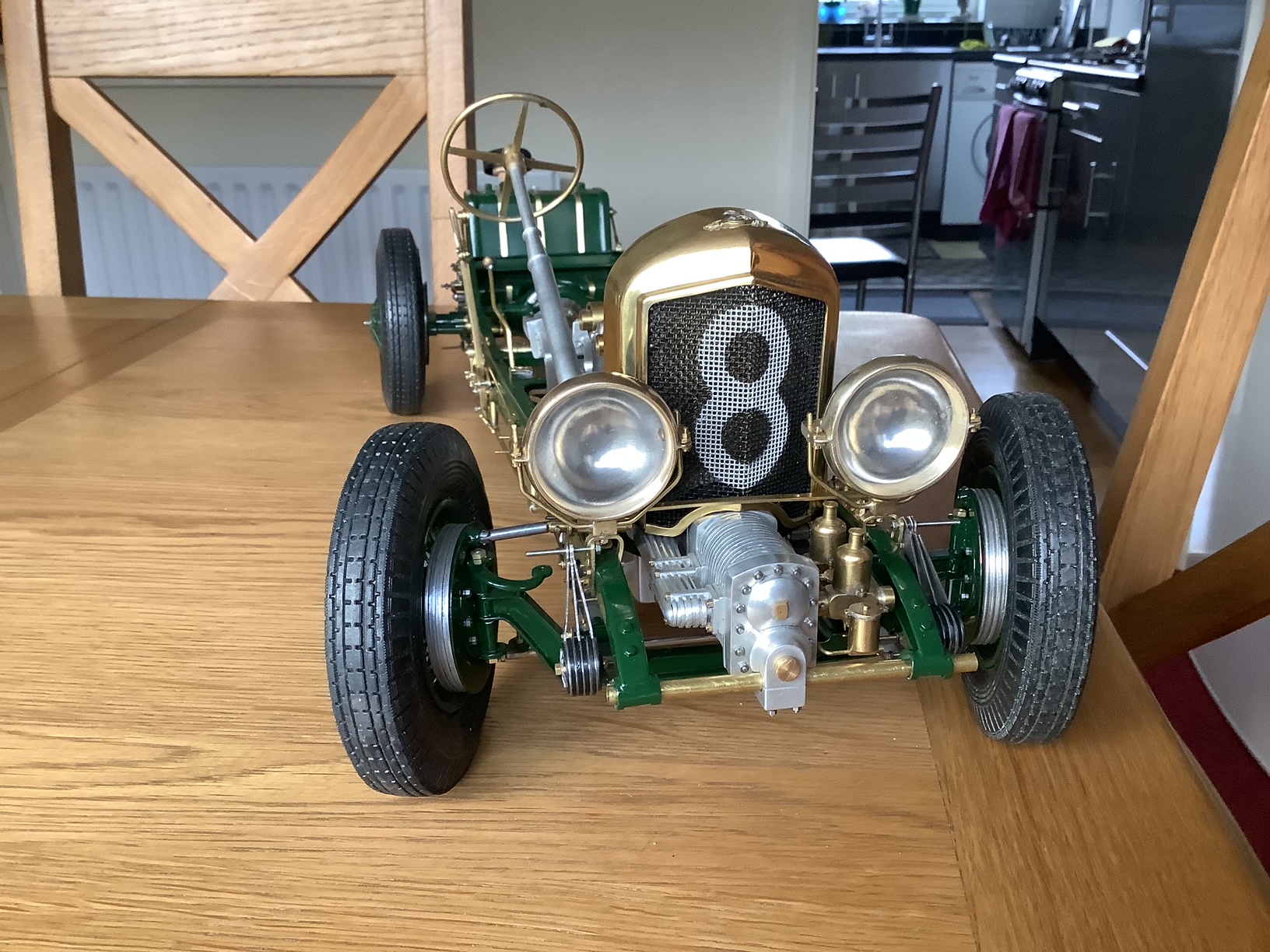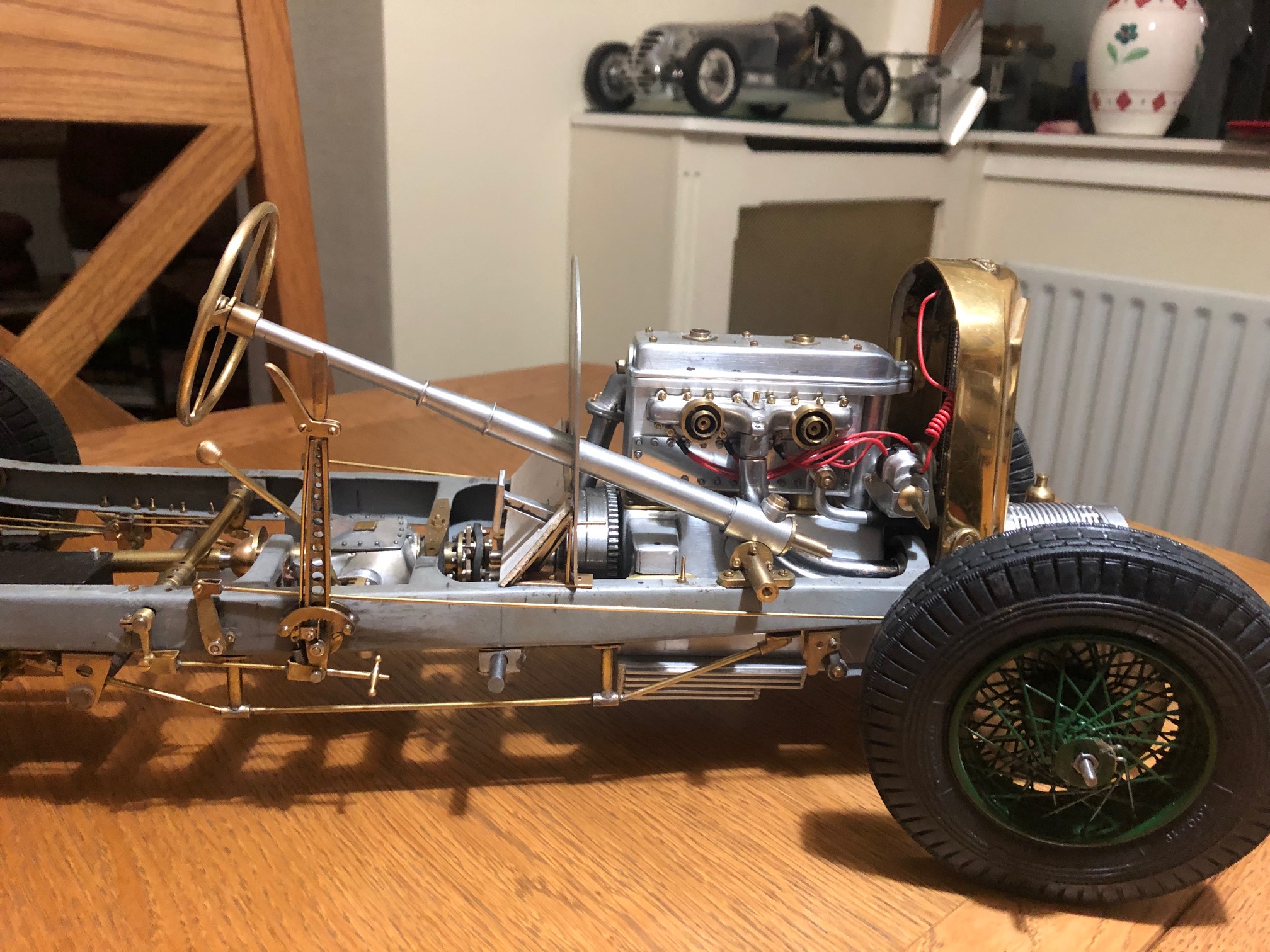 This is not a kit, I have made every part from scratch except the tyres, and they are Pocher Rolls Royce donated by Model Motorcars. I had no lathe or milling machine. The radiator was the first part I made, this is constructed from brass sheet and bar. A hardwood pattern was made first, I used this to make a cardboard template of the sides and top because the radiator tapers it couldn't be just a flat strip, more of a very flat "N" shape but with added flaps that would form the front sides. The cardboard template was transferred onto brass sheet, the front faces bent in and then curved into horseshoe shape, a square block was then silver soldered into the top and filed to give the correct profile, the flanges for the grille then added. The wheel rims were first turned in plaster of Paris molded in rubber, and cast in polyester resin, for the hubs a similar method, but the mold was made to incorporate pre-drilled brass strips bent and soldered into rings which would incorporate the spokes. The spokes themselves are long dressmakers pins, with the heads inside the hubs. Holes for the spokes in the rims were drilled from the inside with help from a pre-drilled template bent into a ring and placed inside the rim, short pieces of plastic wire insulation were slid onto each spoke after being passed through the holes in the hub, then down the spoke until they entered the hole in the rim, all this being done on a gig to keep everything central.