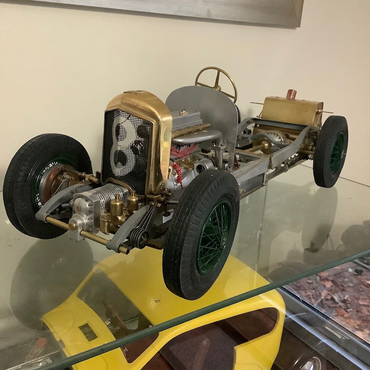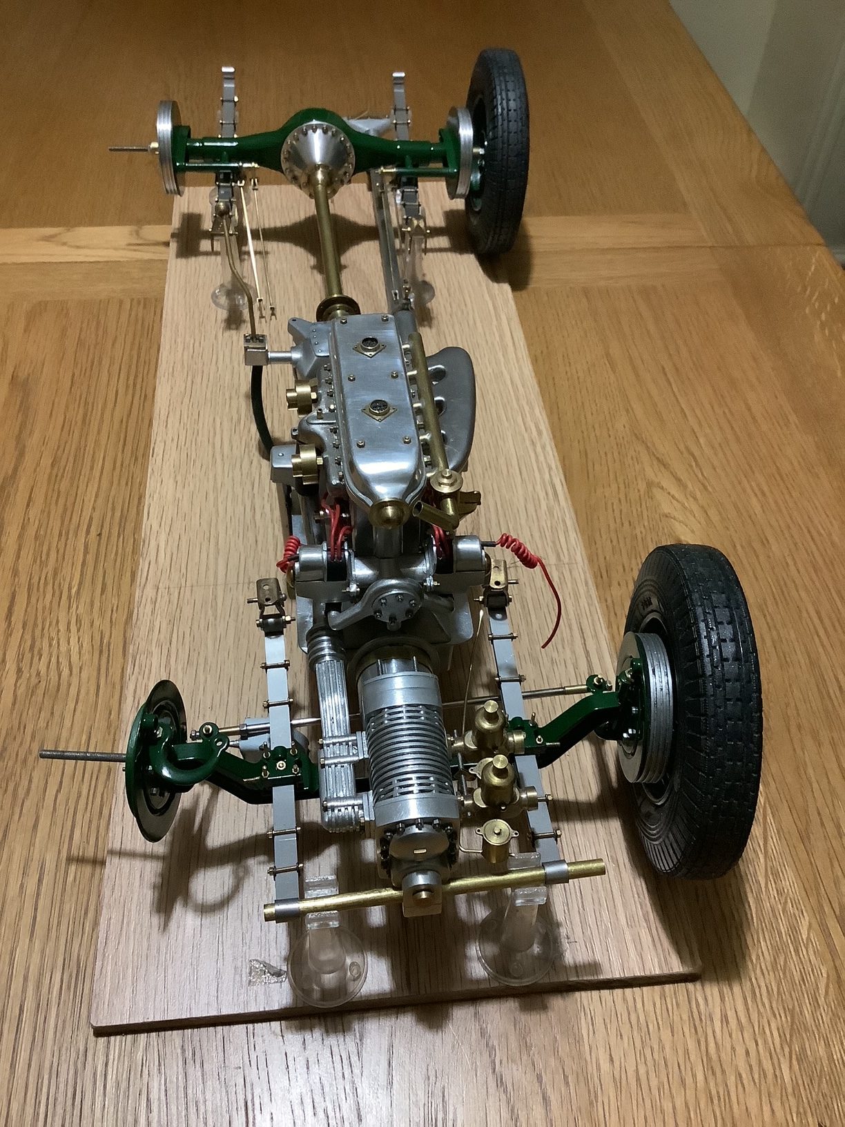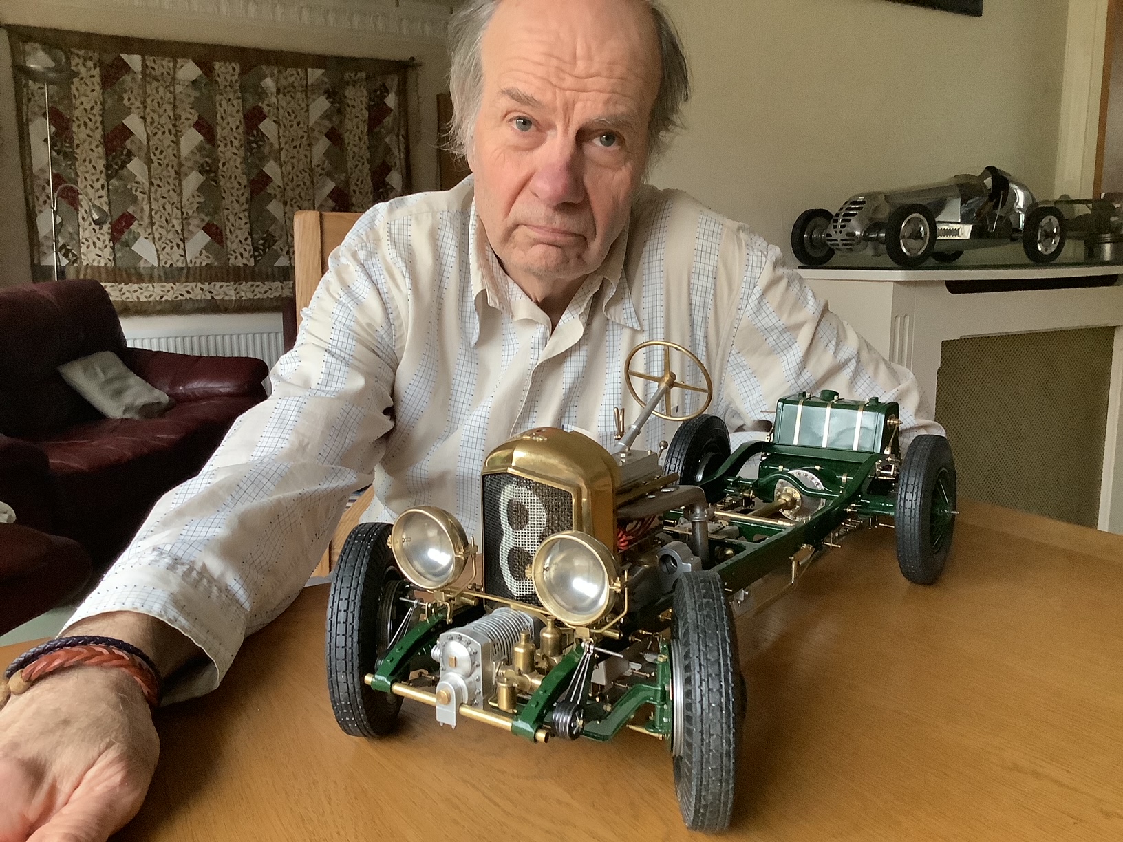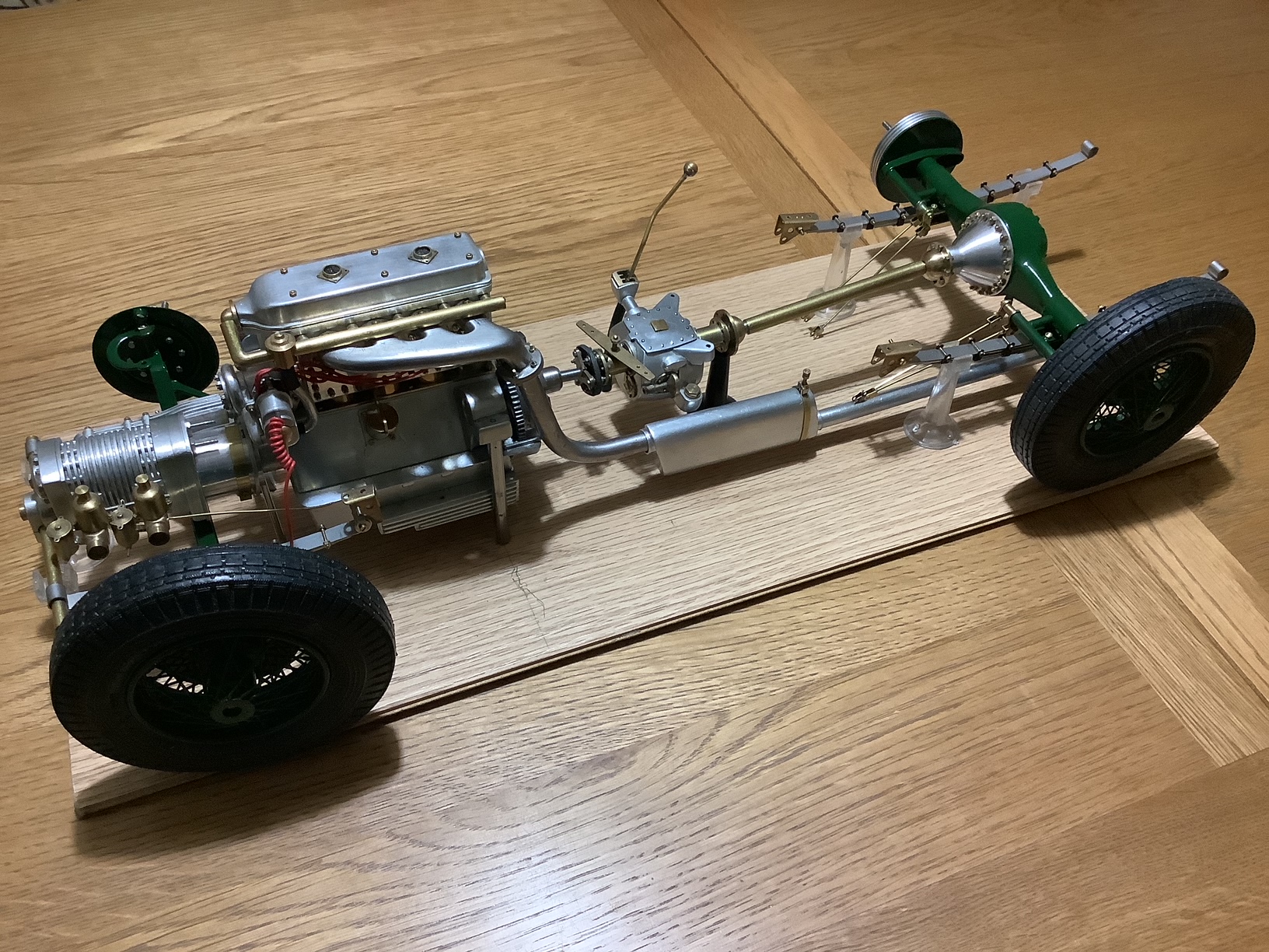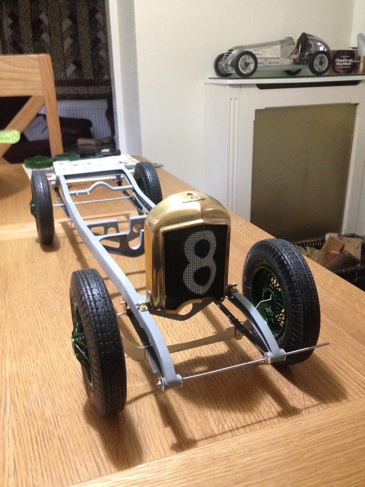 This is not a kit, I have made every part from scratch except the tyres, and they are Pocher Rolls Royce donated by Model Motorcars. I had no lathe or milling machine. The radiator was the first part I made, this is constructed from brass sheet and bar. A hardwood pattern was made first, I used this to make a cardboard template of the sides and top because the radiator tapers it couldn't be just a flat strip, more of a very flat "N" shape but with added flaps that would form the front sides. The cardboard template was transferred onto brass sheet, the front faces bent in and then curved into horseshoe shape, a square block was then silver soldered into the top and filed to give the correct profile, the flanges for the grille then added. The wheel rims were first turned in plaster of Paris molded in rubber, and cast in polyester resin, for the hubs a similar method, but the mold was made to incorporate pre-drilled brass strips bent and soldered into rings which would incorporate the spokes. The spokes themselves are long dressmakers pins, with the heads inside the hubs. Holes for the spokes in the rims were drilled from the inside with help from a pre-drilled template bent into a ring and placed inside the rim, short pieces of plastic wire insulation were slid onto each spoke after being passed through the holes in the hub, then down the spoke until they entered the hole in the rim, all this being done on a gig to keep everything central.