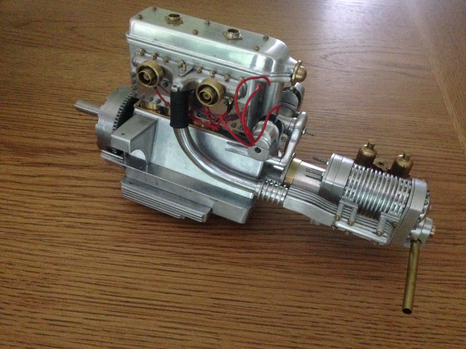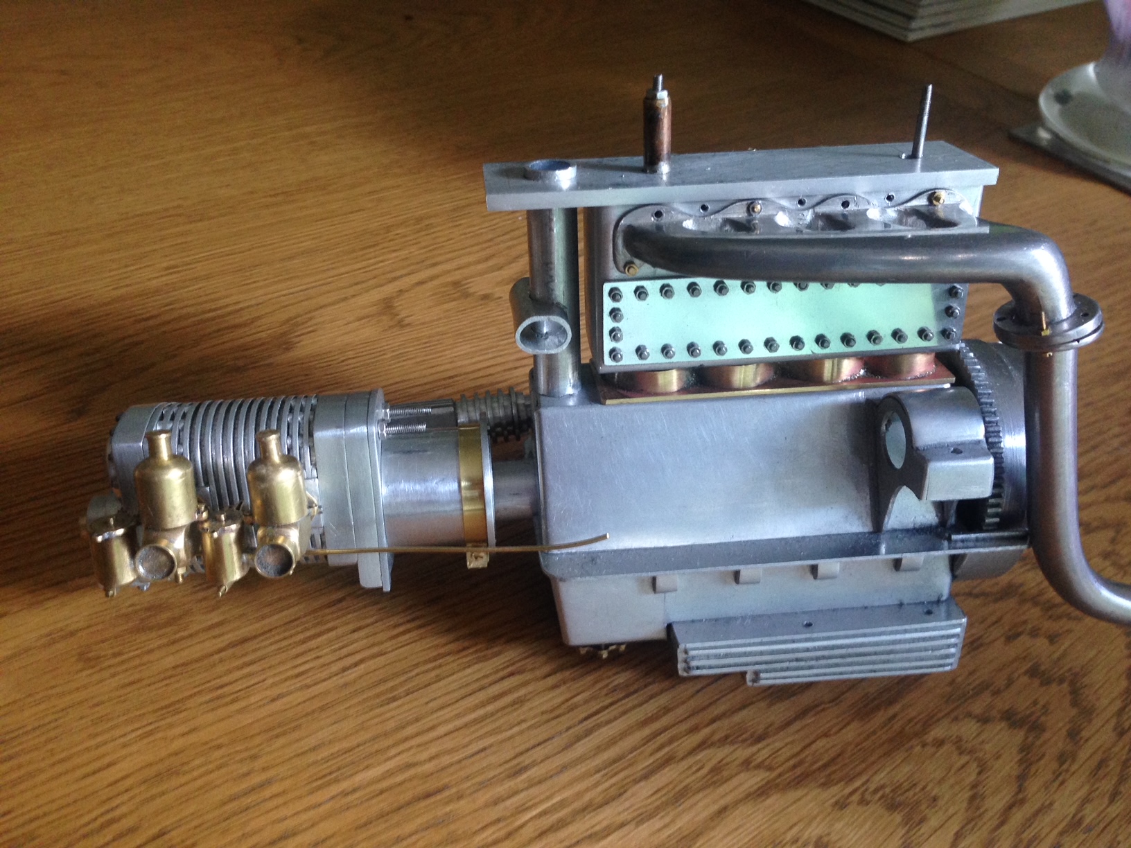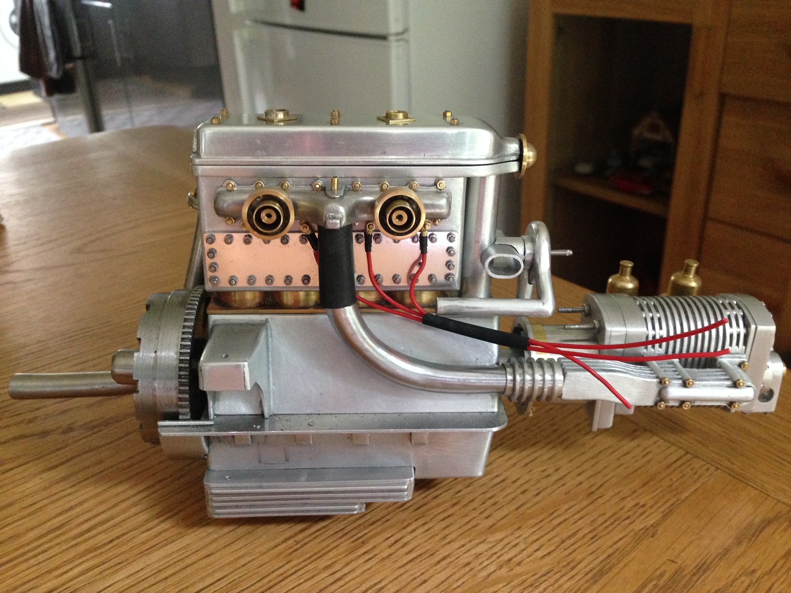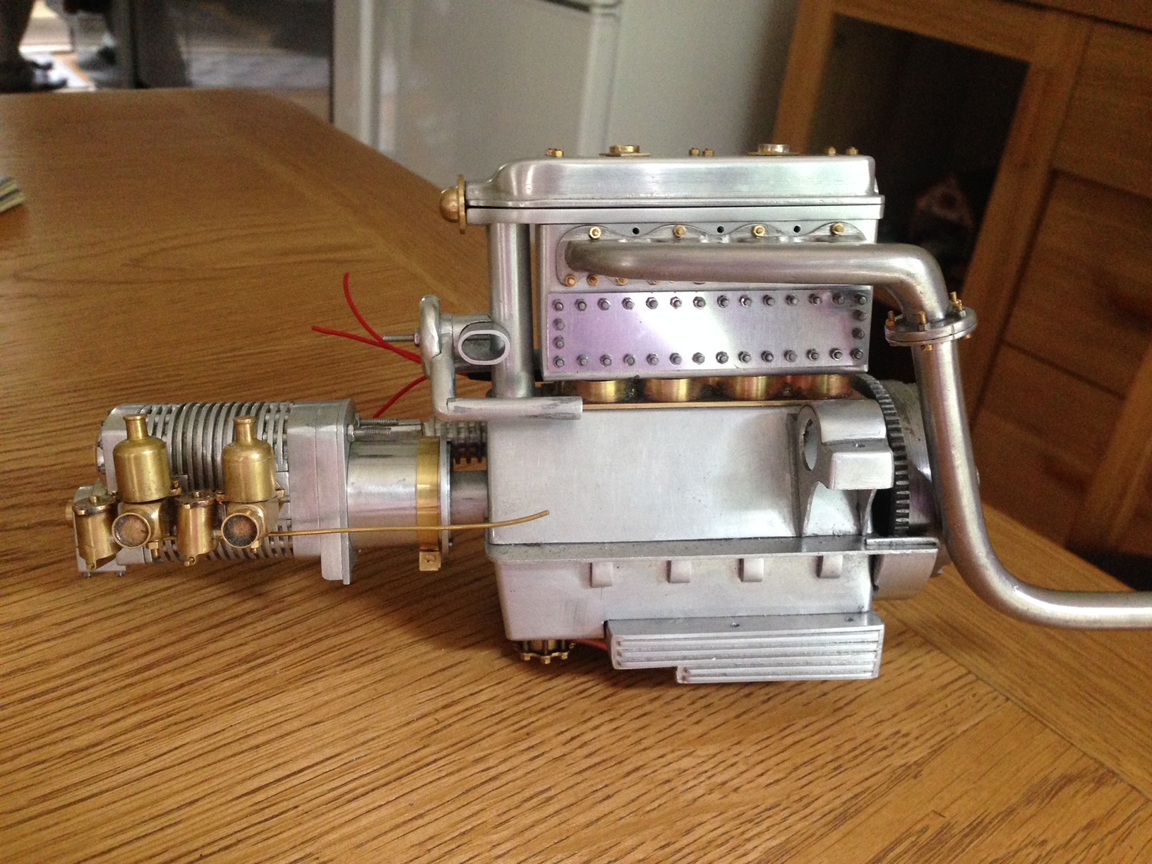 Engine block is made of folded aluminum sheet, with the mountings made separate then keyed into place. The finned sump built up in layers, and the rocker cover carved and filed from solid aluminum.