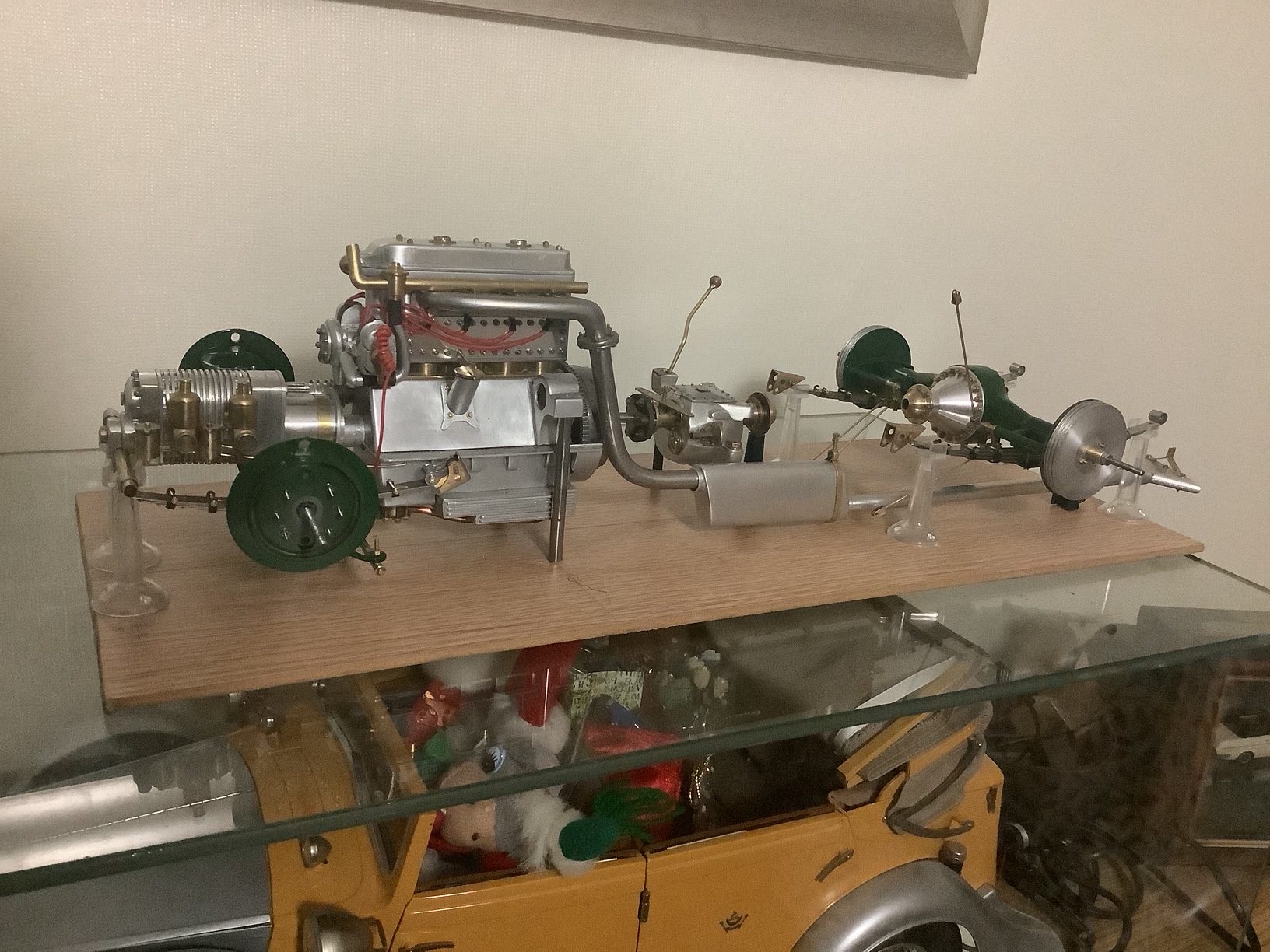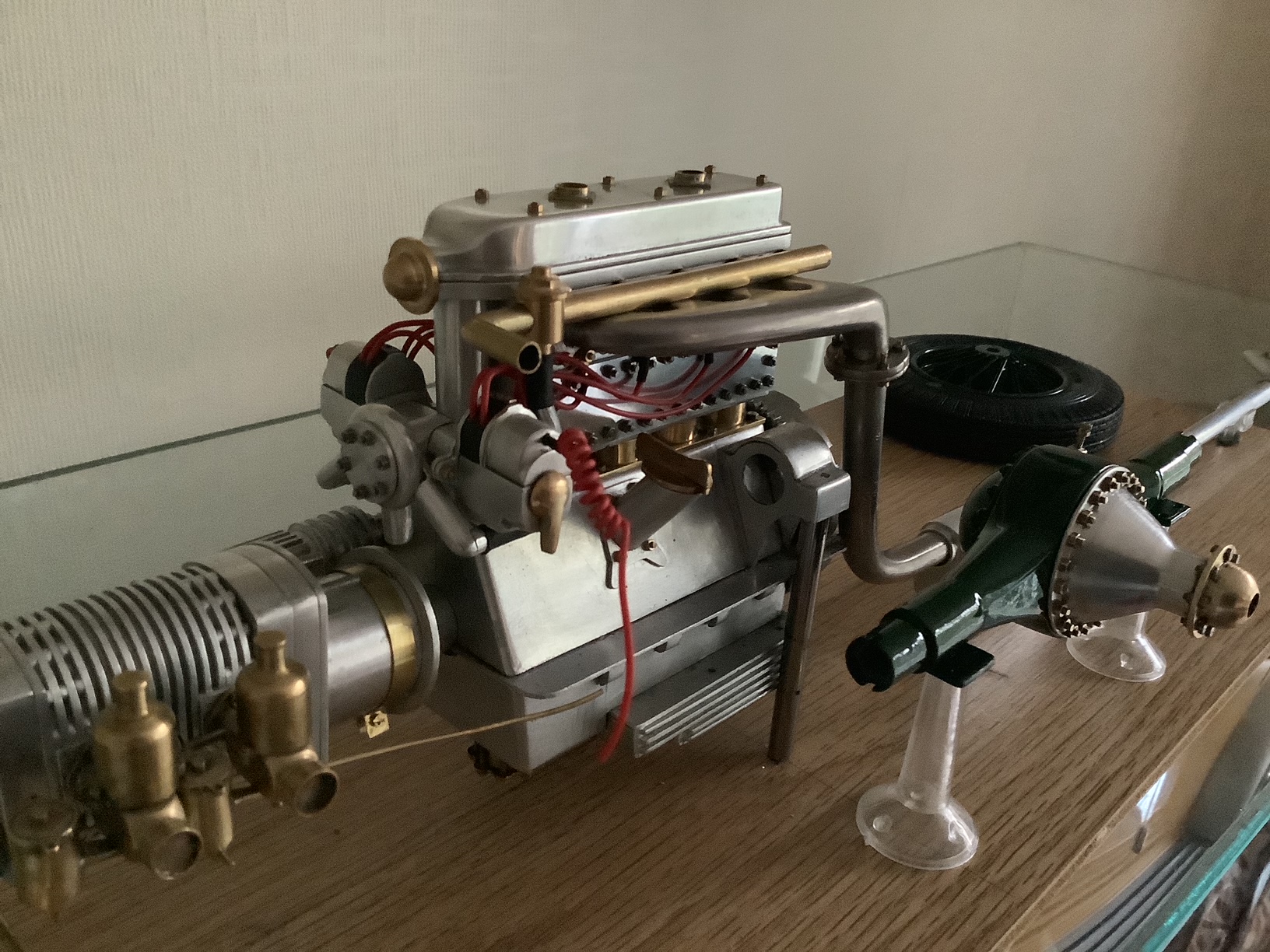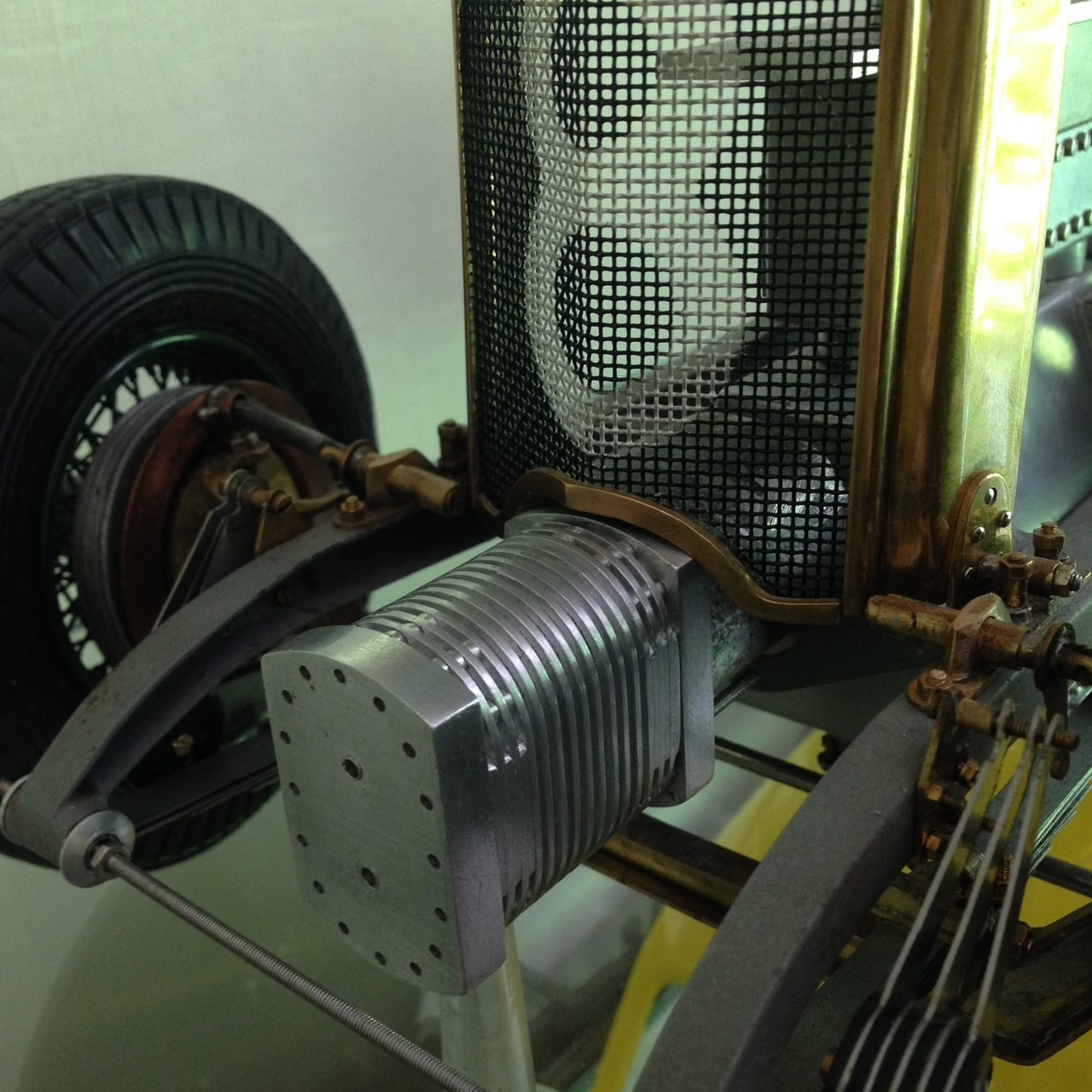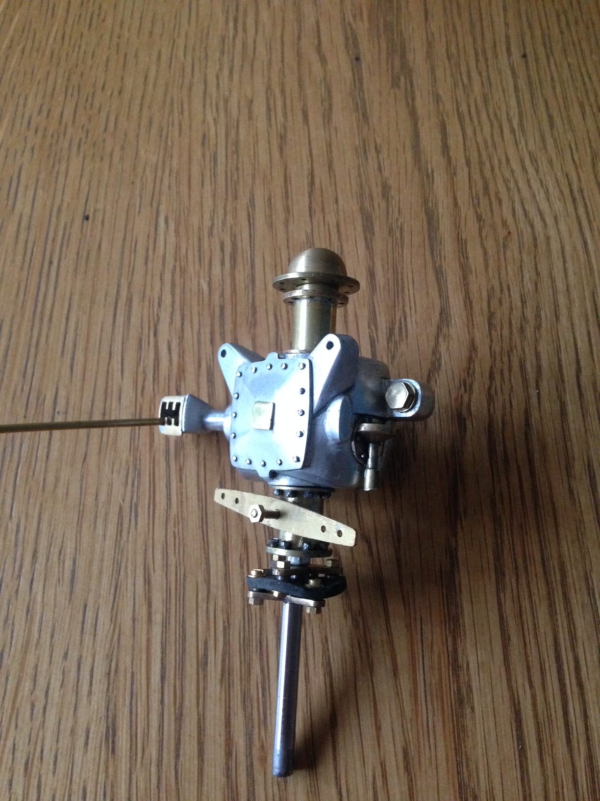 Engine block is made of folded aluminum sheet, with the mountings made separate then keyed into place. The finned sump built up in layers, and the rocker cover carved and filed from solid aluminum.