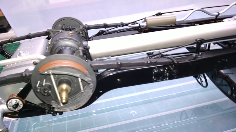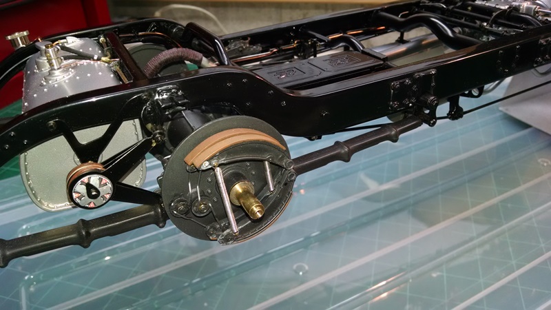 Assembling the stock Pocher Rolls-Royce PII chassis is enough to keep most of us busy, but there are always improvements to be made. Ken Krausfeldt tackled the project with a singular motivation: he decided to match the prototype as closely as he could. Faced with stacks of Pocher components of varying quality and accuracy, Krausfeldt proceed to finish each and every component with flawless preparation in anticipation of applying glass-smooth air-brushed paints. Had Sir Henry been able to finish his 1:1 version this well, he would have counted it as an improvement on his work. From Model Motorcars's axle to transmission levers and clevises, everything is the right color and ready to be inspected by the most demanding critics. Where the parts let the model down, scratch-built components took their places, and where the operation of the mechanical brakes were compromised by mass-produced, stamped levers, scratch-built pieces were substituted. One look inside the brake mechanisms and the care taken for smooth operation becomes apparent.