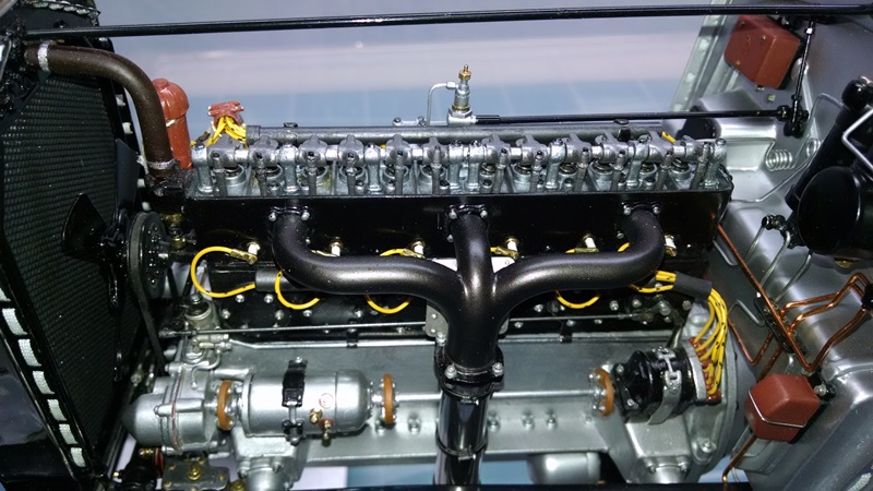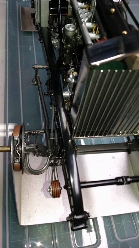 In such a model it is no surprise that the rear of the instrument fascia is as detailed as the visible complexities of the engine; clearly Krausfeldt is either familiar with the intricacies of John Haddock's drawings of the engine levers, or he is working from a 1:1 PII in his own garage. The details on top of the gas tank-scratch-built and perfectly finished-are all the more amazing when one realizes that they would be removed in order to clear the floor of the boot. Perhaps this chassis will forever live atop its Model Motorcars's chassis supports, exposing enough hidden details to delight to even the most demanding viewer, but it would be a shame. Such a magnificent chassis deserves coachwork, and the idea of seeing what Mr. Krausfeldt would do with such a challenge is truly tantalizing. After all, a man who adds paper gasket to his timing gear case is a man who could make himself some smooth body panels and pretty seats.