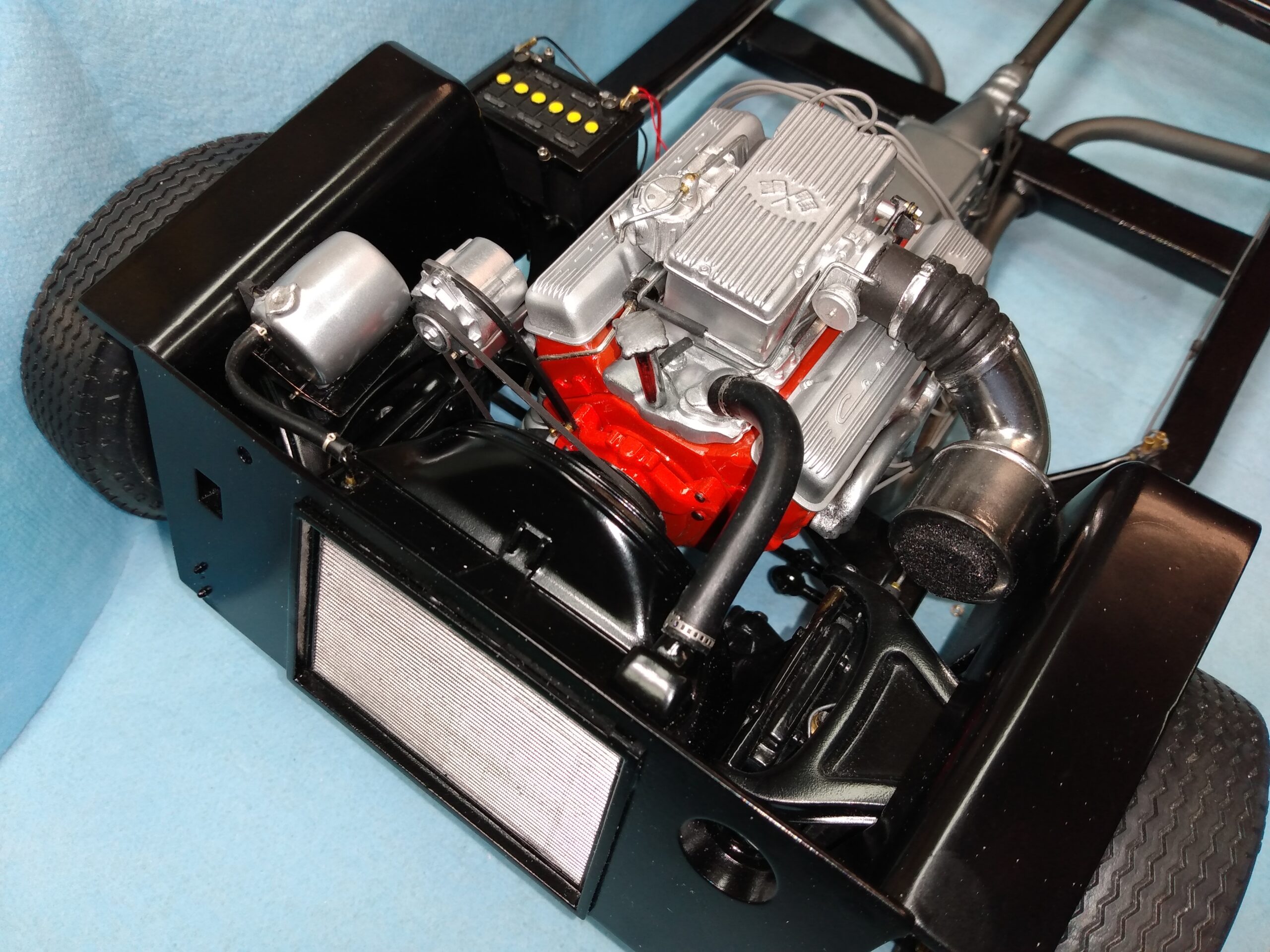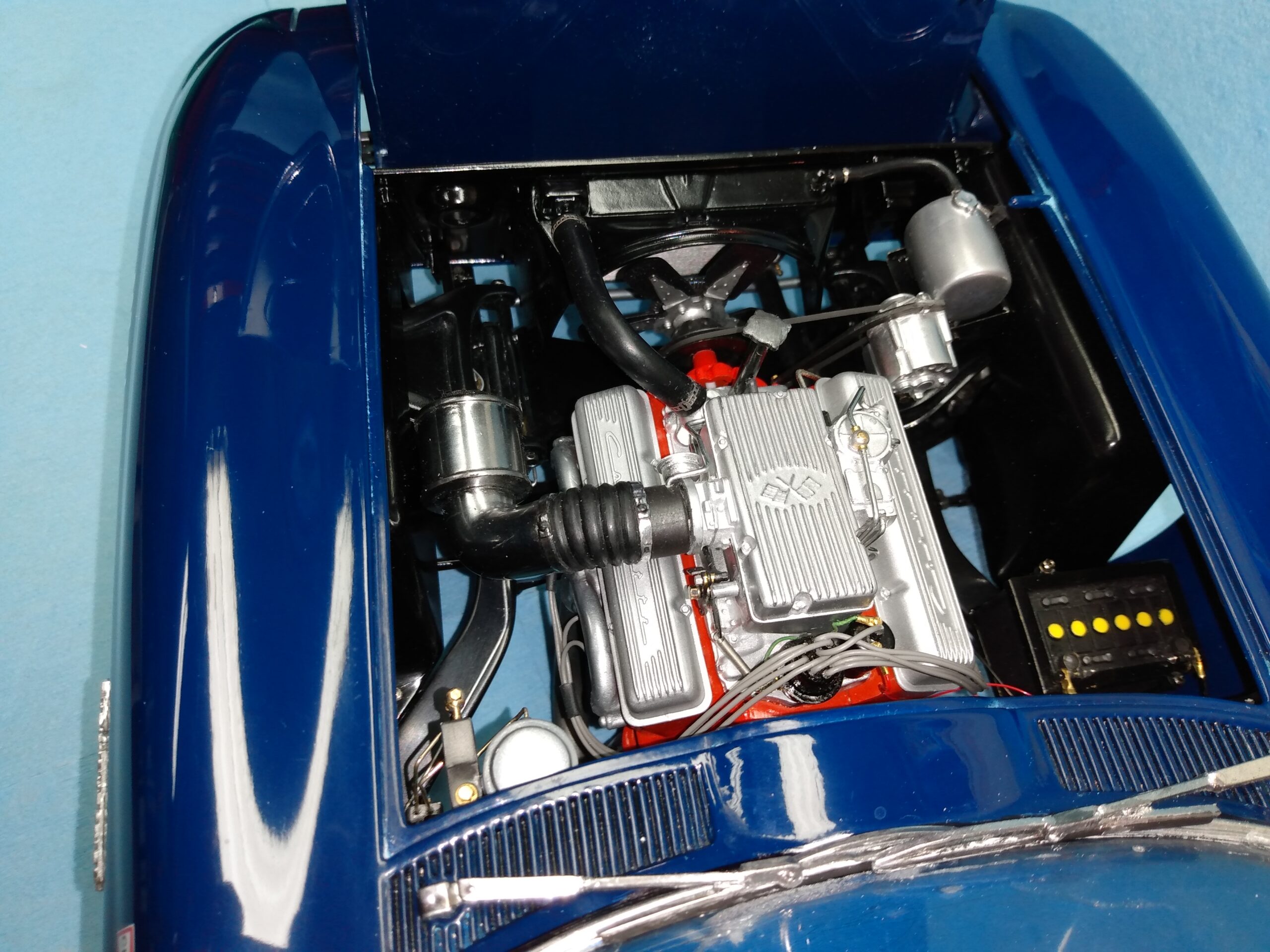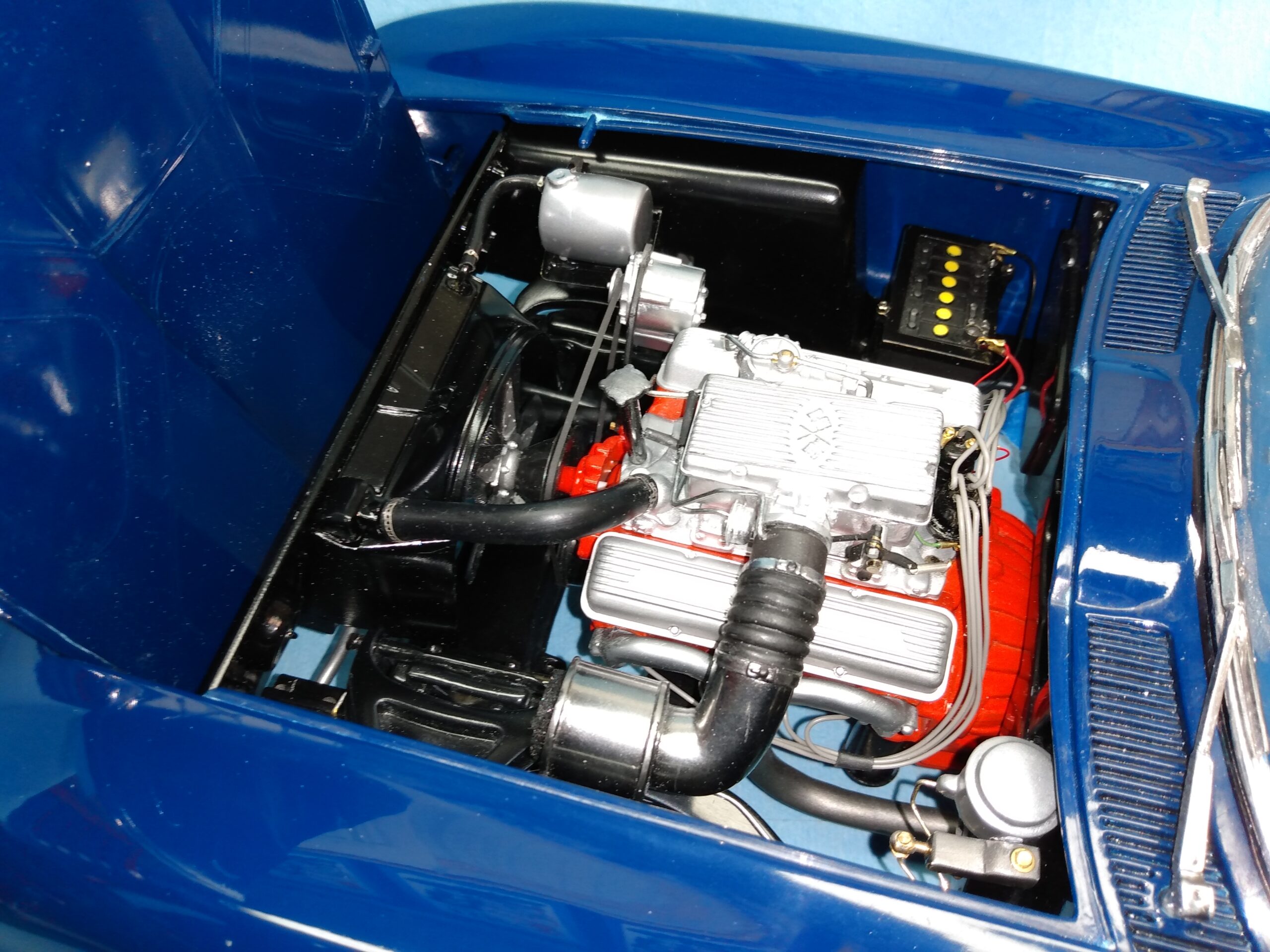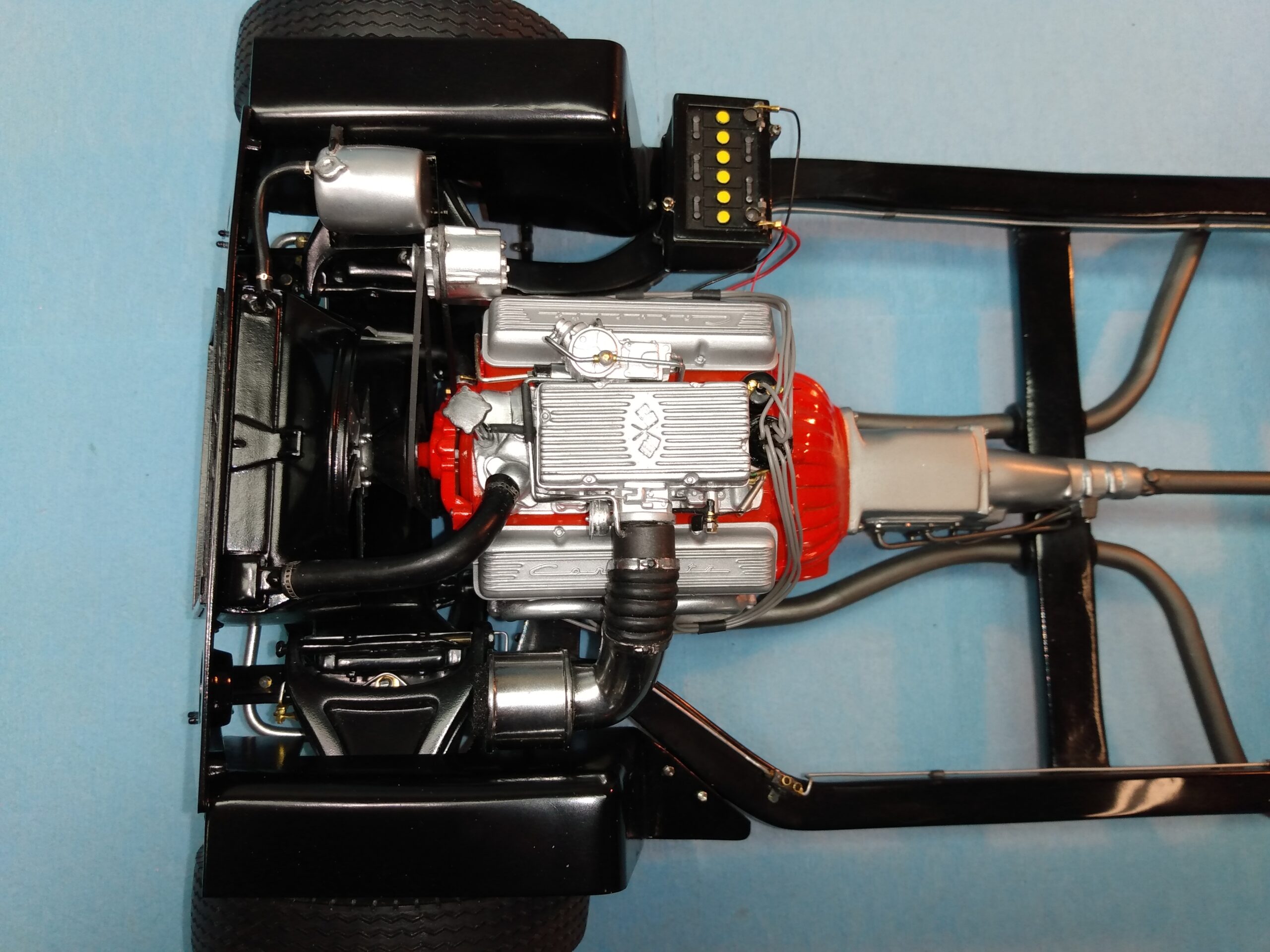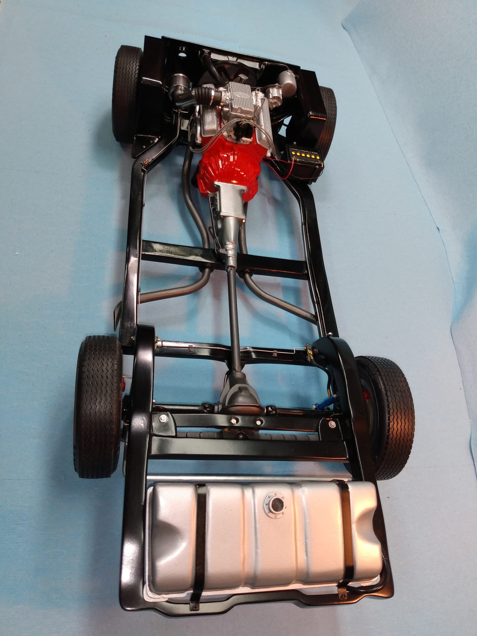 I've also been fascinated with the SCCA racecars. So, as I contemplated the necessary rebuild of my 1/8 scale 1965 Corvette model it became obvious to me what the theme should be. But, with minimal aftermarket running gear available, I knew that I had my work cut out to transform the platform-style frame and half-relief suspension of the original model into something that represented a real C2 racecar. Not shown are the steps taken to produce some realism into a the race theme: radio and heater deletes, filling in the rear-fascia exhaust body passthroughs, removal of the molded-in right seat. One of the biggest tasks was to remove, from the original platform frame unit, everything that does not exist in a C2 frame. My previous 1:1 experience, and several reference materials helped determine that path. Once completed, what I had left of the original platform required much fabrication to bring into being the basic frame foundation. Then on to the suspension fabrications and modifications, fuel tank fabrication (carved from a foam block and sealed), fuel and brake lines, battery and hold-down, engine detailing and radiator support. Detailing the cab into race trim proved to be tedious, but successful, with roll cage and racing harness, filling in the area of the removed seat with sheet plastic, and adding the removed lower cab details from the platform frame unit and grafting them onto the cab bucket, and then reshaping the drive tunnel. And, I purchased a very-rough set of scale American Torque-Thrust wheels, and converted them to true knockoff attachment to the hubs (I now observe that I did not remove the simulated lug-bolts in that conversion, which bothers me enough that I'll remedy that soon. Lots of work prepping those wheels since they were terrible resin-casts. MUCH work went into stripping the original body paint, then prepping, repainting, and polishing. I reached out to a custom decal maker for the race numbers and manufacturers race equipment decals (I tried to make them myself with decal paper and my ink-jet printer, only to create some real junk!).
