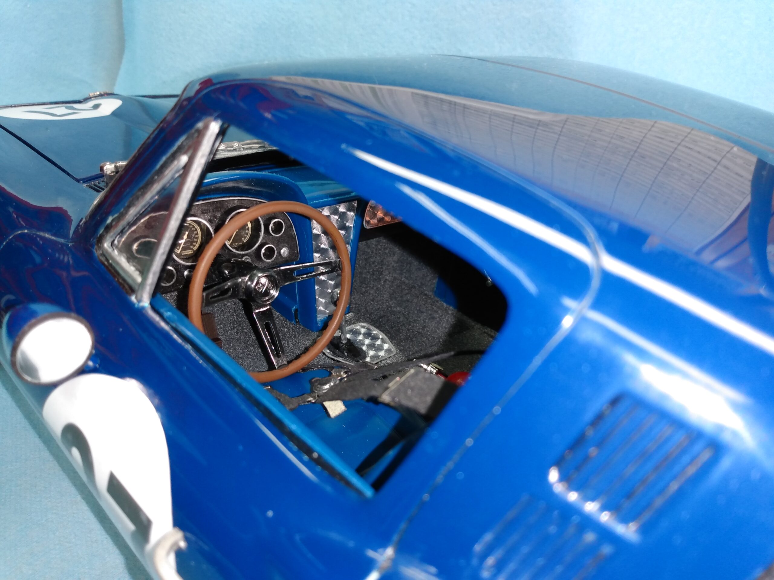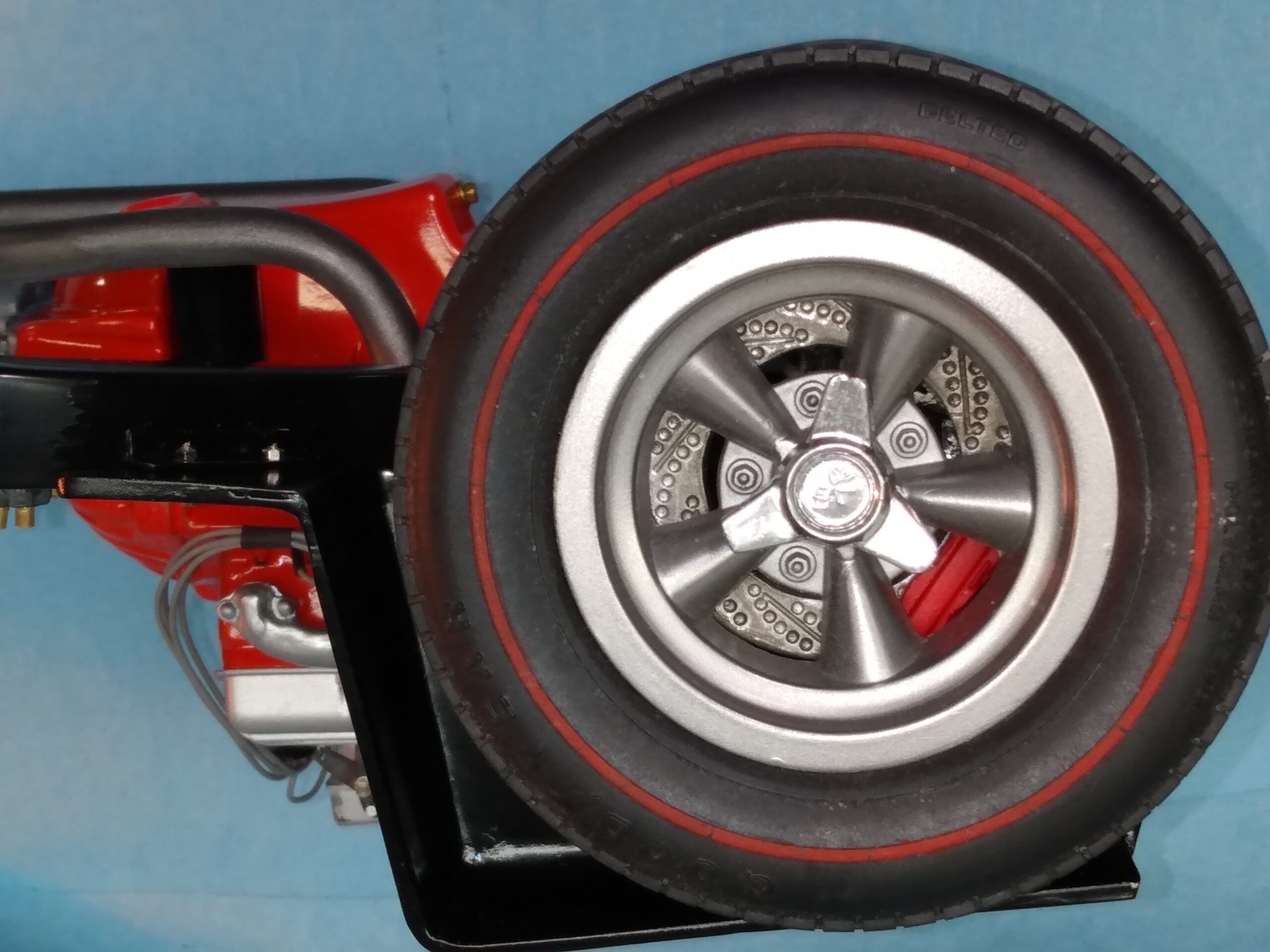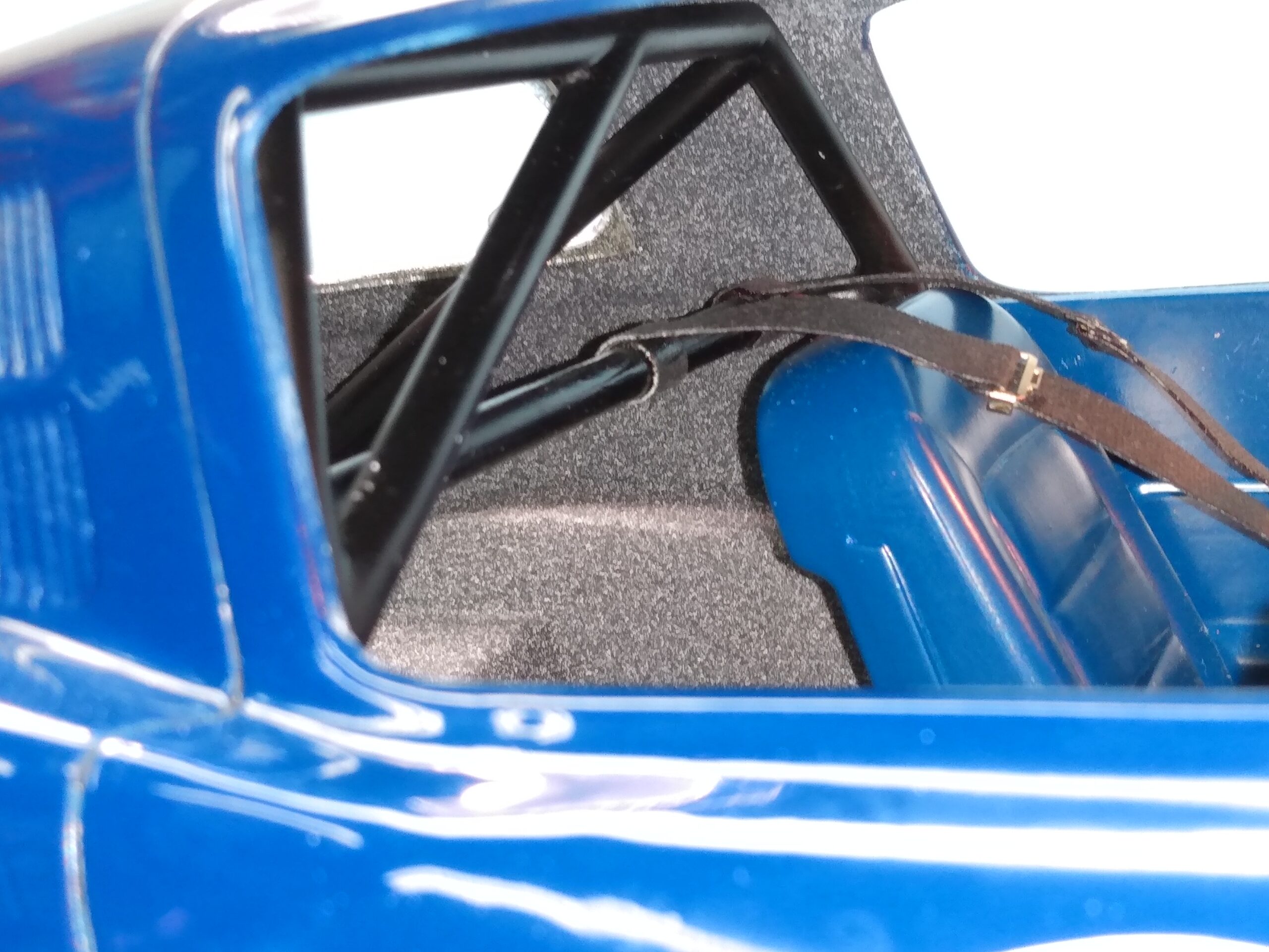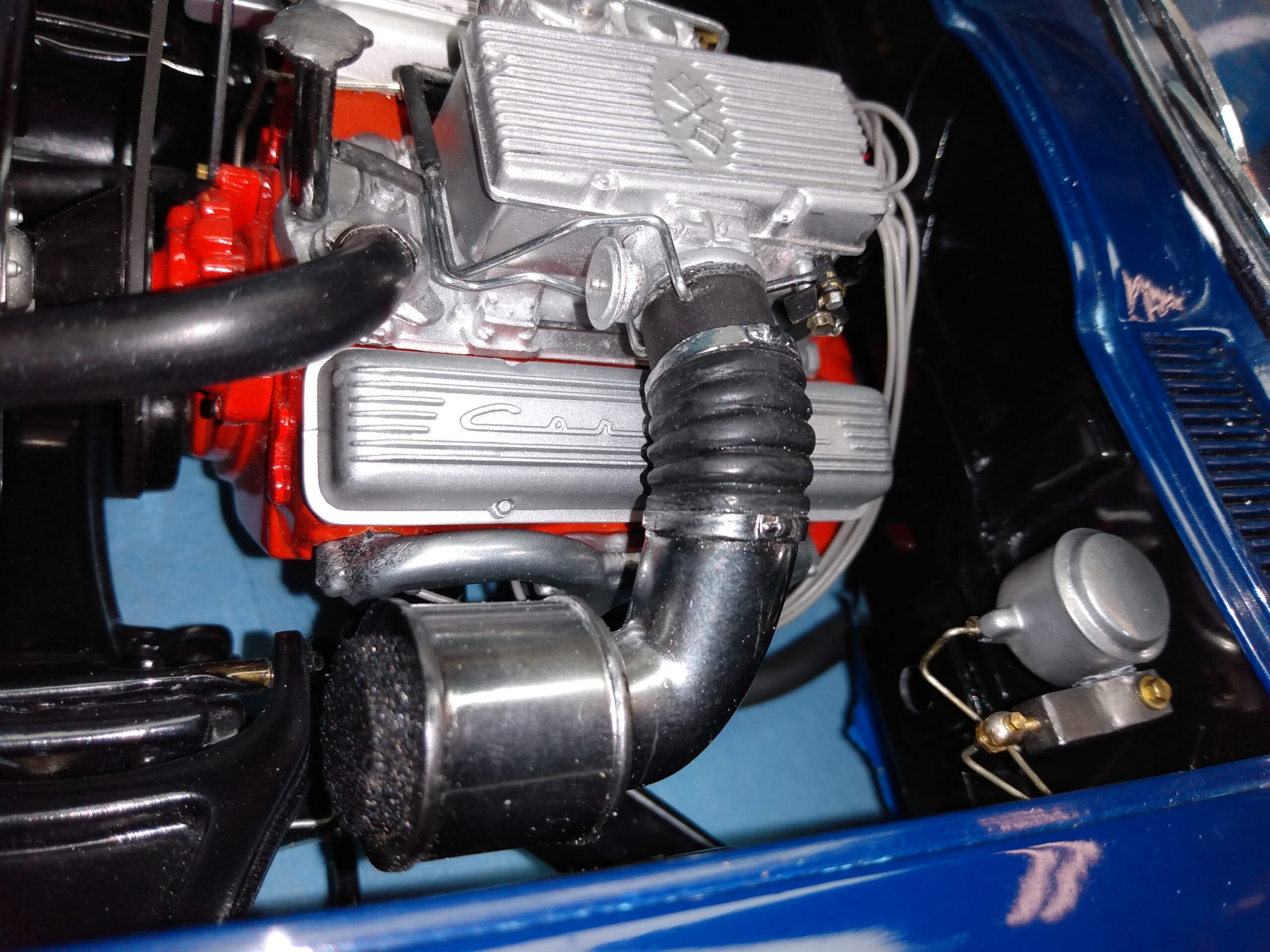 I've also been fascinated with the SCCA racecars. So, as I contemplated the necessary rebuild of my 1/8 scale 1965 Corvette model it became obvious to me what the theme should be. But, with minimal aftermarket running gear available, I knew that I had my work cut out to transform the platform-style frame and half-relief suspension of the original model into something that represented a real C2 racecar. Not shown are the steps taken to produce some realism into a the race theme: radio and heater deletes, filling in the rear-fascia exhaust body passthroughs, removal of the molded-in right seat. One of the biggest tasks was to remove, from the original platform frame unit, everything that does not exist in a C2 frame. My previous 1:1 experience, and several reference materials helped determine that path. Once completed, what I had left of the original platform required much fabrication to bring into being the basic frame foundation. Then on to the suspension fabrications and modifications, fuel tank fabrication (carved from a foam block and sealed), fuel and brake lines, battery and hold-down, engine detailing and radiator support. Detailing the cab into race trim proved to be tedious, but successful, with roll cage and racing harness, filling in the area of the removed seat with sheet plastic, and adding the removed lower cab details from the platform frame unit and grafting them onto the cab bucket, and then reshaping the drive tunnel. And, I purchased a very-rough set of scale American Torque-Thrust wheels, and converted them to true knockoff attachment to the hubs (I now observe that I did not remove the simulated lug-bolts in that conversion, which bothers me enough that I'll remedy that soon. Lots of work prepping those wheels since they were terrible resin-casts. MUCH work went into stripping the original body paint, then prepping, repainting, and polishing. I reached out to a custom decal maker for the race numbers and manufacturers race equipment decals (I tried to make them myself with decal paper and my ink-jet printer, only to create some real junk!).
