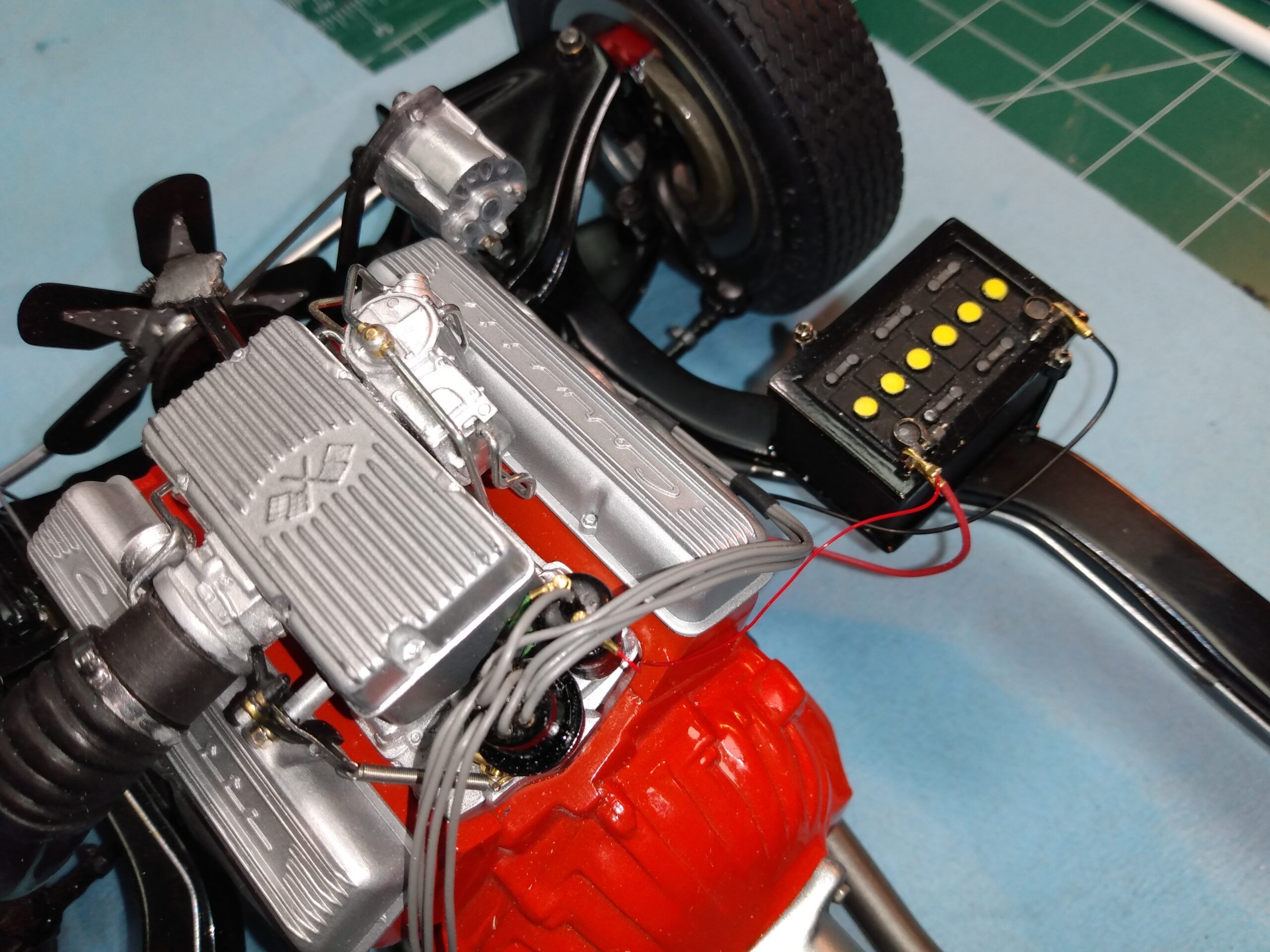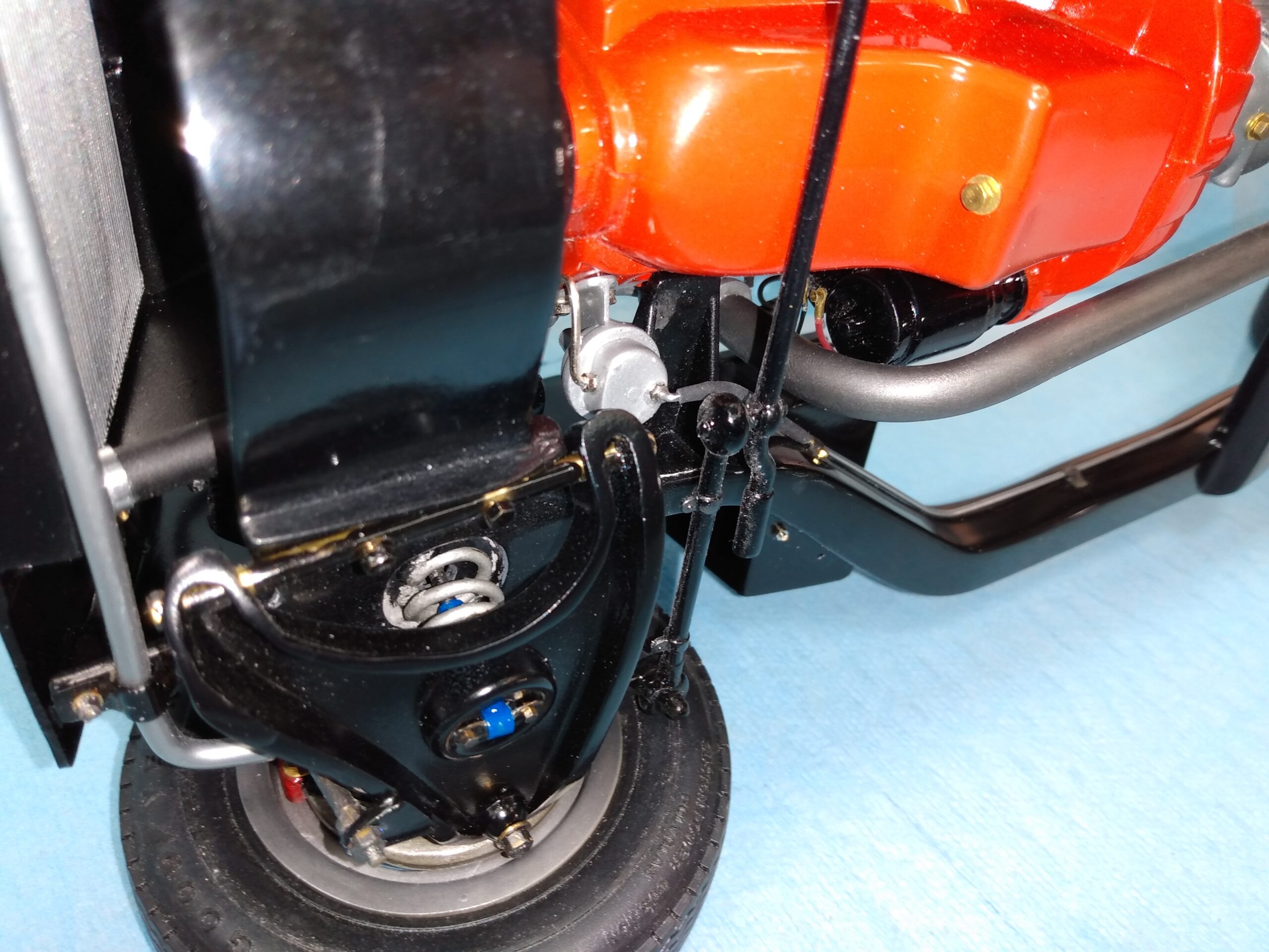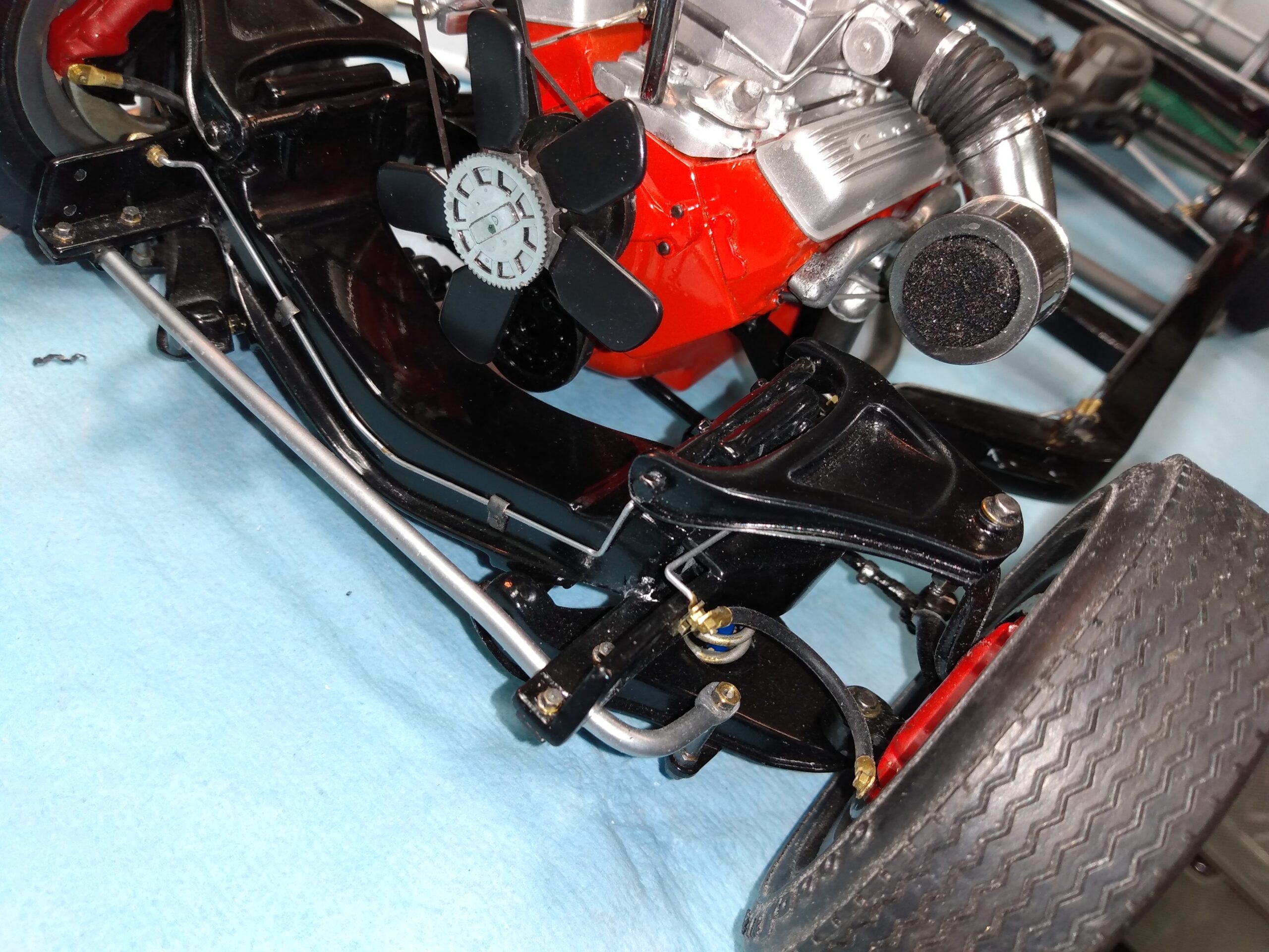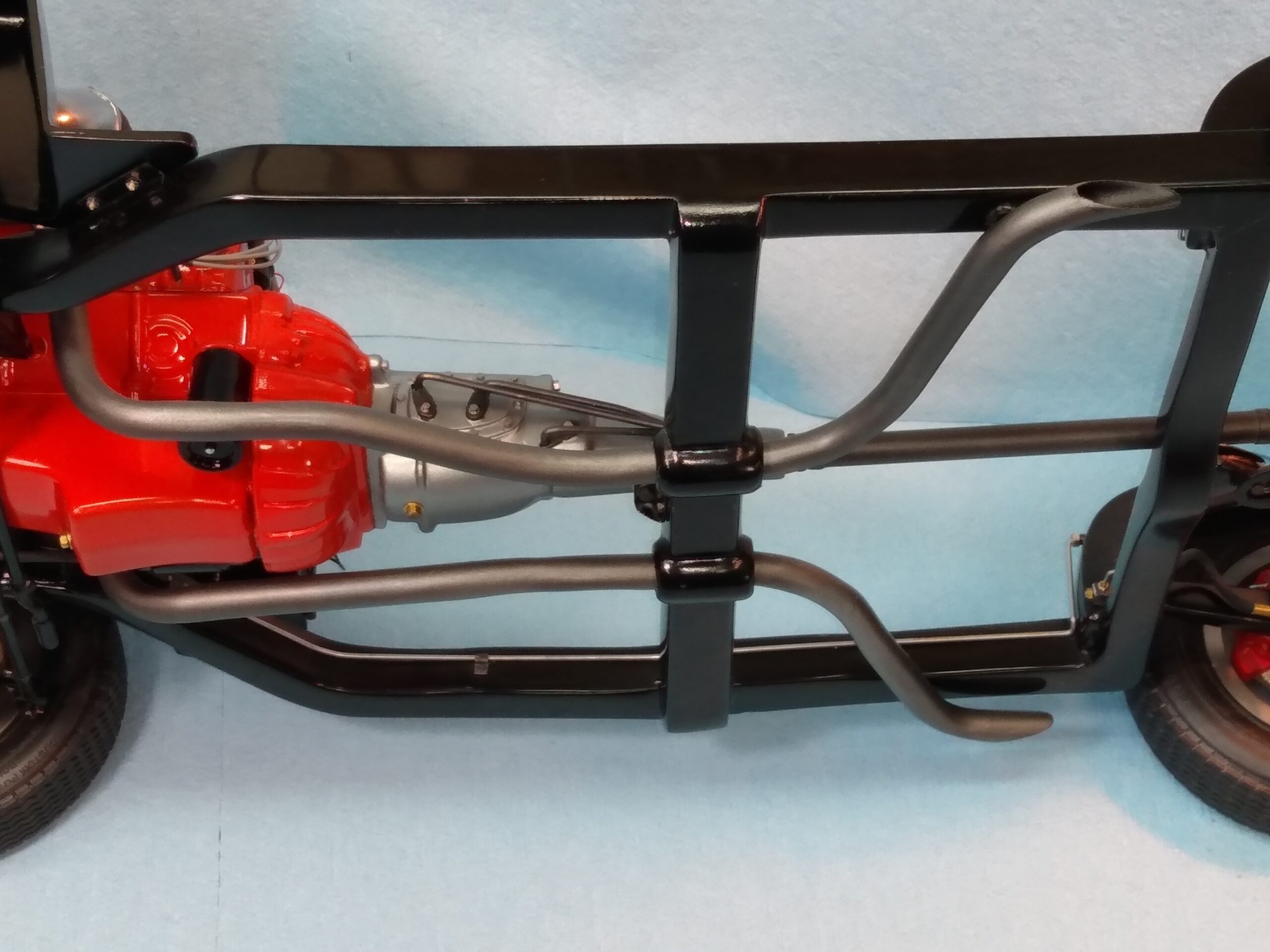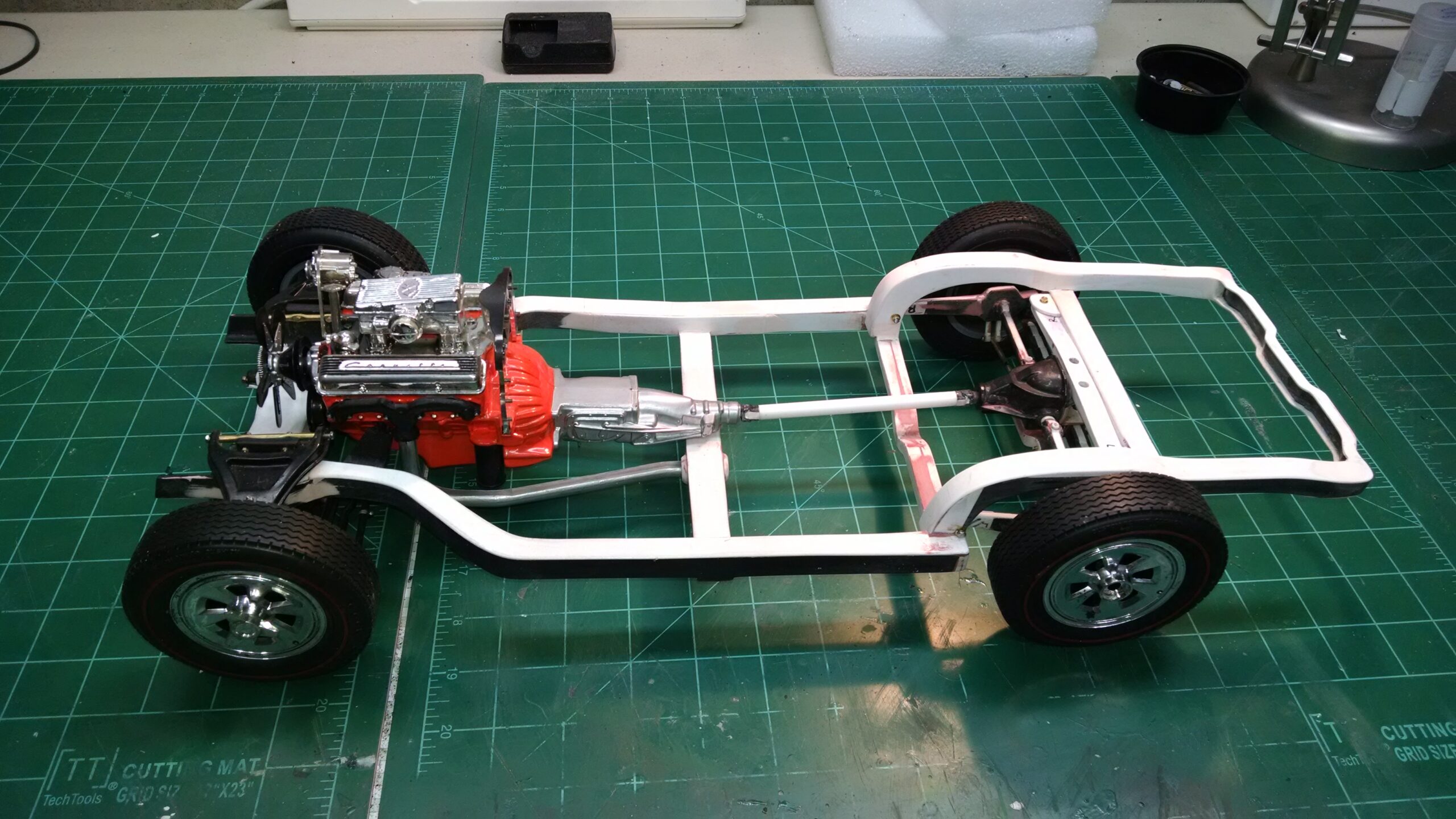 I've also been fascinated with the SCCA racecars. So, as I contemplated the necessary rebuild of my 1/8 scale 1965 Corvette model it became obvious to me what the theme should be. But, with minimal aftermarket running gear available, I knew that I had my work cut out to transform the platform-style frame and half-relief suspension of the original model into something that represented a real C2 racecar. Not shown are the steps taken to produce some realism into a the race theme: radio and heater deletes, filling in the rear-fascia exhaust body passthroughs, removal of the molded-in right seat. One of the biggest tasks was to remove, from the original platform frame unit, everything that does not exist in a C2 frame. My previous 1:1 experience, and several reference materials helped determine that path. Once completed, what I had left of the original platform required much fabrication to bring into being the basic frame foundation. Then on to the suspension fabrications and modifications, fuel tank fabrication (carved from a foam block and sealed), fuel and brake lines, battery and hold-down, engine detailing and radiator support. Detailing the cab into race trim proved to be tedious, but successful, with roll cage and racing harness, filling in the area of the removed seat with sheet plastic, and adding the removed lower cab details from the platform frame unit and grafting them onto the cab bucket, and then reshaping the drive tunnel. And, I purchased a very-rough set of scale American Torque-Thrust wheels, and converted them to true knockoff attachment to the hubs (I now observe that I did not remove the simulated lug-bolts in that conversion, which bothers me enough that I'll remedy that soon. Lots of work prepping those wheels since they were terrible resin-casts. MUCH work went into stripping the original body paint, then prepping, repainting, and polishing. I reached out to a custom decal maker for the race numbers and manufacturers race equipment decals (I tried to make them myself with decal paper and my ink-jet printer, only to create some real junk!).
