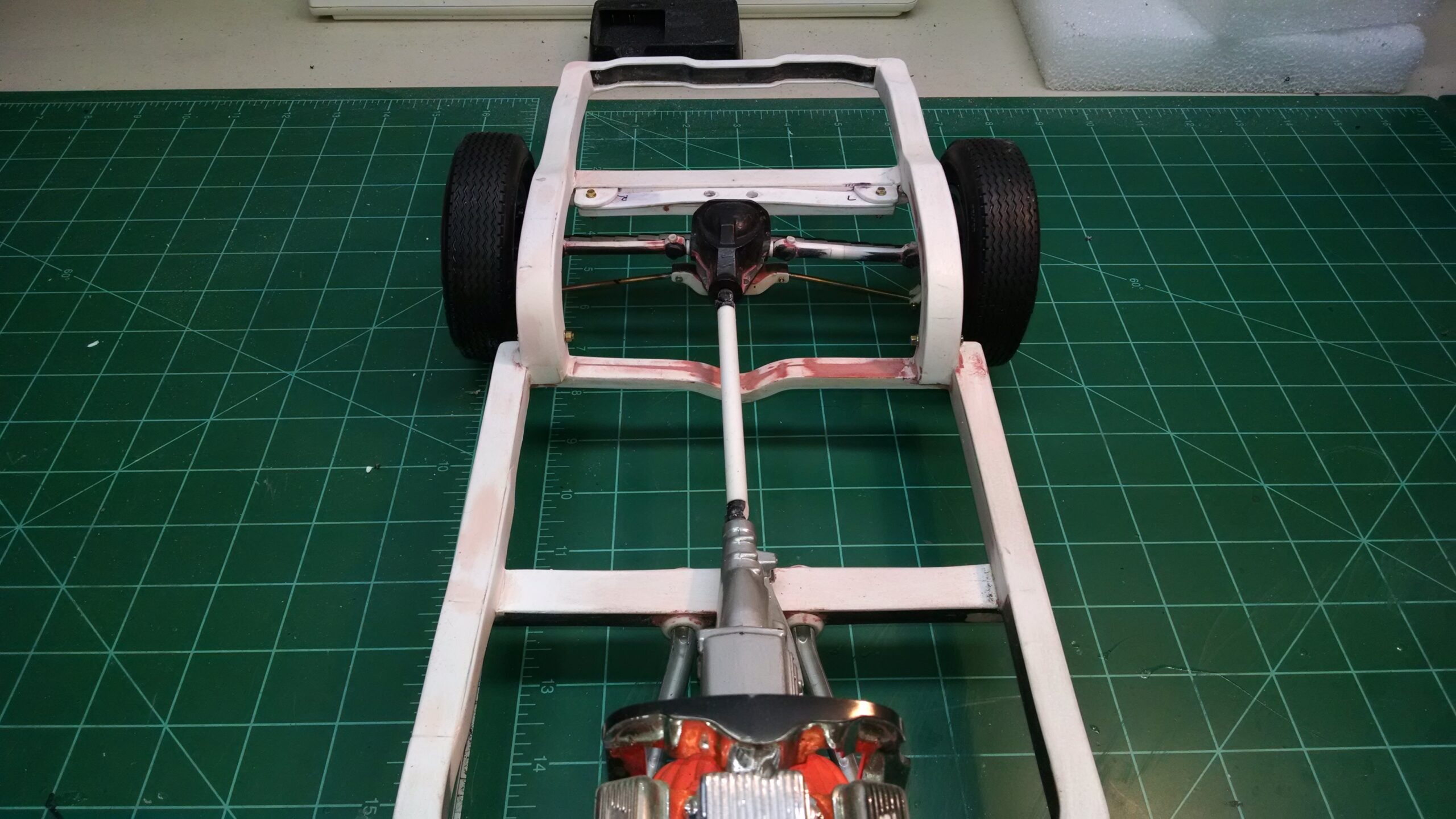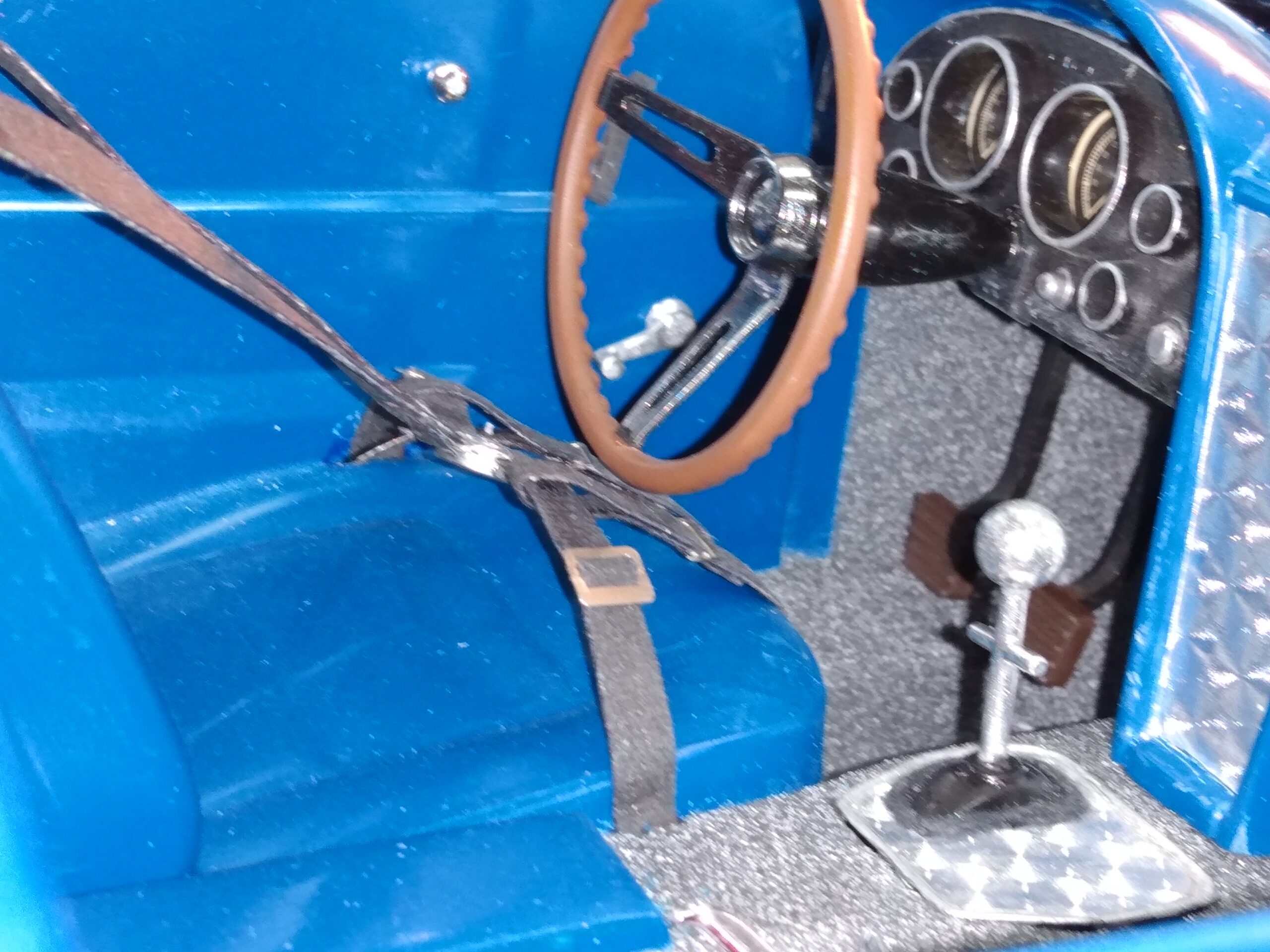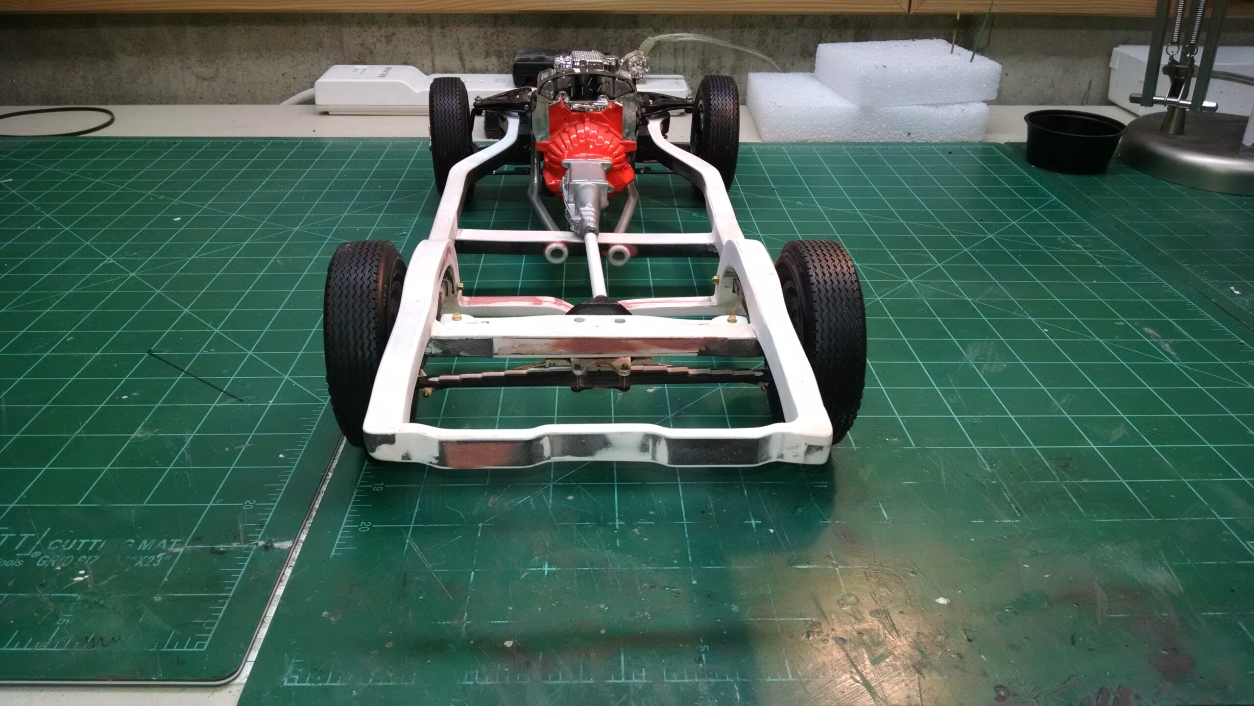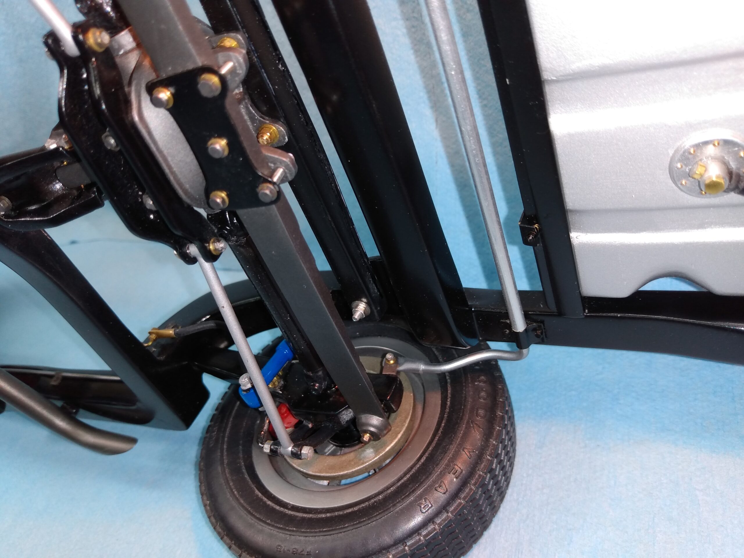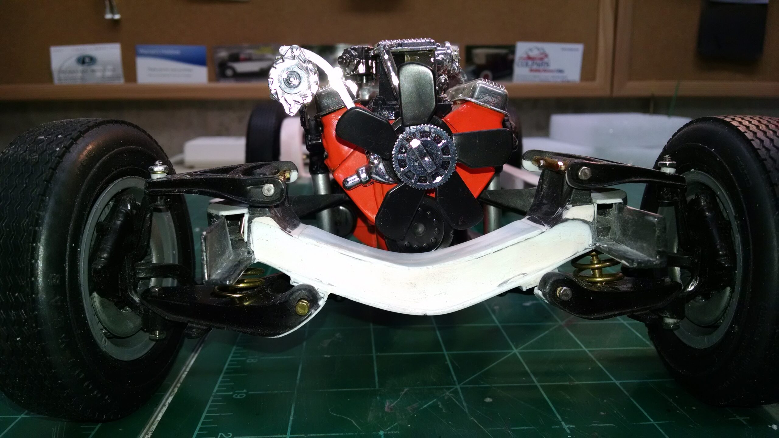 I've also been fascinated with the SCCA racecars. So, as I contemplated the necessary rebuild of my 1/8 scale 1965 Corvette model it became obvious to me what the theme should be. But, with minimal aftermarket running gear available, I knew that I had my work cut out to transform the platform-style frame and half-relief suspension of the original model into something that represented a real C2 racecar. Not shown are the steps taken to produce some realism into a the race theme: radio and heater deletes, filling in the rear-fascia exhaust body passthroughs, removal of the molded-in right seat. One of the biggest tasks was to remove, from the original platform frame unit, everything that does not exist in a C2 frame. My previous 1:1 experience, and several reference materials helped determine that path. Once completed, what I had left of the original platform required much fabrication to bring into being the basic frame foundation. Then on to the suspension fabrications and modifications, fuel tank fabrication (carved from a foam block and sealed), fuel and brake lines, battery and hold-down, engine detailing and radiator support. Detailing the cab into race trim proved to be tedious, but successful, with roll cage and racing harness, filling in the area of the removed seat with sheet plastic, and adding the removed lower cab details from the platform frame unit and grafting them onto the cab bucket, and then reshaping the drive tunnel. And, I purchased a very-rough set of scale American Torque-Thrust wheels, and converted them to true knockoff attachment to the hubs (I now observe that I did not remove the simulated lug-bolts in that conversion, which bothers me enough that I'll remedy that soon. Lots of work prepping those wheels since they were terrible resin-casts. MUCH work went into stripping the original body paint, then prepping, repainting, and polishing. I reached out to a custom decal maker for the race numbers and manufacturers race equipment decals (I tried to make them myself with decal paper and my ink-jet printer, only to create some real junk!).