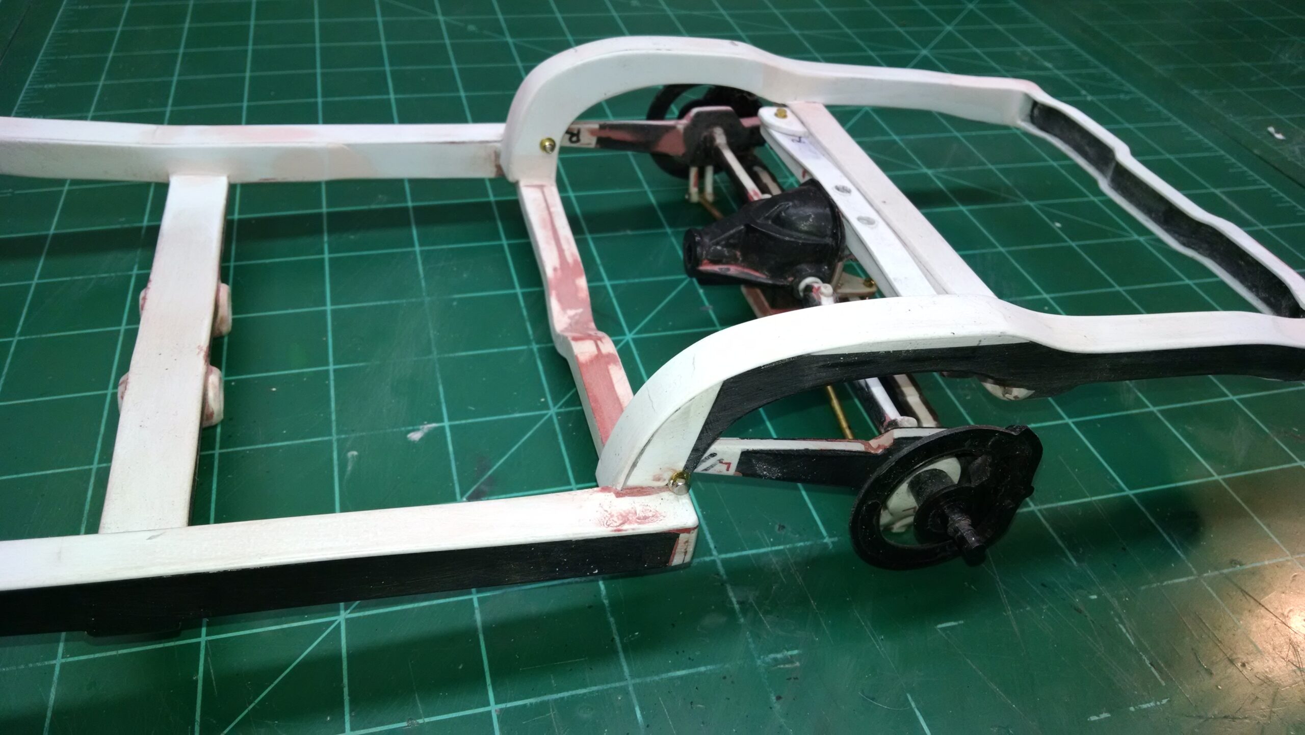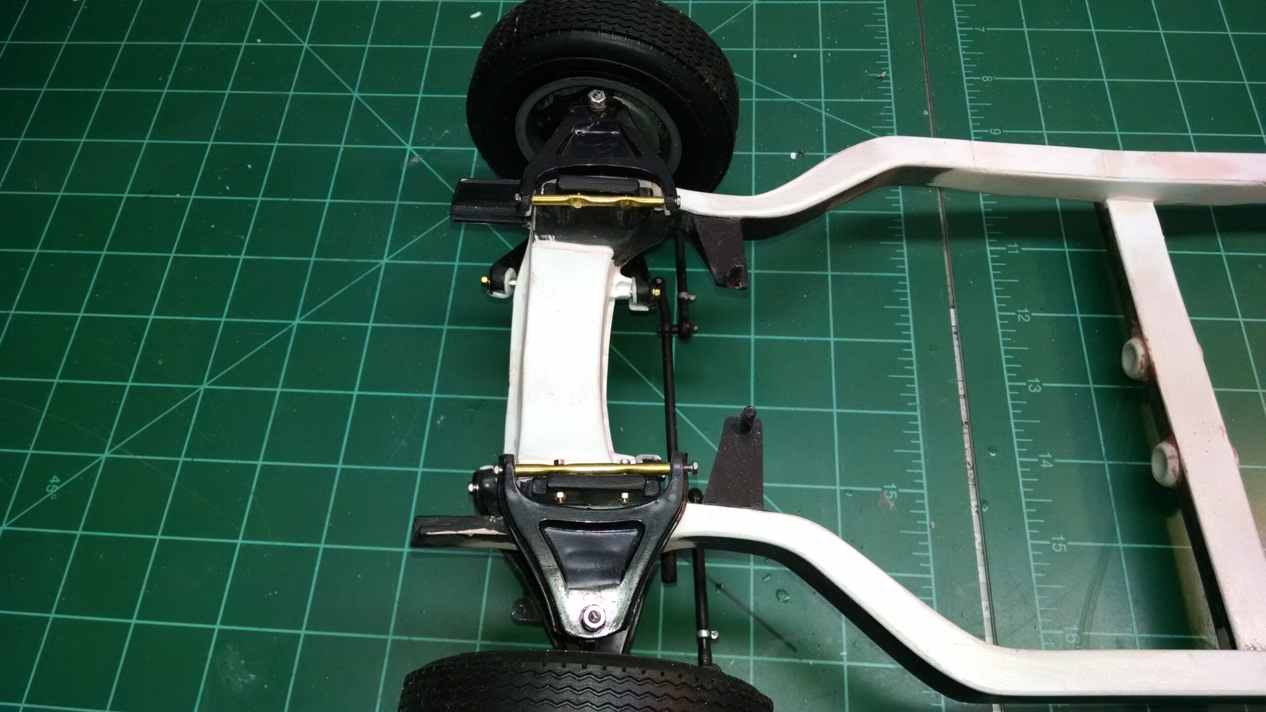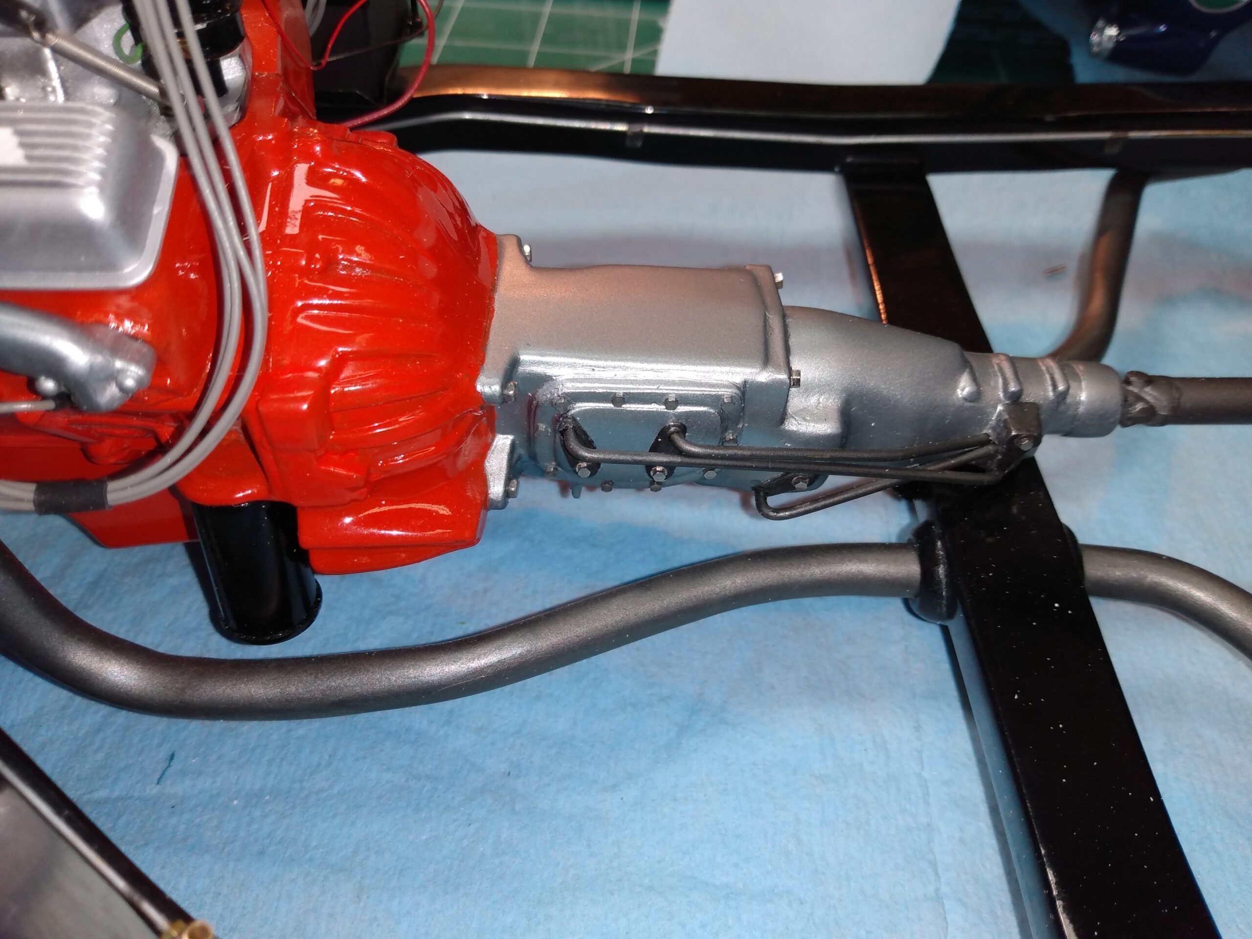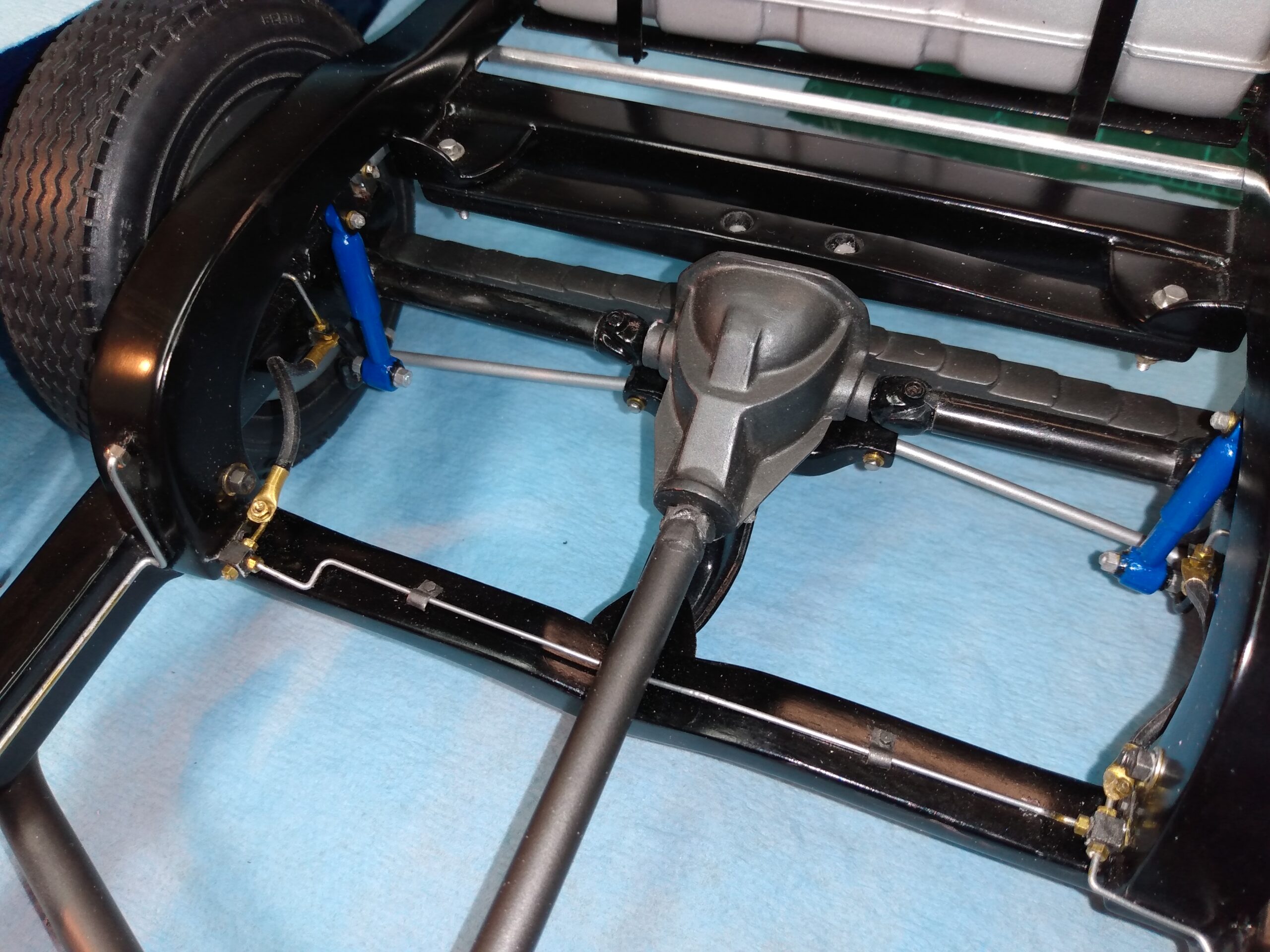 I've also been fascinated with the SCCA racecars. So, as I contemplated the necessary rebuild of my 1/8 scale 1965 Corvette model it became obvious to me what the theme should be. But, with minimal aftermarket running gear available, I knew that I had my work cut out to transform the platform-style frame and half-relief suspension of the original model into something that represented a real C2 racecar. Not shown are the steps taken to produce some realism into a the race theme: radio and heater deletes, filling in the rear-fascia exhaust body passthroughs, removal of the molded-in right seat. One of the biggest tasks was to remove, from the original platform frame unit, everything that does not exist in a C2 frame. My previous 1:1 experience, and several reference materials helped determine that path. Once completed, what I had left of the original platform required much fabrication to bring into being the basic frame foundation. Then on to the suspension fabrications and modifications, fuel tank fabrication (carved from a foam block and sealed), fuel and brake lines, battery and hold-down, engine detailing and radiator support. Detailing the cab into race trim proved to be tedious, but successful, with roll cage and racing harness, filling in the area of the removed seat with sheet plastic, and adding the removed lower cab details from the platform frame unit and grafting them onto the cab bucket, and then reshaping the drive tunnel. And, I purchased a very-rough set of scale American Torque-Thrust wheels, and converted them to true knockoff attachment to the hubs (I now observe that I did not remove the simulated lug-bolts in that conversion, which bothers me enough that I'll remedy that soon. Lots of work prepping those wheels since they were terrible resin-casts. MUCH work went into stripping the original body paint, then prepping, repainting, and polishing. I reached out to a custom decal maker for the race numbers and manufacturers race equipment decals (I tried to make them myself with decal paper and my ink-jet printer, only to create some real junk!).
