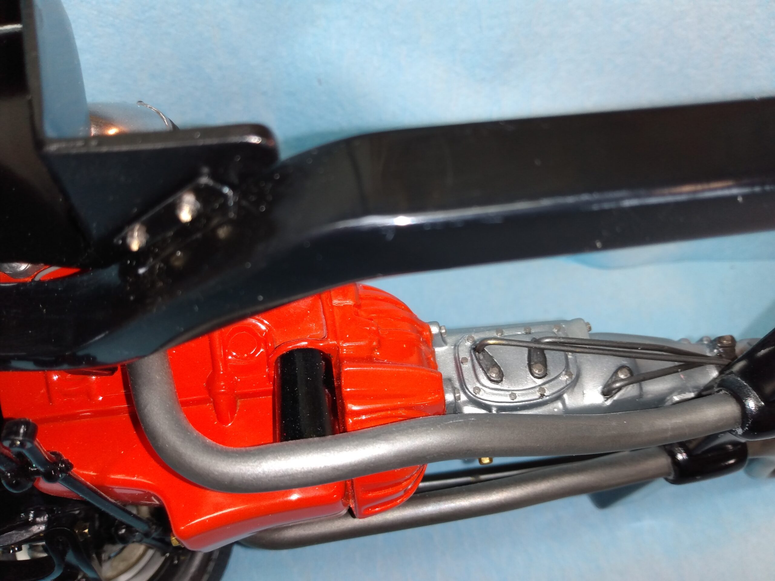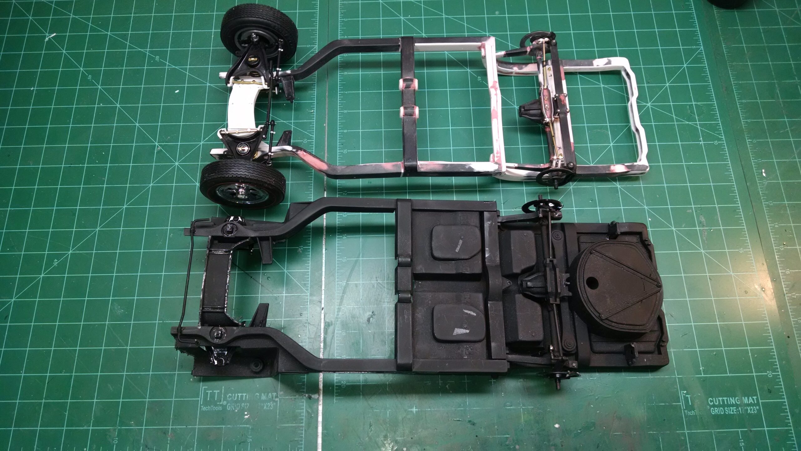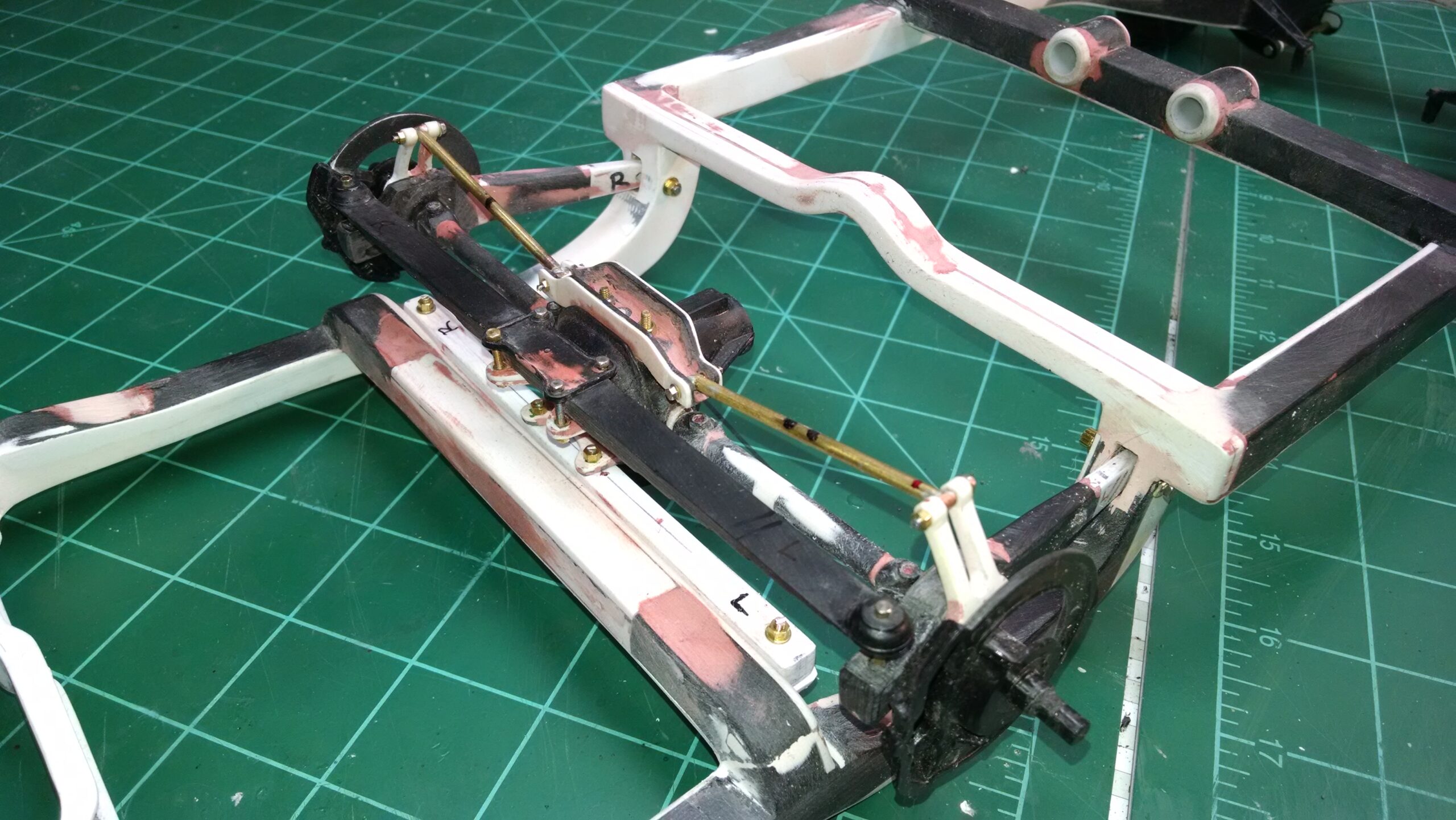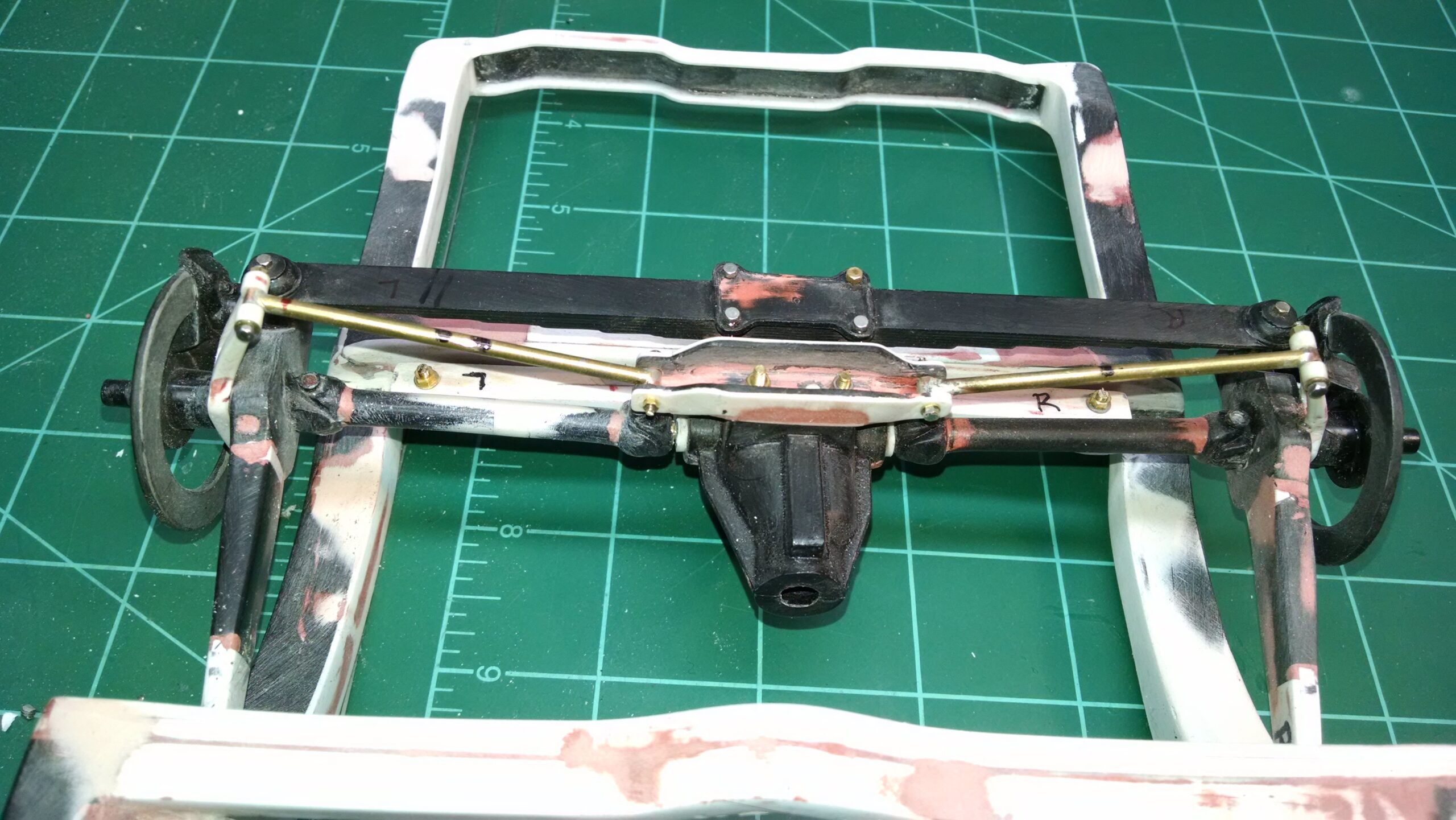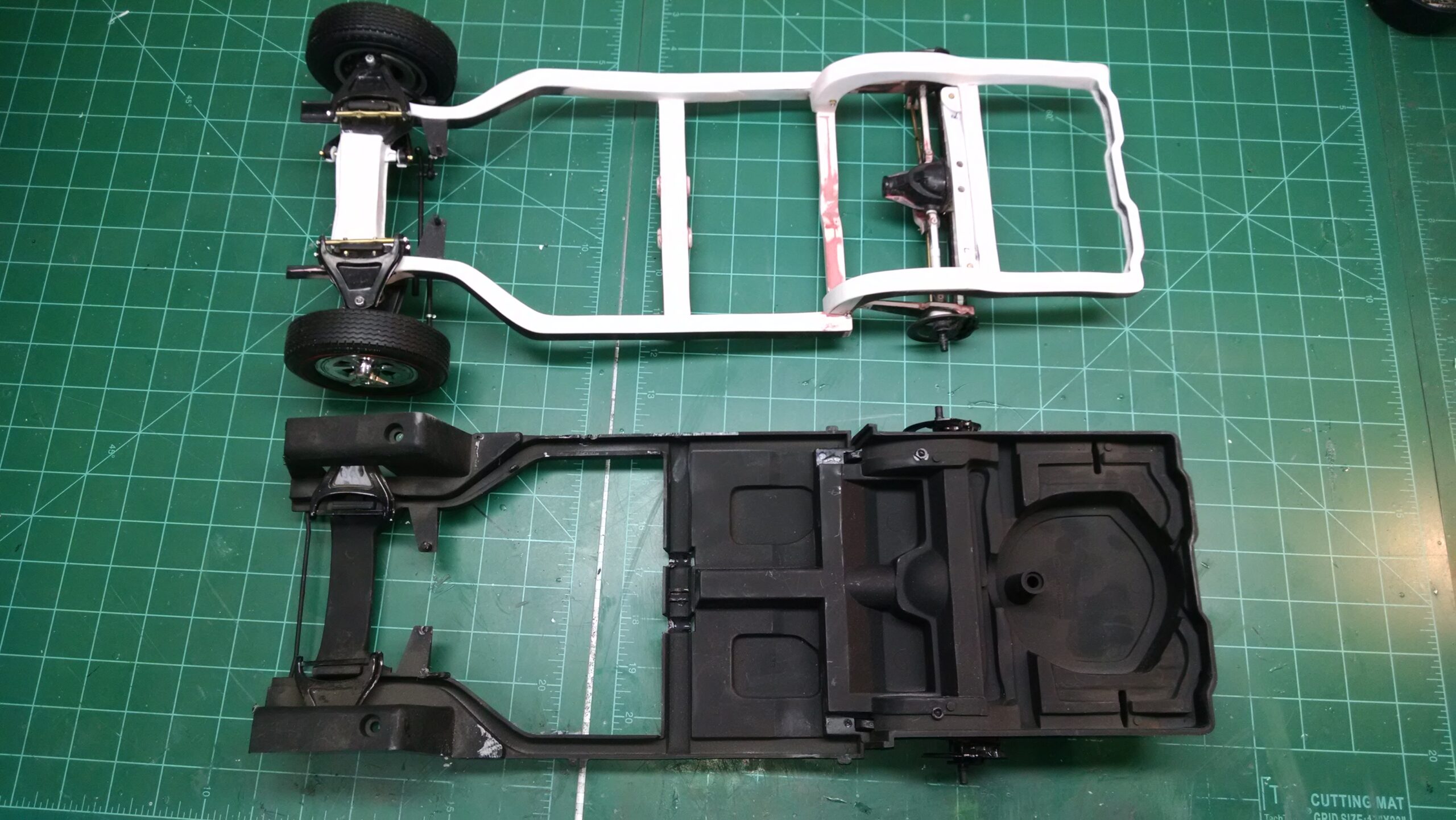 I've also been fascinated with the SCCA racecars. So, as I contemplated the necessary rebuild of my 1/8 scale 1965 Corvette model it became obvious to me what the theme should be. But, with minimal aftermarket running gear available, I knew that I had my work cut out to transform the platform-style frame and half-relief suspension of the original model into something that represented a real C2 racecar. Not shown are the steps taken to produce some realism into a the race theme: radio and heater deletes, filling in the rear-fascia exhaust body passthroughs, removal of the molded-in right seat. One of the biggest tasks was to remove, from the original platform frame unit, everything that does not exist in a C2 frame. My previous 1:1 experience, and several reference materials helped determine that path. Once completed, what I had left of the original platform required much fabrication to bring into being the basic frame foundation. Then on to the suspension fabrications and modifications, fuel tank fabrication (carved from a foam block and sealed), fuel and brake lines, battery and hold-down, engine detailing and radiator support. Detailing the cab into race trim proved to be tedious, but successful, with roll cage and racing harness, filling in the area of the removed seat with sheet plastic, and adding the removed lower cab details from the platform frame unit and grafting them onto the cab bucket, and then reshaping the drive tunnel. And, I purchased a very-rough set of scale American Torque-Thrust wheels, and converted them to true knockoff attachment to the hubs (I now observe that I did not remove the simulated lug-bolts in that conversion, which bothers me enough that I'll remedy that soon. Lots of work prepping those wheels since they were terrible resin-casts. MUCH work went into stripping the original body paint, then prepping, repainting, and polishing. I reached out to a custom decal maker for the race numbers and manufacturers race equipment decals (I tried to make them myself with decal paper and my ink-jet printer, only to create some real junk!).