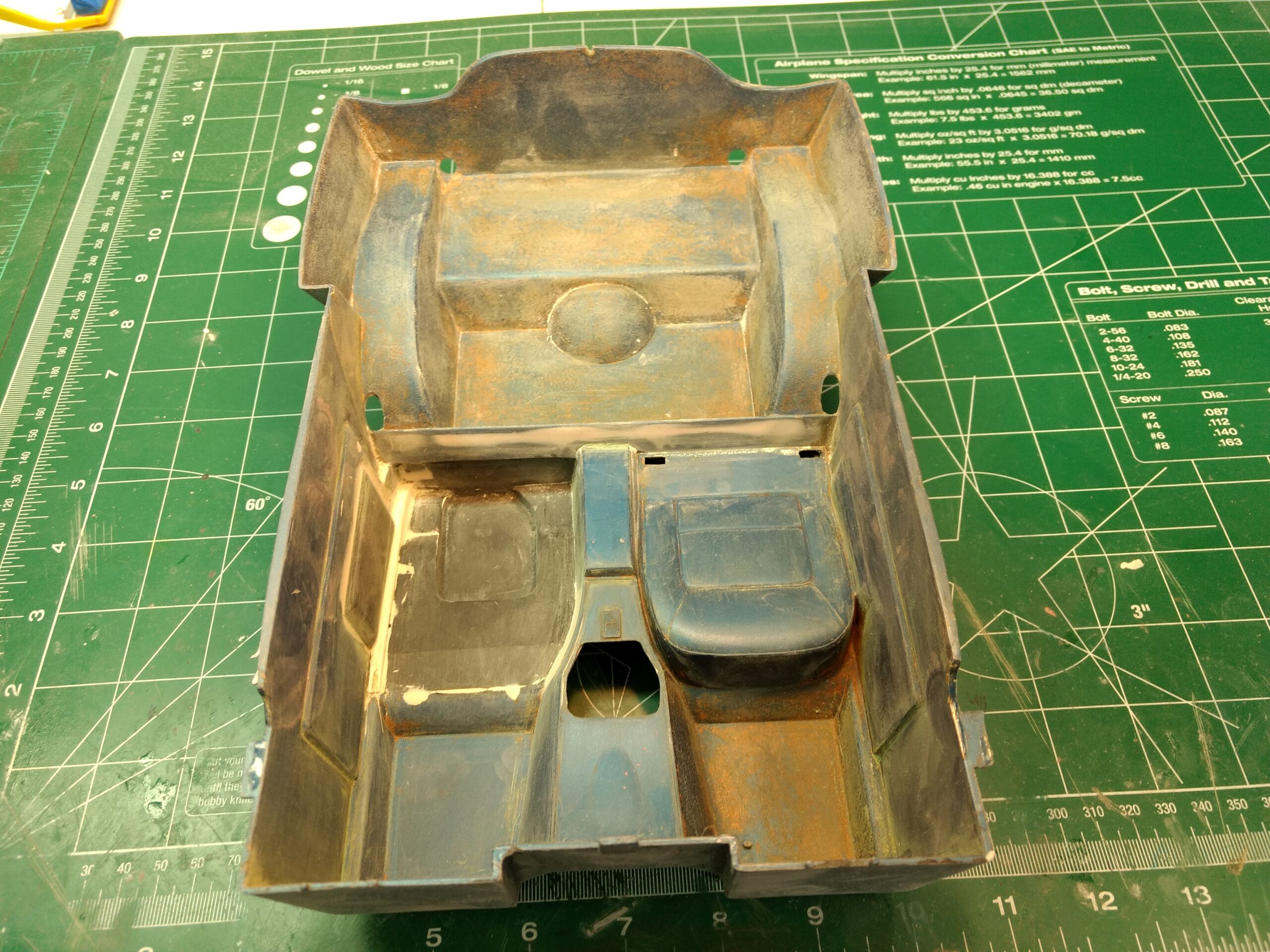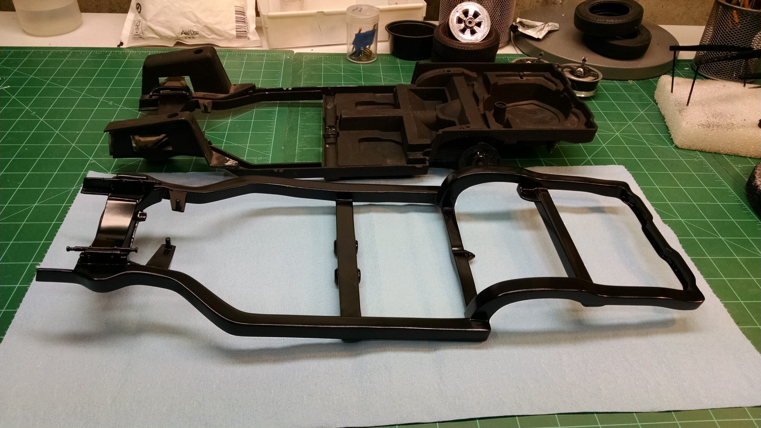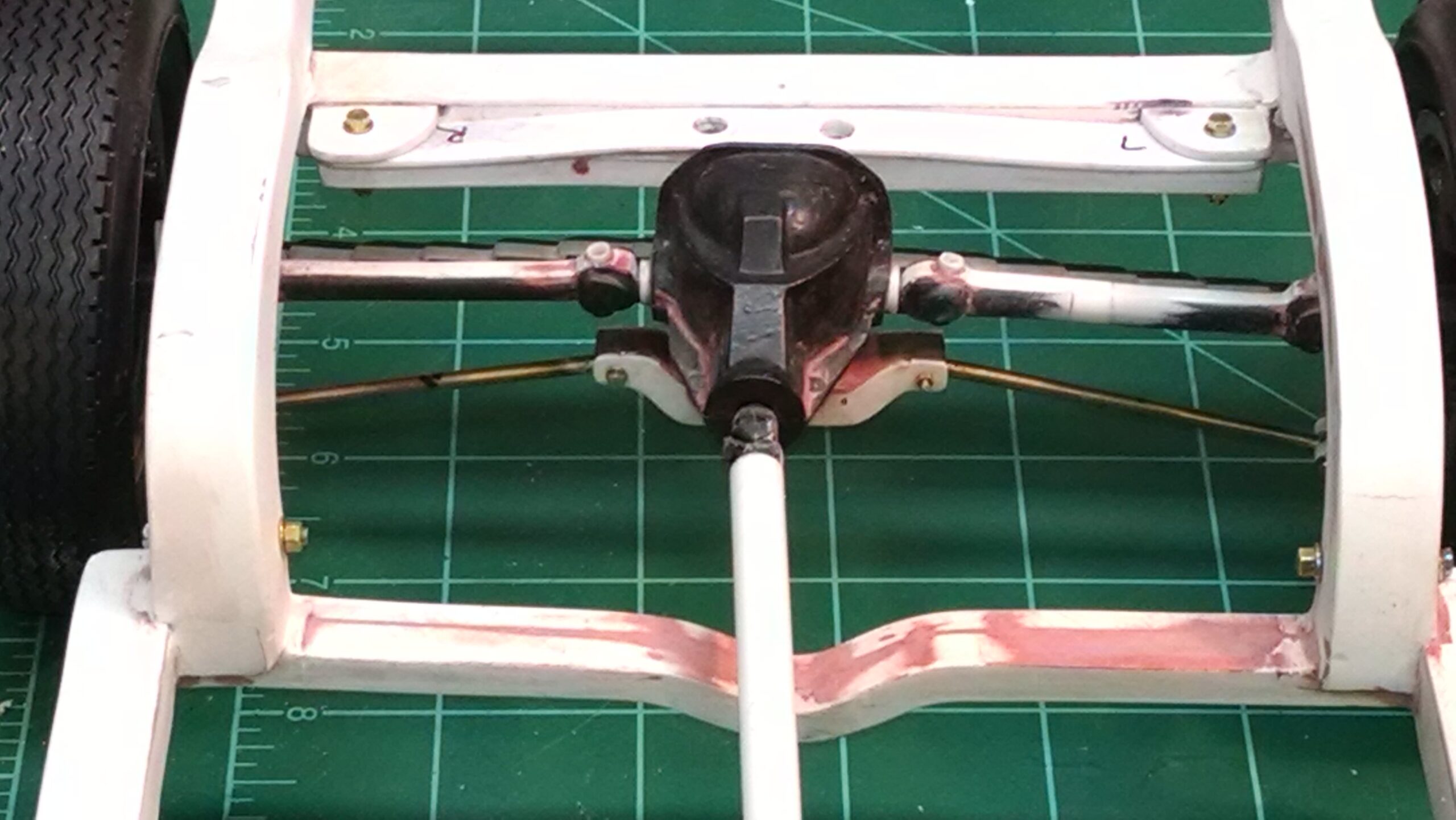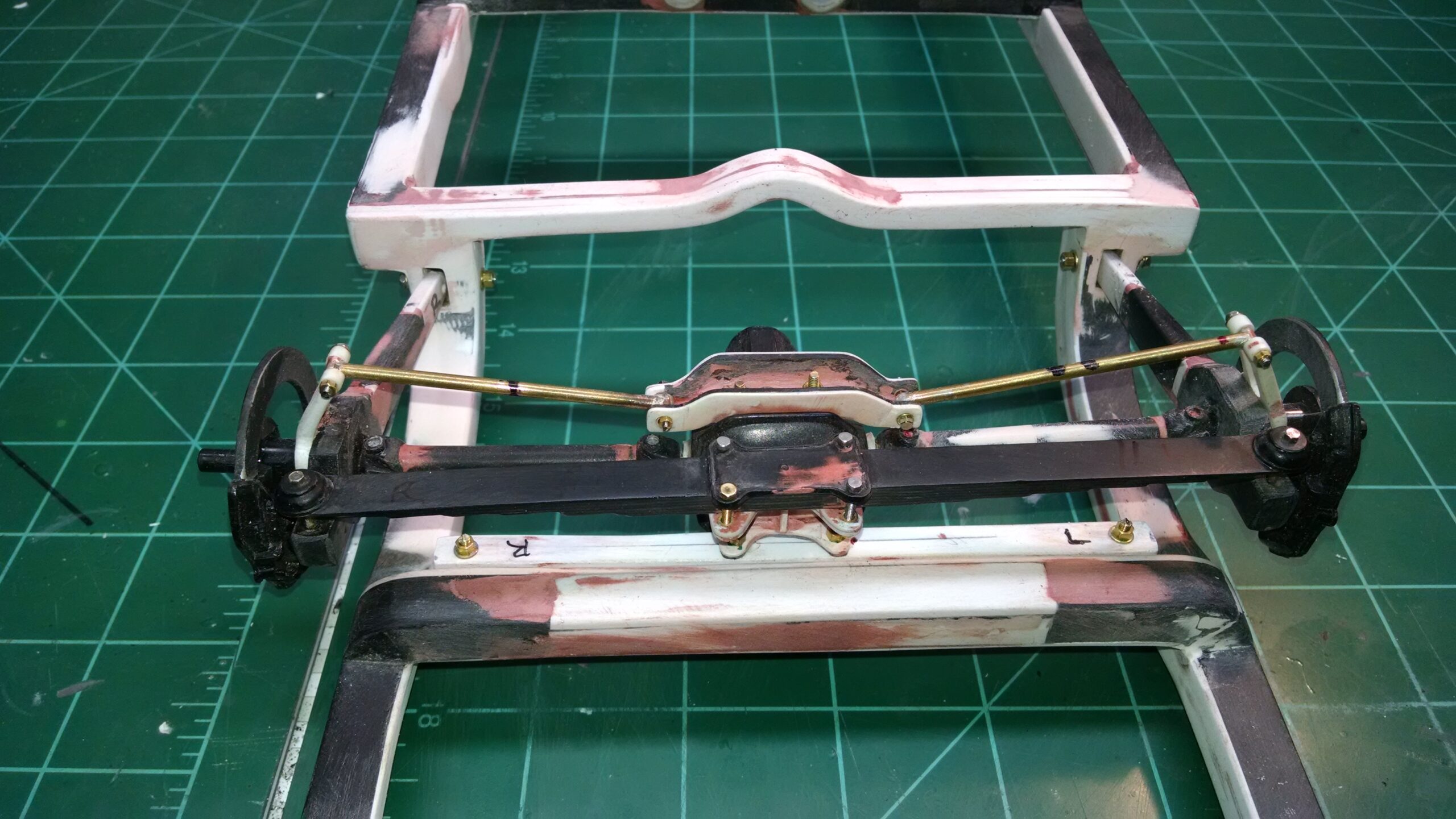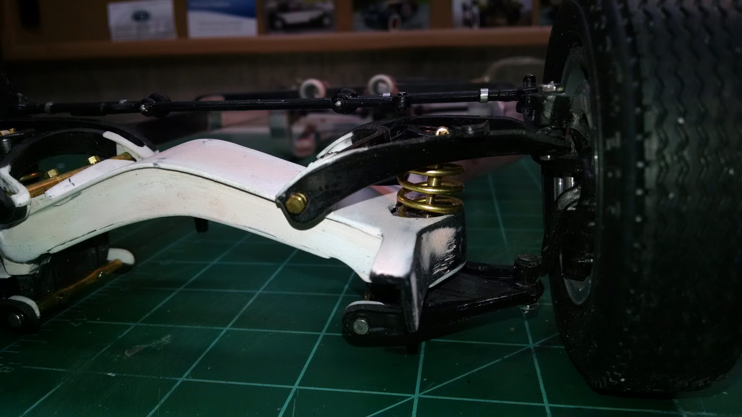 I've also been fascinated with the SCCA racecars. So, as I contemplated the necessary rebuild of my 1/8 scale 1965 Corvette model it became obvious to me what the theme should be. But, with minimal aftermarket running gear available, I knew that I had my work cut out to transform the platform-style frame and half-relief suspension of the original model into something that represented a real C2 racecar. Not shown are the steps taken to produce some realism into a the race theme: radio and heater deletes, filling in the rear-fascia exhaust body passthroughs, removal of the molded-in right seat. One of the biggest tasks was to remove, from the original platform frame unit, everything that does not exist in a C2 frame. My previous 1:1 experience, and several reference materials helped determine that path. Once completed, what I had left of the original platform required much fabrication to bring into being the basic frame foundation. Then on to the suspension fabrications and modifications, fuel tank fabrication (carved from a foam block and sealed), fuel and brake lines, battery and hold-down, engine detailing and radiator support. Detailing the cab into race trim proved to be tedious, but successful, with roll cage and racing harness, filling in the area of the removed seat with sheet plastic, and adding the removed lower cab details from the platform frame unit and grafting them onto the cab bucket, and then reshaping the drive tunnel. And, I purchased a very-rough set of scale American Torque-Thrust wheels, and converted them to true knockoff attachment to the hubs (I now observe that I did not remove the simulated lug-bolts in that conversion, which bothers me enough that I'll remedy that soon. Lots of work prepping those wheels since they were terrible resin-casts. MUCH work went into stripping the original body paint, then prepping, repainting, and polishing. I reached out to a custom decal maker for the race numbers and manufacturers race equipment decals (I tried to make them myself with decal paper and my ink-jet printer, only to create some real junk!).