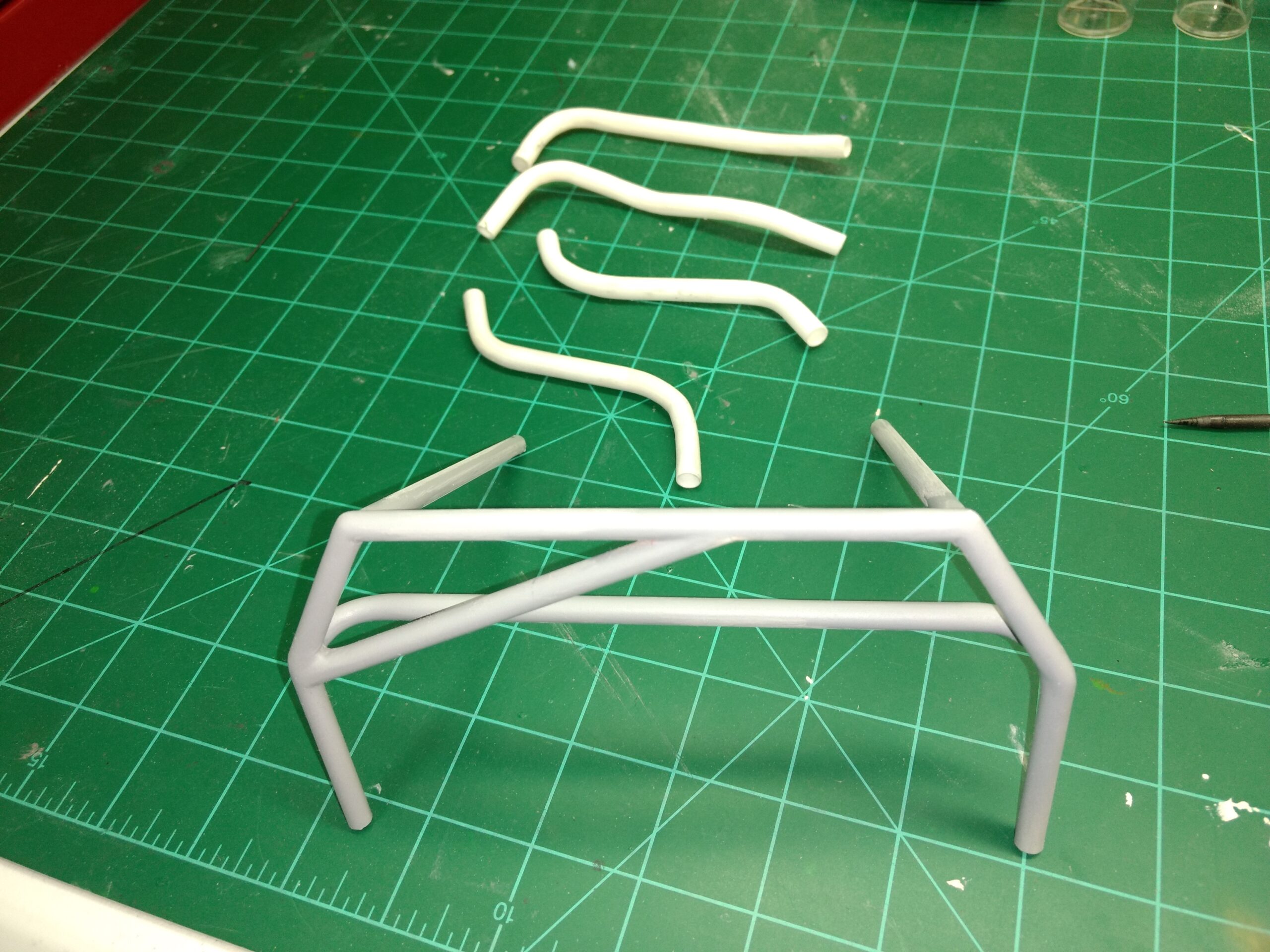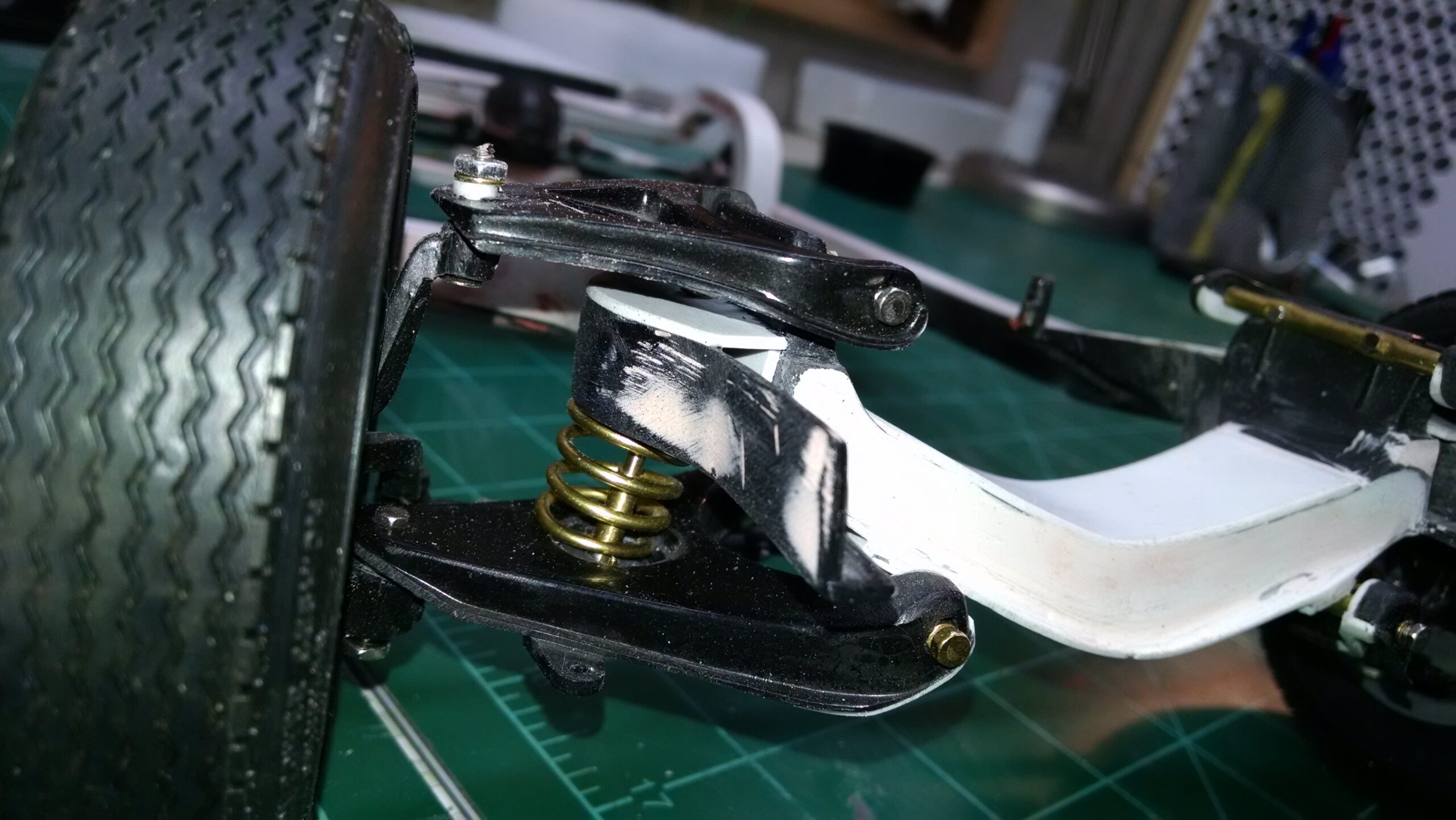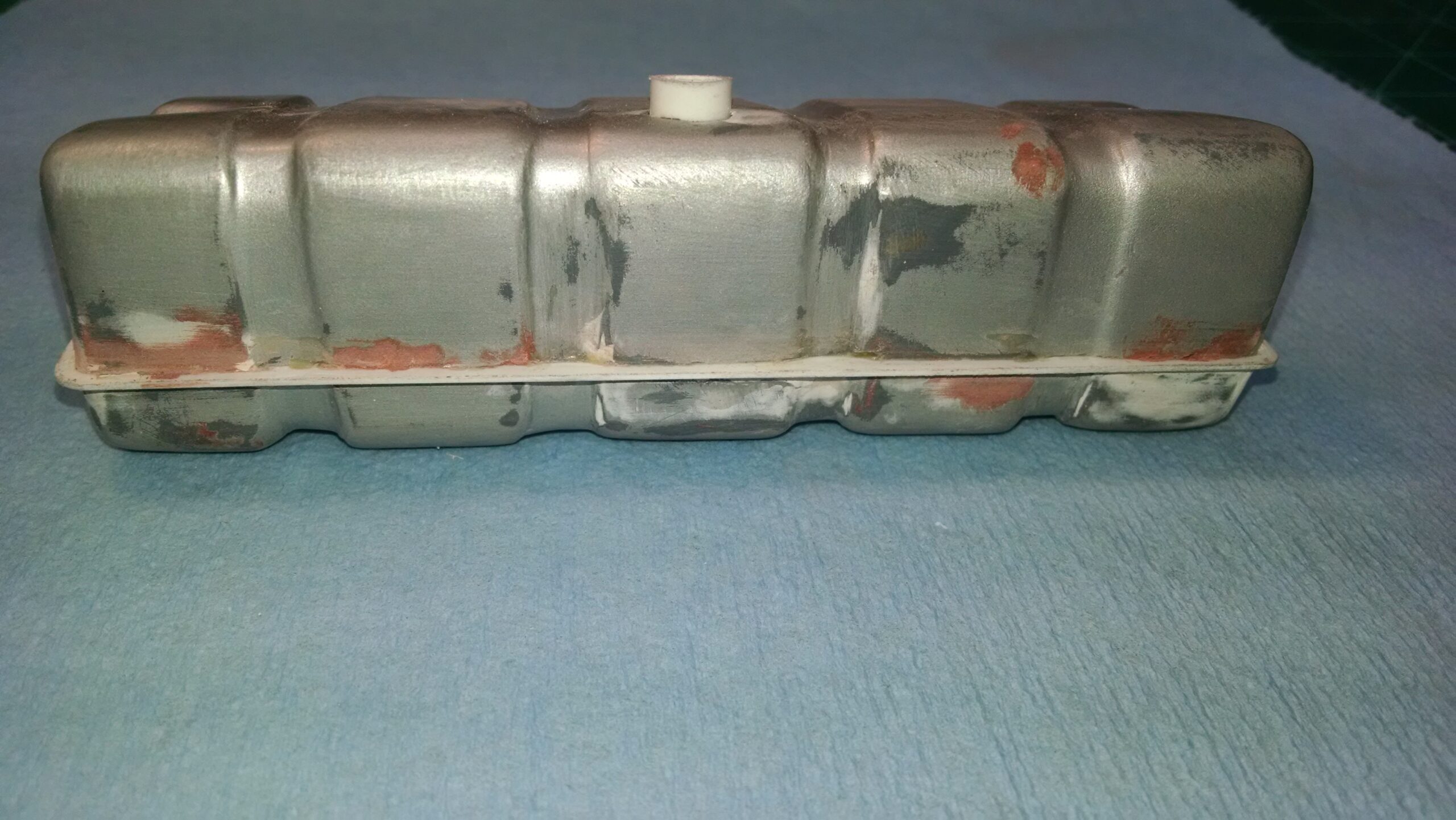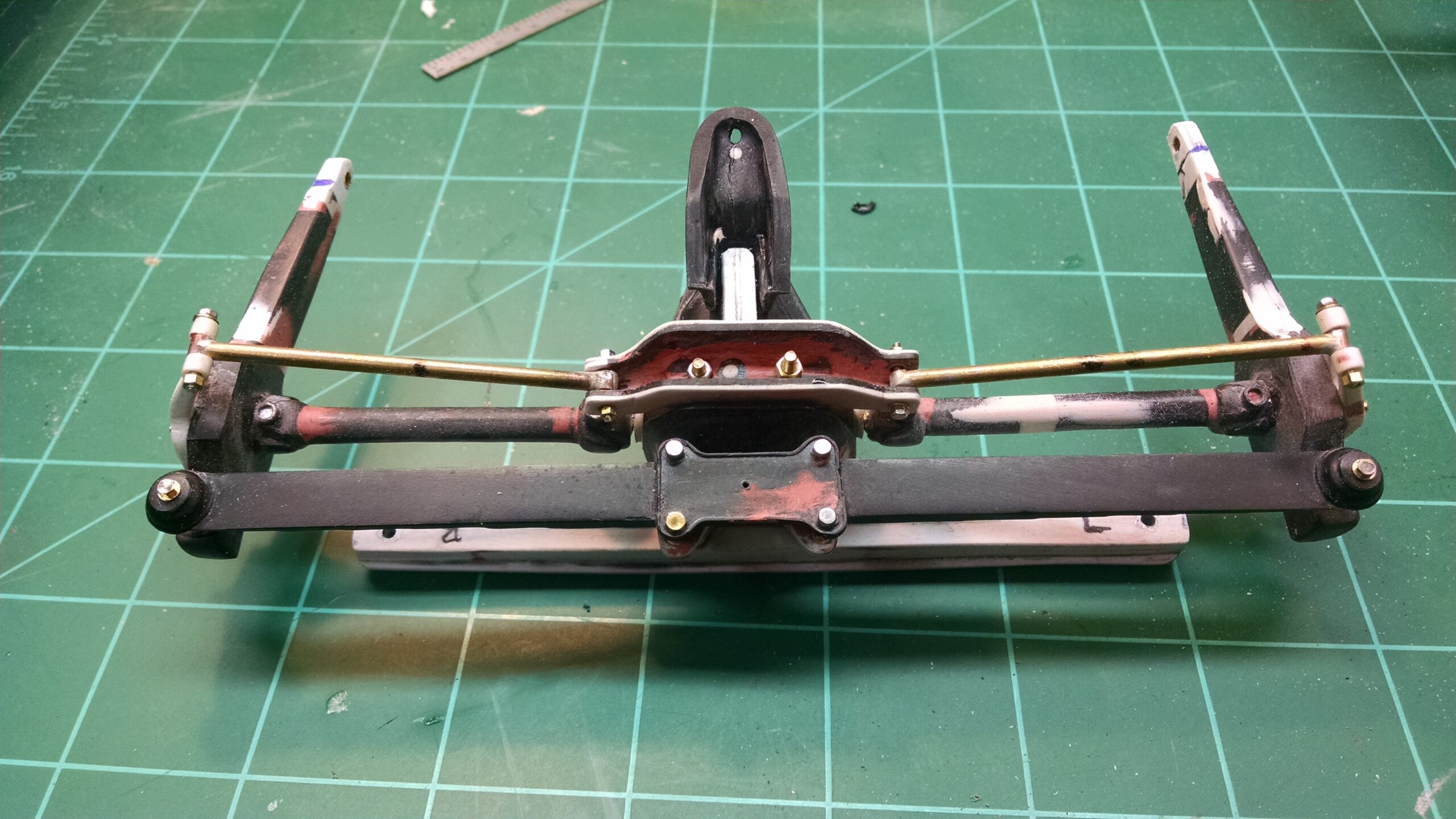 I've also been fascinated with the SCCA racecars. So, as I contemplated the necessary rebuild of my 1/8 scale 1965 Corvette model it became obvious to me what the theme should be. But, with minimal aftermarket running gear available, I knew that I had my work cut out to transform the platform-style frame and half-relief suspension of the original model into something that represented a real C2 racecar. Not shown are the steps taken to produce some realism into a the race theme: radio and heater deletes, filling in the rear-fascia exhaust body passthroughs, removal of the molded-in right seat. One of the biggest tasks was to remove, from the original platform frame unit, everything that does not exist in a C2 frame. My previous 1:1 experience, and several reference materials helped determine that path. Once completed, what I had left of the original platform required much fabrication to bring into being the basic frame foundation. Then on to the suspension fabrications and modifications, fuel tank fabrication (carved from a foam block and sealed), fuel and brake lines, battery and hold-down, engine detailing and radiator support. Detailing the cab into race trim proved to be tedious, but successful, with roll cage and racing harness, filling in the area of the removed seat with sheet plastic, and adding the removed lower cab details from the platform frame unit and grafting them onto the cab bucket, and then reshaping the drive tunnel. And, I purchased a very-rough set of scale American Torque-Thrust wheels, and converted them to true knockoff attachment to the hubs (I now observe that I did not remove the simulated lug-bolts in that conversion, which bothers me enough that I'll remedy that soon. Lots of work prepping those wheels since they were terrible resin-casts. MUCH work went into stripping the original body paint, then prepping, repainting, and polishing. I reached out to a custom decal maker for the race numbers and manufacturers race equipment decals (I tried to make them myself with decal paper and my ink-jet printer, only to create some real junk!).