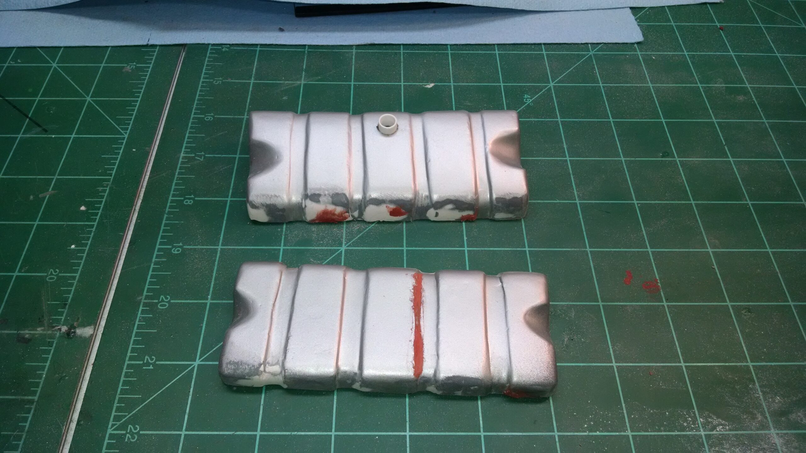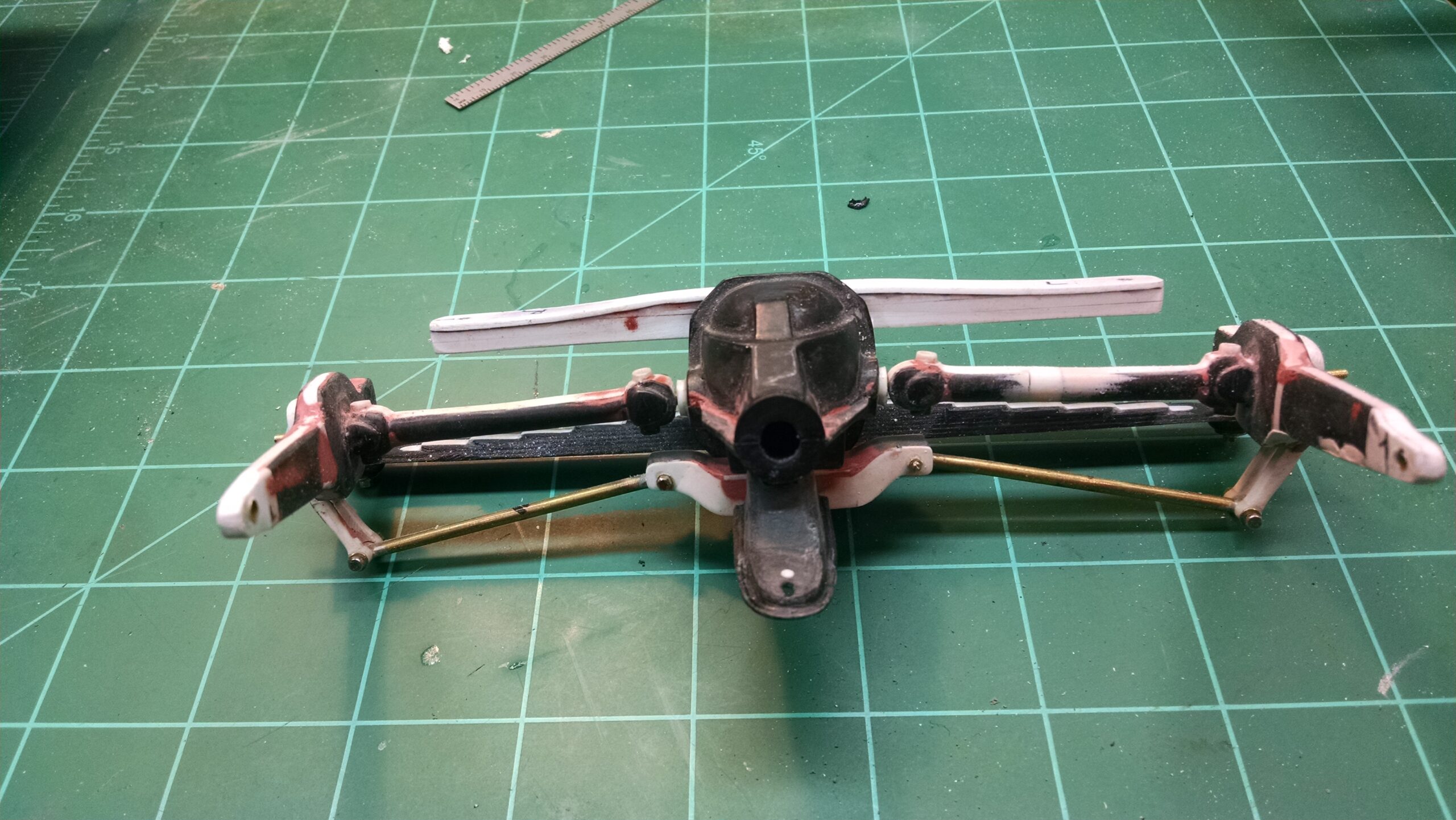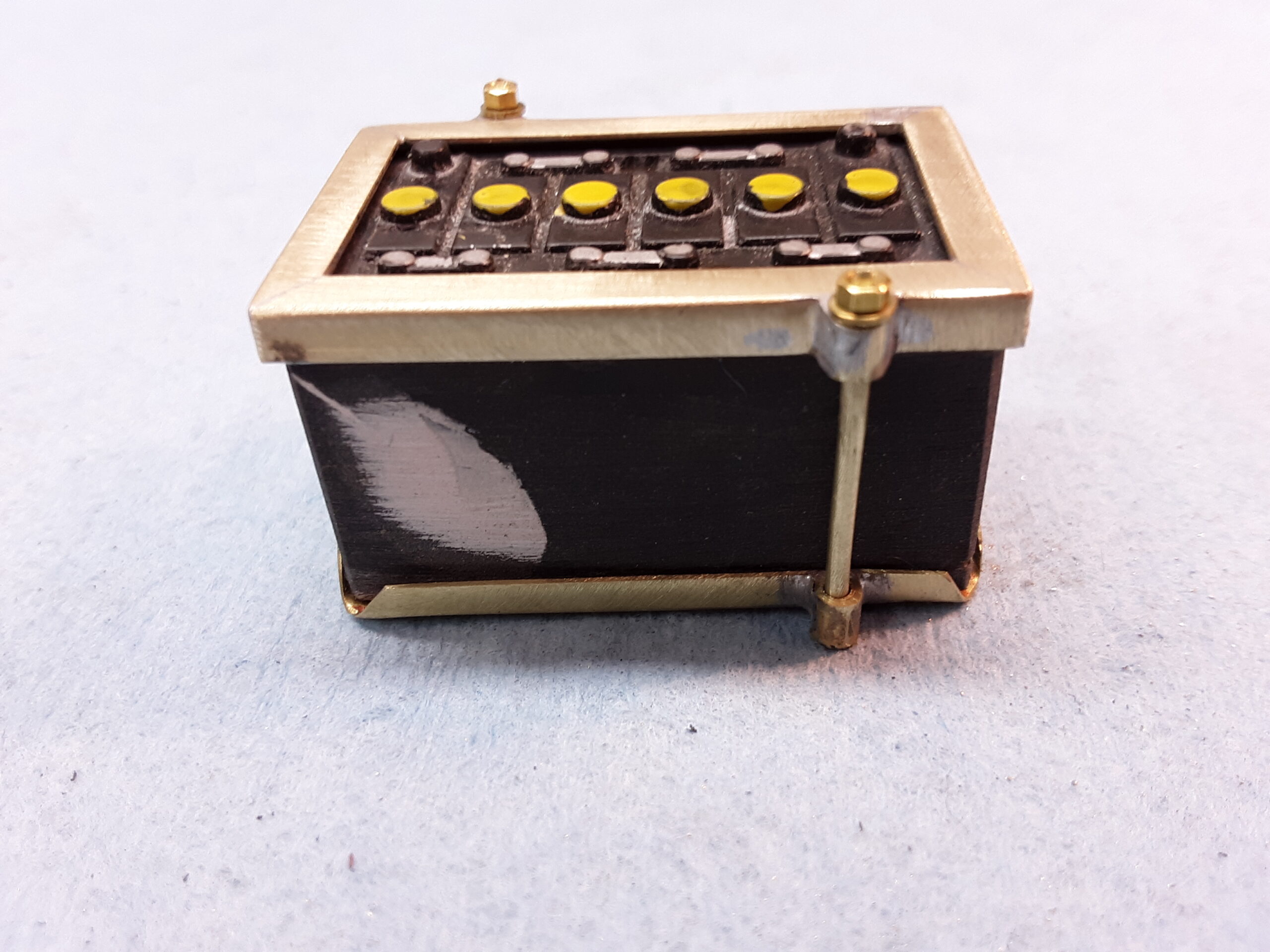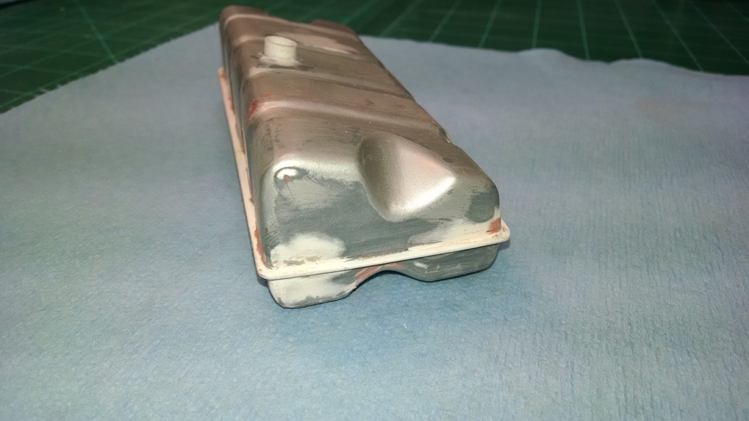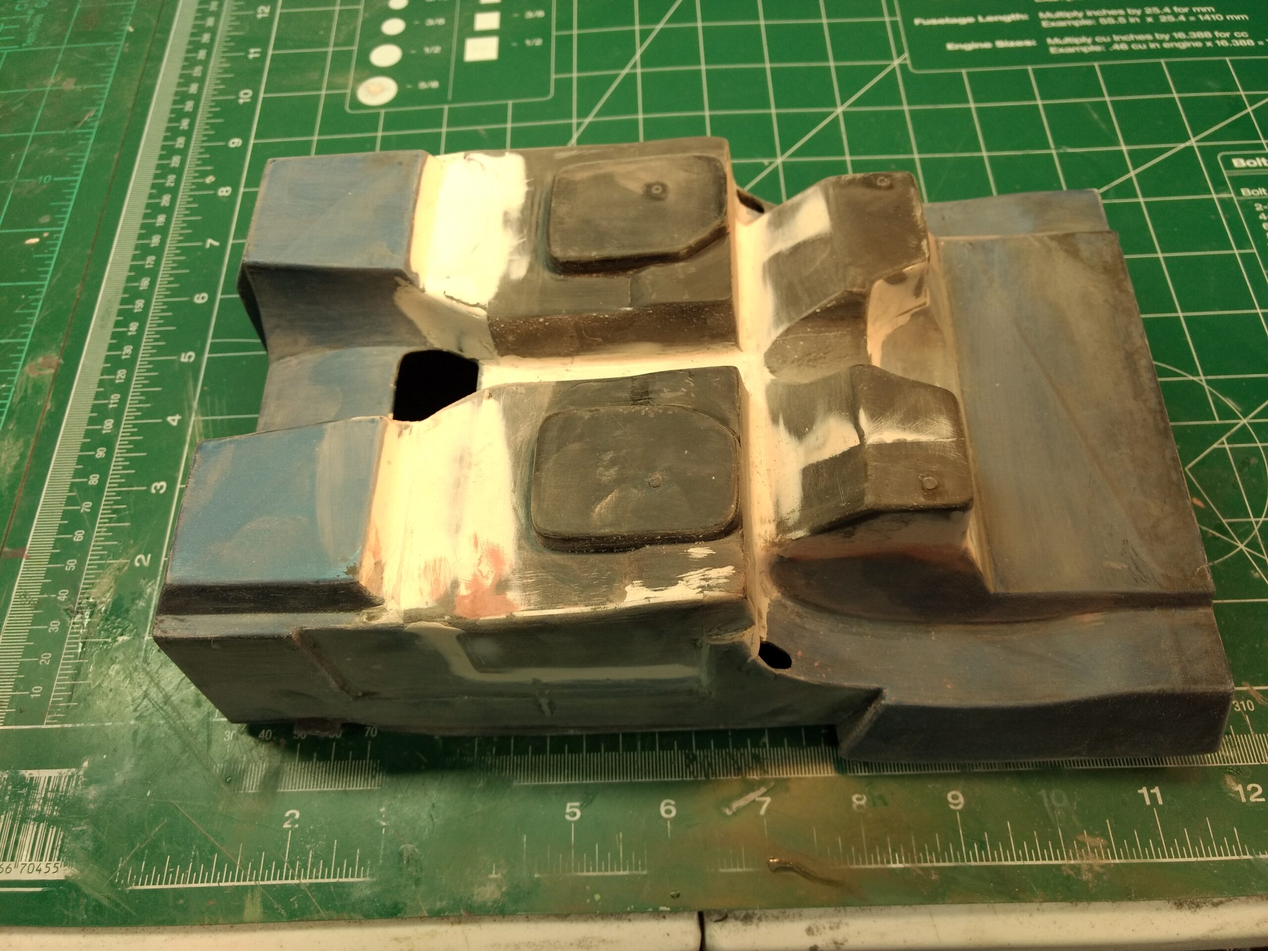 I've also been fascinated with the SCCA racecars. So, as I contemplated the necessary rebuild of my 1/8 scale 1965 Corvette model it became obvious to me what the theme should be. But, with minimal aftermarket running gear available, I knew that I had my work cut out to transform the platform-style frame and half-relief suspension of the original model into something that represented a real C2 racecar. Not shown are the steps taken to produce some realism into a the race theme: radio and heater deletes, filling in the rear-fascia exhaust body passthroughs, removal of the molded-in right seat. One of the biggest tasks was to remove, from the original platform frame unit, everything that does not exist in a C2 frame. My previous 1:1 experience, and several reference materials helped determine that path. Once completed, what I had left of the original platform required much fabrication to bring into being the basic frame foundation. Then on to the suspension fabrications and modifications, fuel tank fabrication (carved from a foam block and sealed), fuel and brake lines, battery and hold-down, engine detailing and radiator support. Detailing the cab into race trim proved to be tedious, but successful, with roll cage and racing harness, filling in the area of the removed seat with sheet plastic, and adding the removed lower cab details from the platform frame unit and grafting them onto the cab bucket, and then reshaping the drive tunnel. And, I purchased a very-rough set of scale American Torque-Thrust wheels, and converted them to true knockoff attachment to the hubs (I now observe that I did not remove the simulated lug-bolts in that conversion, which bothers me enough that I'll remedy that soon. Lots of work prepping those wheels since they were terrible resin-casts. MUCH work went into stripping the original body paint, then prepping, repainting, and polishing. I reached out to a custom decal maker for the race numbers and manufacturers race equipment decals (I tried to make them myself with decal paper and my ink-jet printer, only to create some real junk!).