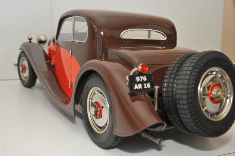 An additional challenge with the Bugatti kits is that, like the Star of India Rolls-Royce, the prototypes threaten to kill creativity. Of the handful of coupé bodies erected on the Type 50 chassis, only three or four were of the "Profilé" style, with the distinctive laid-back windshield and famous Jean Bugatti-designed front wings. Of this tiny number, only two survive, one in yellow and one in red, and the red one started as a Type 46 (single camshaft, wire wheels). Many Bugatti enthusiasts can recite the chassis numbers of these cars, which only adds more pressure to model builders who are sensitive to such things. It is a delight to see a Type 50 built by someone willing to take a chance on painting a Bugatti 'outside the box', as the current phrase goes. Instead of changing the color sweep on the body, Ronzetti has chosen a much more unusual approach by substituting a color for the black background. The result is that the model is unique yet maintains a gratifying connection with its era. A matching interior pulls the design together, and the result is harmonious yet striking.