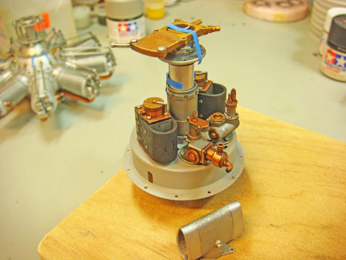 The Hasegawa 1/8 scale Clerget 9b Rotary Engine was originally issued around 1986, and since then has seen several re-boxings with the latest coming out ca. 2011. It’s not a “bad” kit, but it was and still is a bit dated and over-simplified. The original engine was rated at about 130 hp. and was used on the famous Sopwith Camel of WWI. Despite its appearance, it’s not a radial-type engine, but rather a rotary-type in which the entire crankcase and the cylinders rotate with the attached propeller. The Clerget 9B also employed a total loss oil system that injected castor oil into the air-fuel mix in order to lubricate the internals (with the crankcase acting as the intake manifold and the exhaust ported directly from the cylinder heads). Castor oil was less soluble in the aviation gasoline, so it retained its lubricating properties better than using a petroleum based oil in the same type of system.