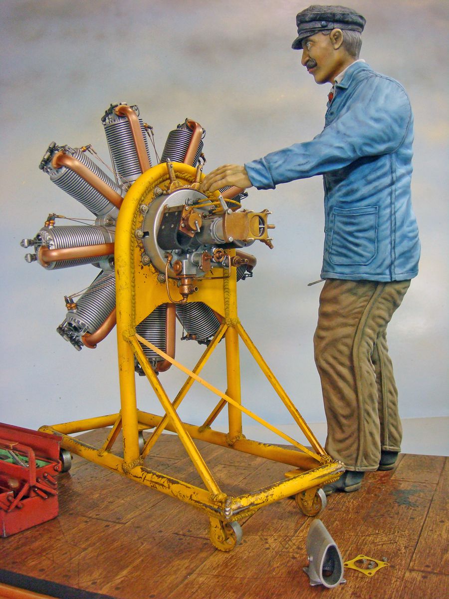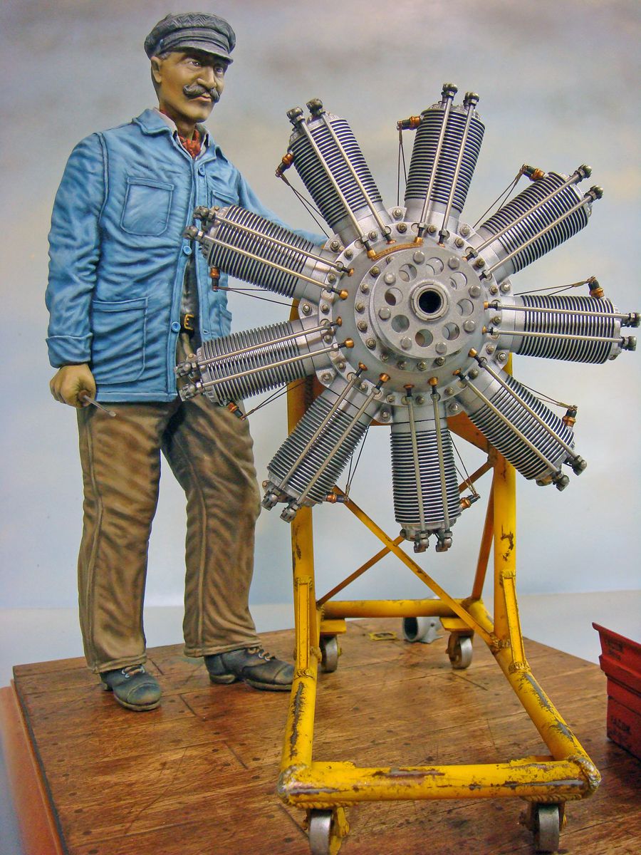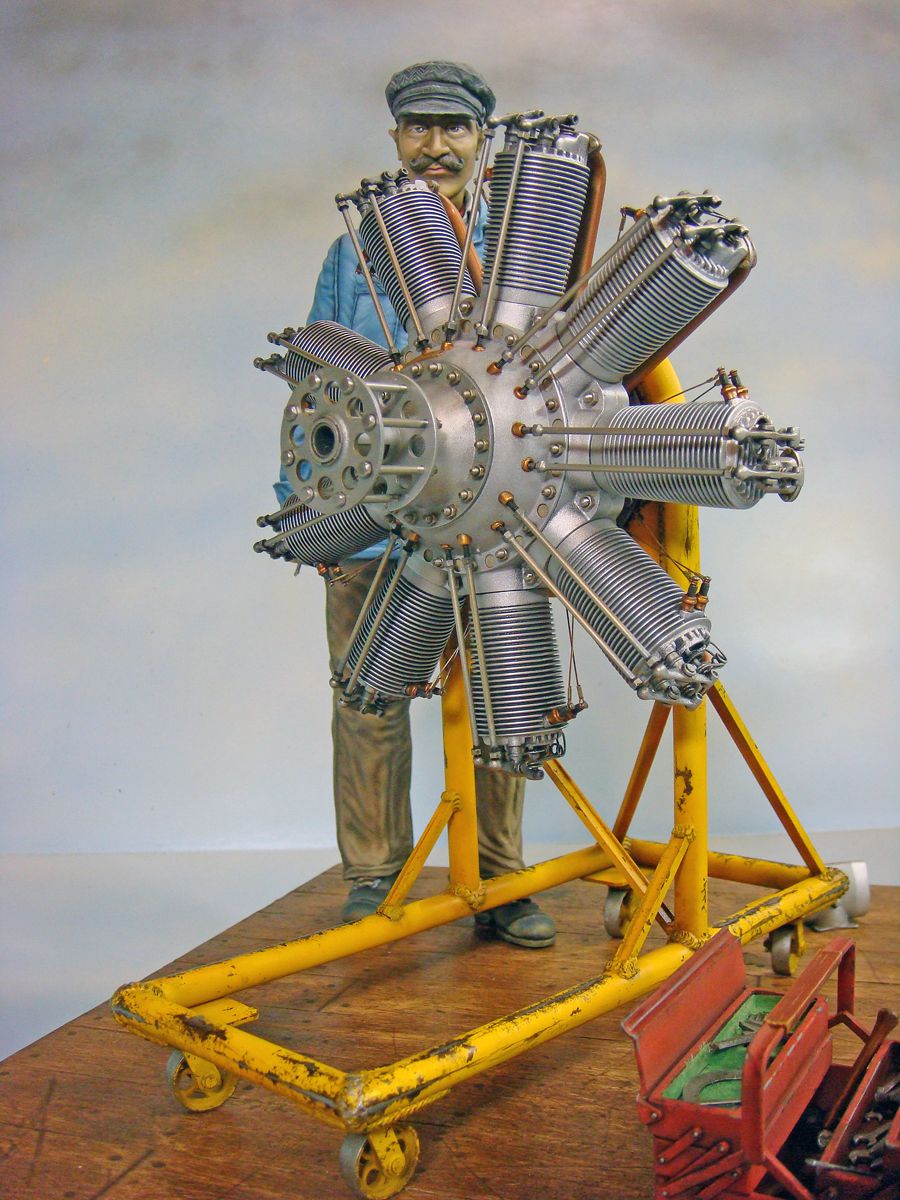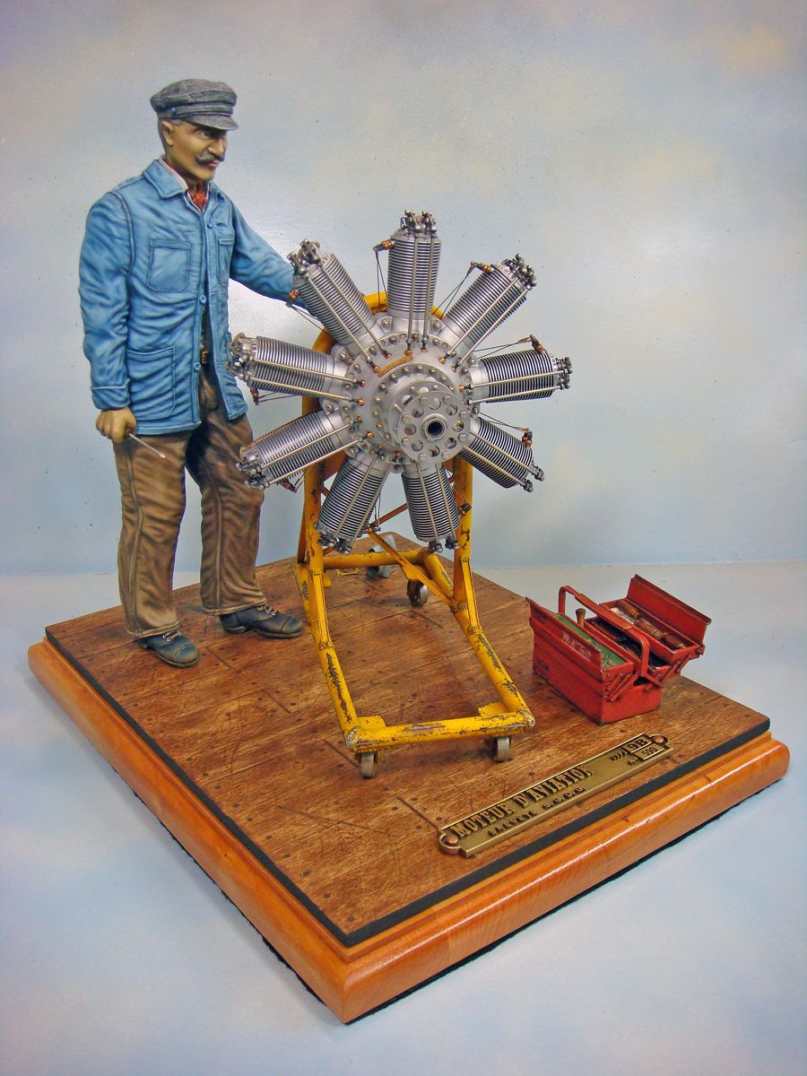 The 1/8 scale figure was an original CAD sculpt and 3D print done by my friend, Luis Hidalgo, who has a particular talent for such work. Luis based the figure on a number of period photos of French factory workers in order to get the clothing details correct. After assembly and preparation, I painted the figure by undercoating it in acrylics and then doing the actual painting using artist oils. The engine stand was scratch-built from styrene stock with two-part epoxy putty for the weld beads and more 3D printed parts for the castor wheels. The tools and tool box were also 3D printed designs. The display base was “planked” to replicate a wooden factory floor using wood veneer shelf edging with round toothpick “pegs.” The title plate was an enlarged version of the same 3D printed engine data plate made for the actual model.