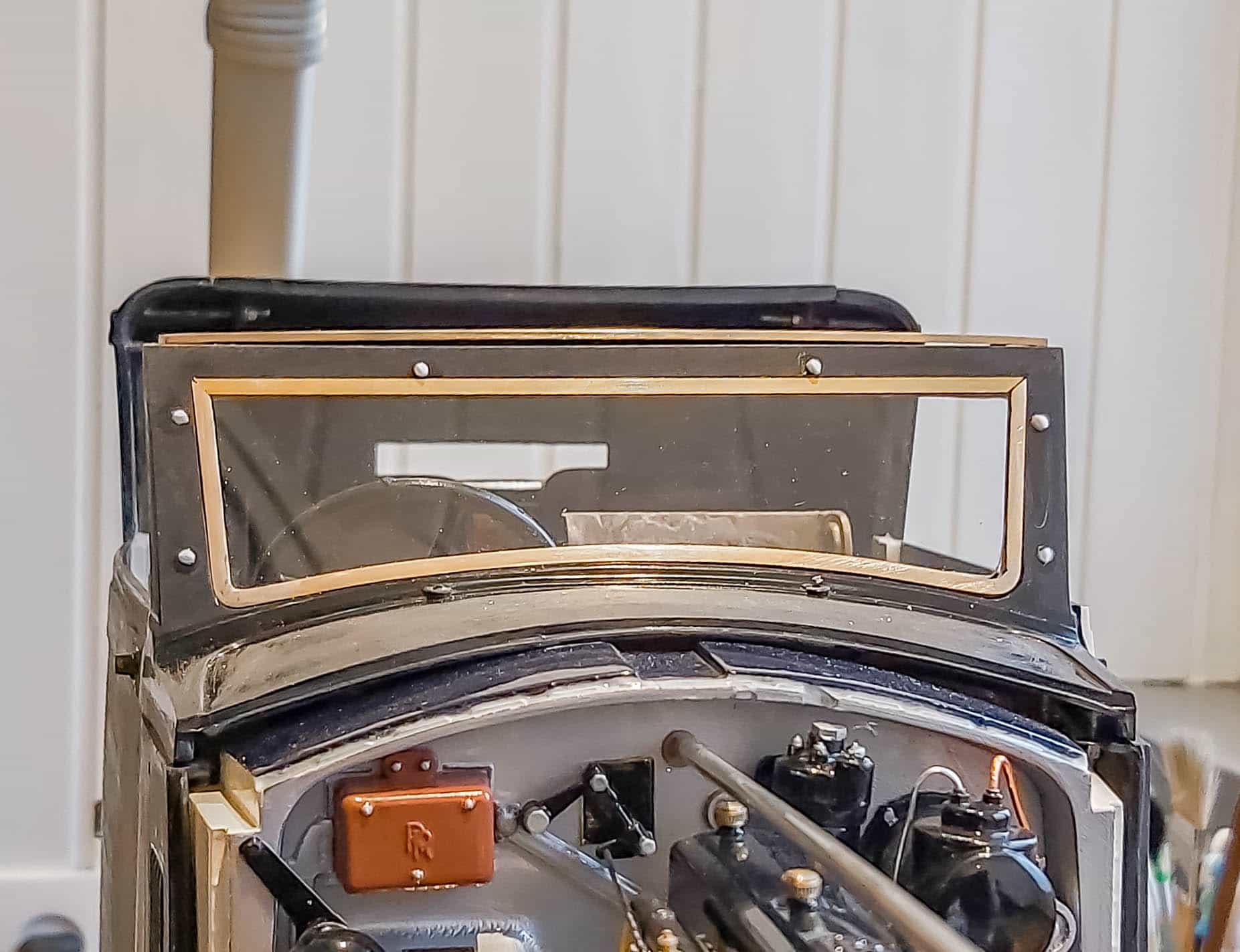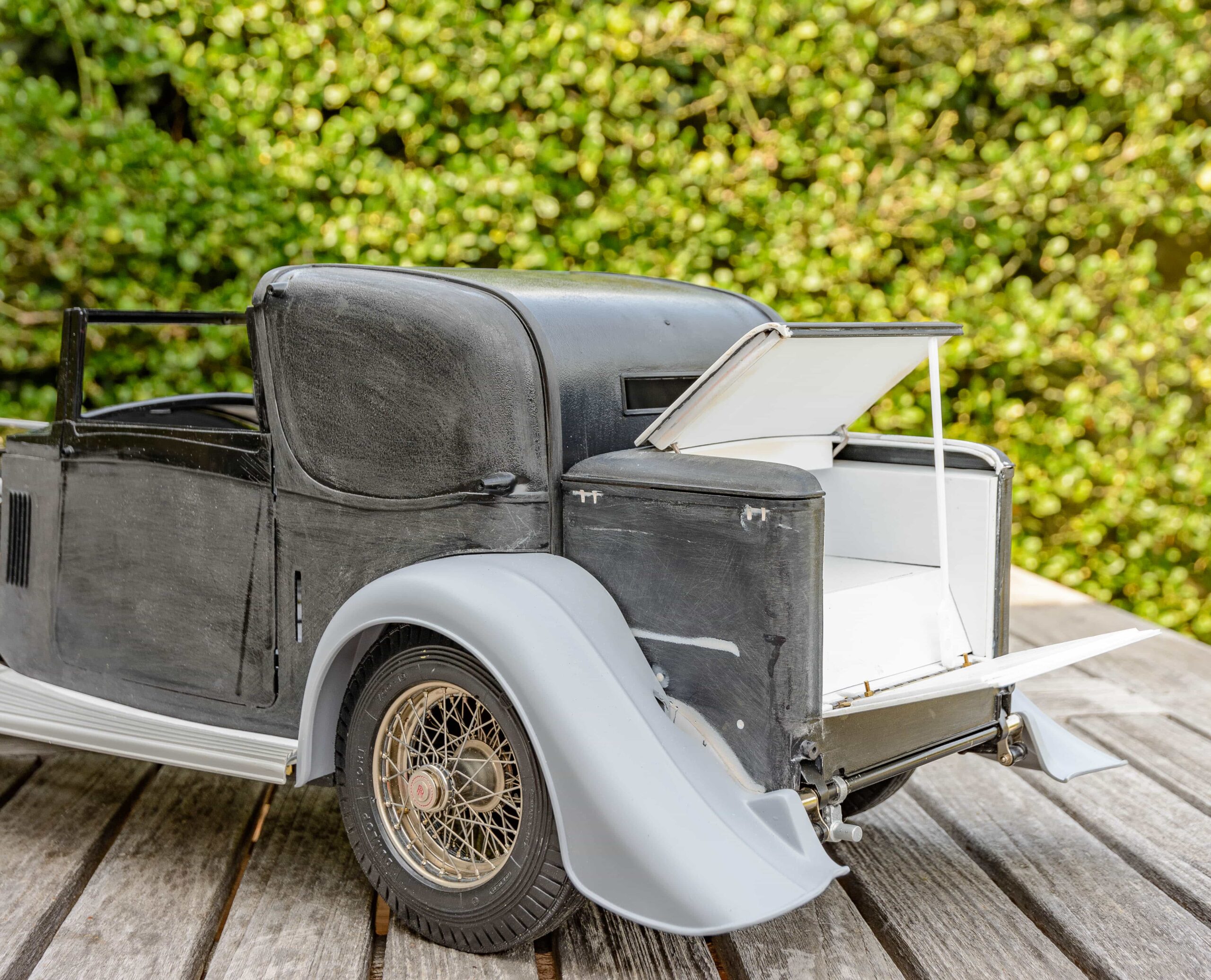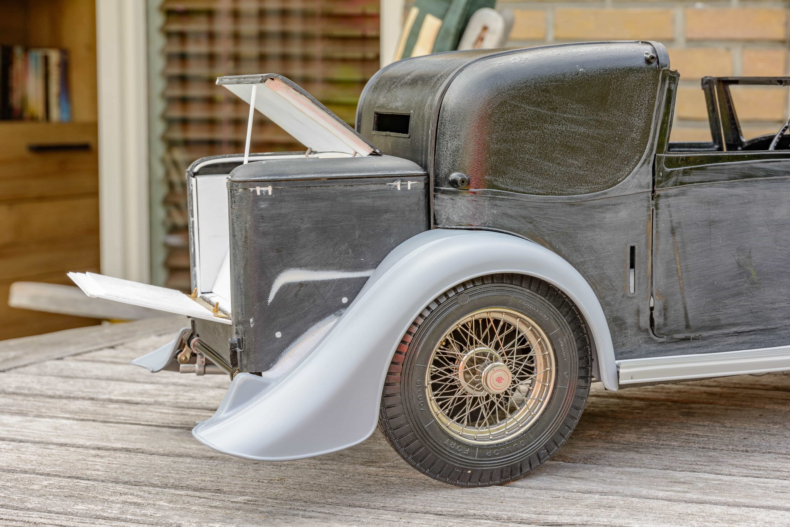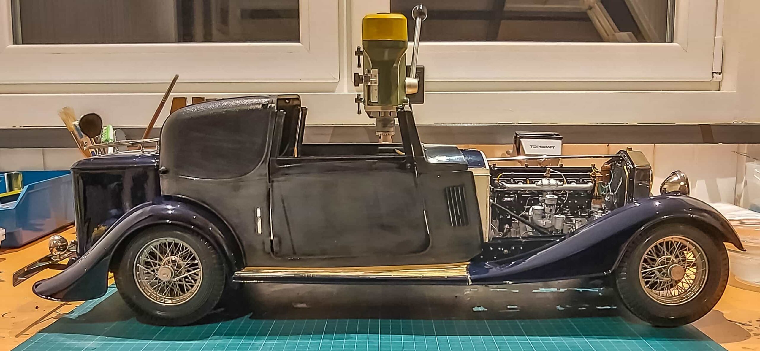 In addition to the usual demands presented by the Pocher Rolls-Royce (wire wheels, a forest of levers for the brake system, archaic body design depicting a rare and archaic thirties-era body style, wood dashboard, pleated leather seats, roll-up top, unusual wing and running board design) in addition to these standard torments, Mr. Bron has chosen to add brass window frames, a conversion to Torpedo fenders with side-mount spare wheels, and an assortment of brass details which, like the elaborate boot-lid supports, may never be seen by most viewers. In short, Mr. Bron has sent us a photographic record of how he has altered and enhanced nearly every assembly of his Rolls-Royce, which is all the more impressive when one notices that some of the components seem to have been painted before construction began, which suggests that he may have begun with a previously built model. Yikes. There is nothing quite like a bit of salvage work before digging into a complex model project.