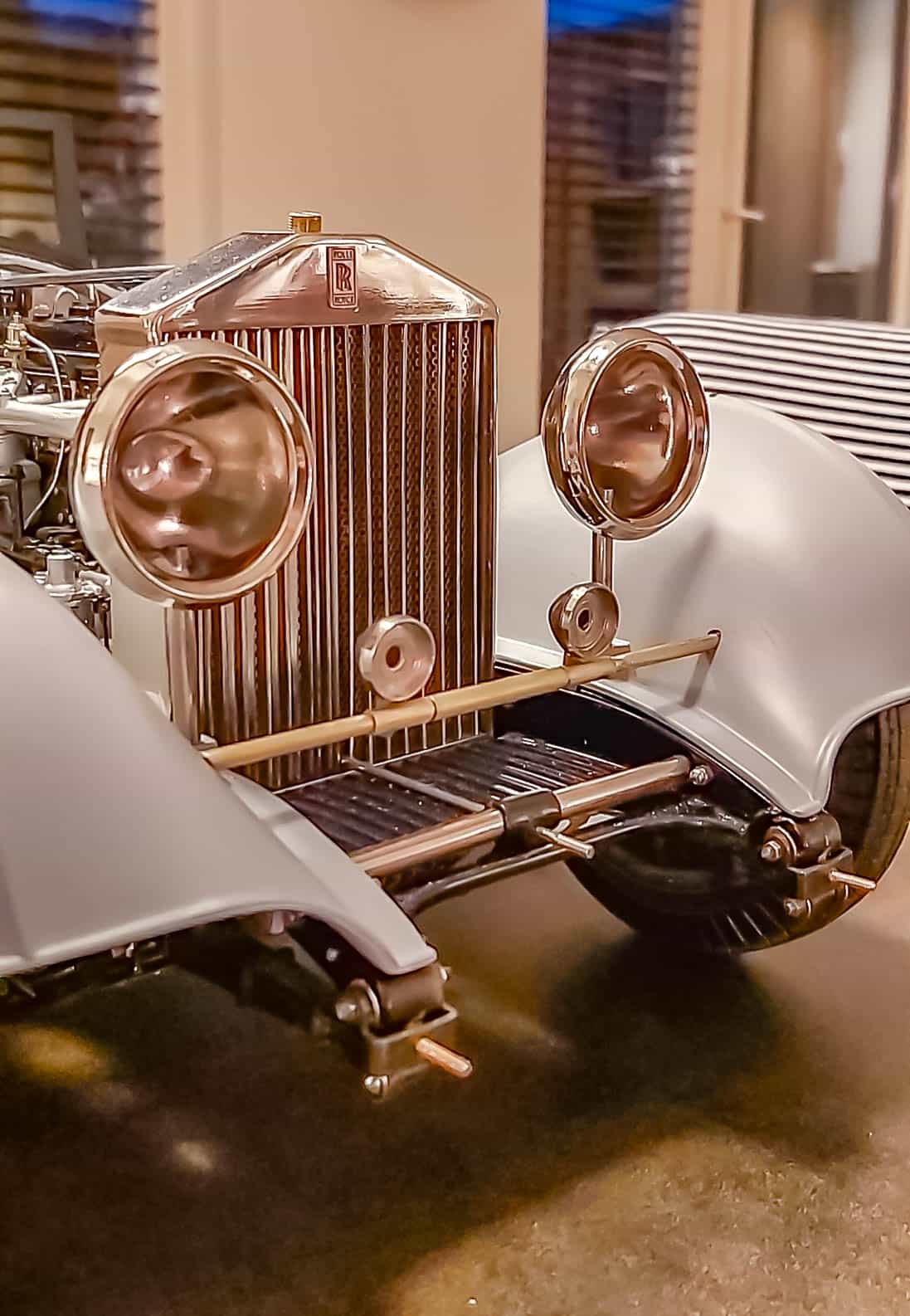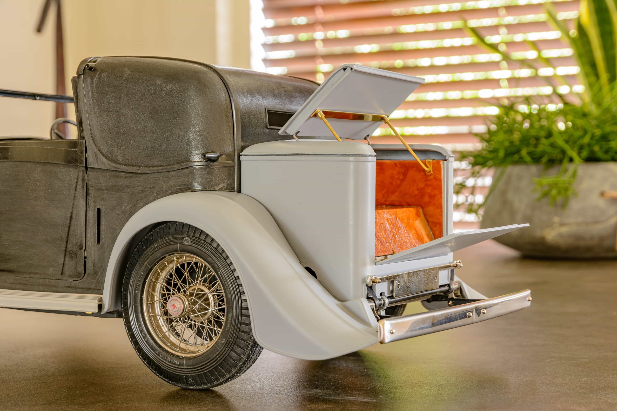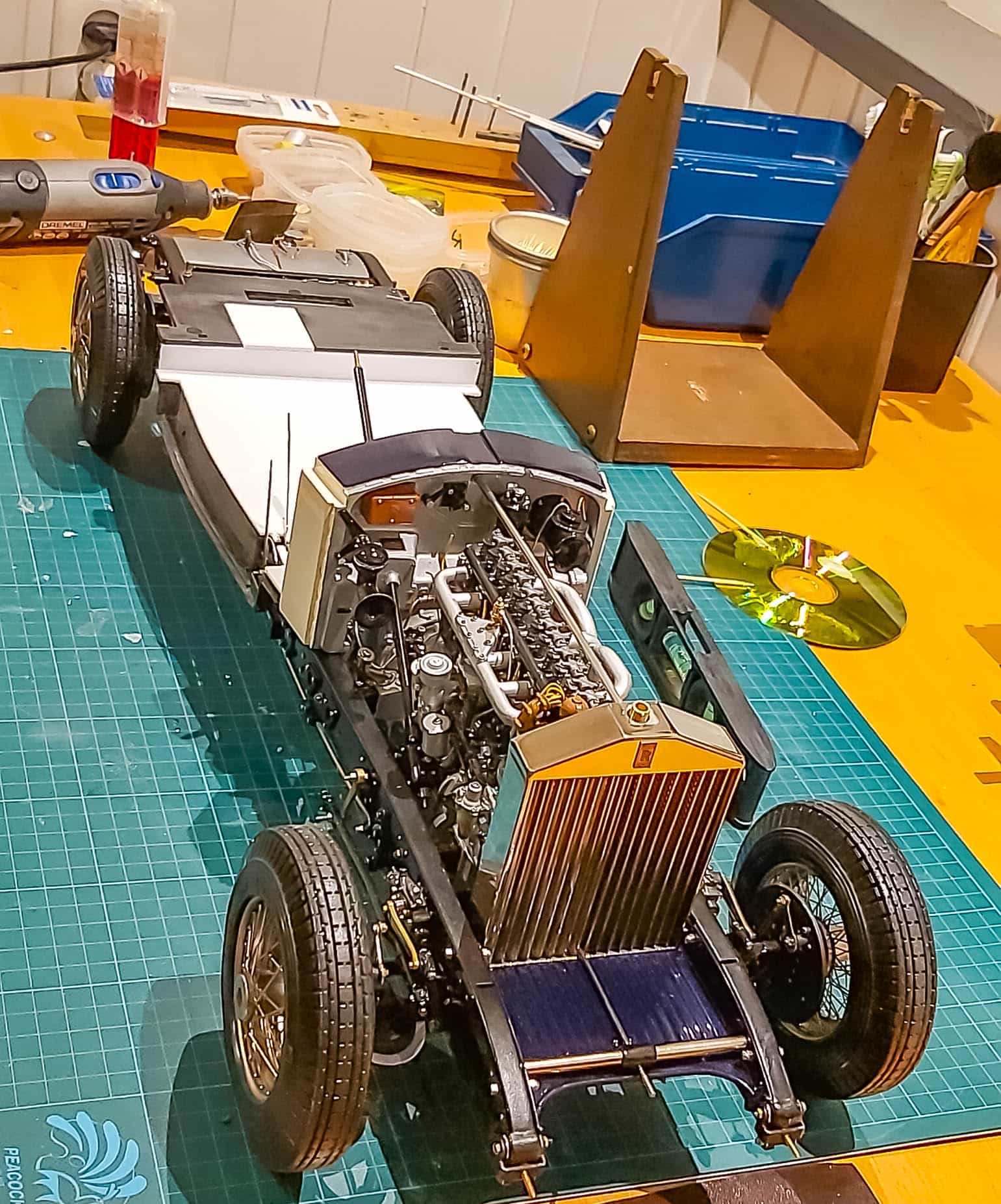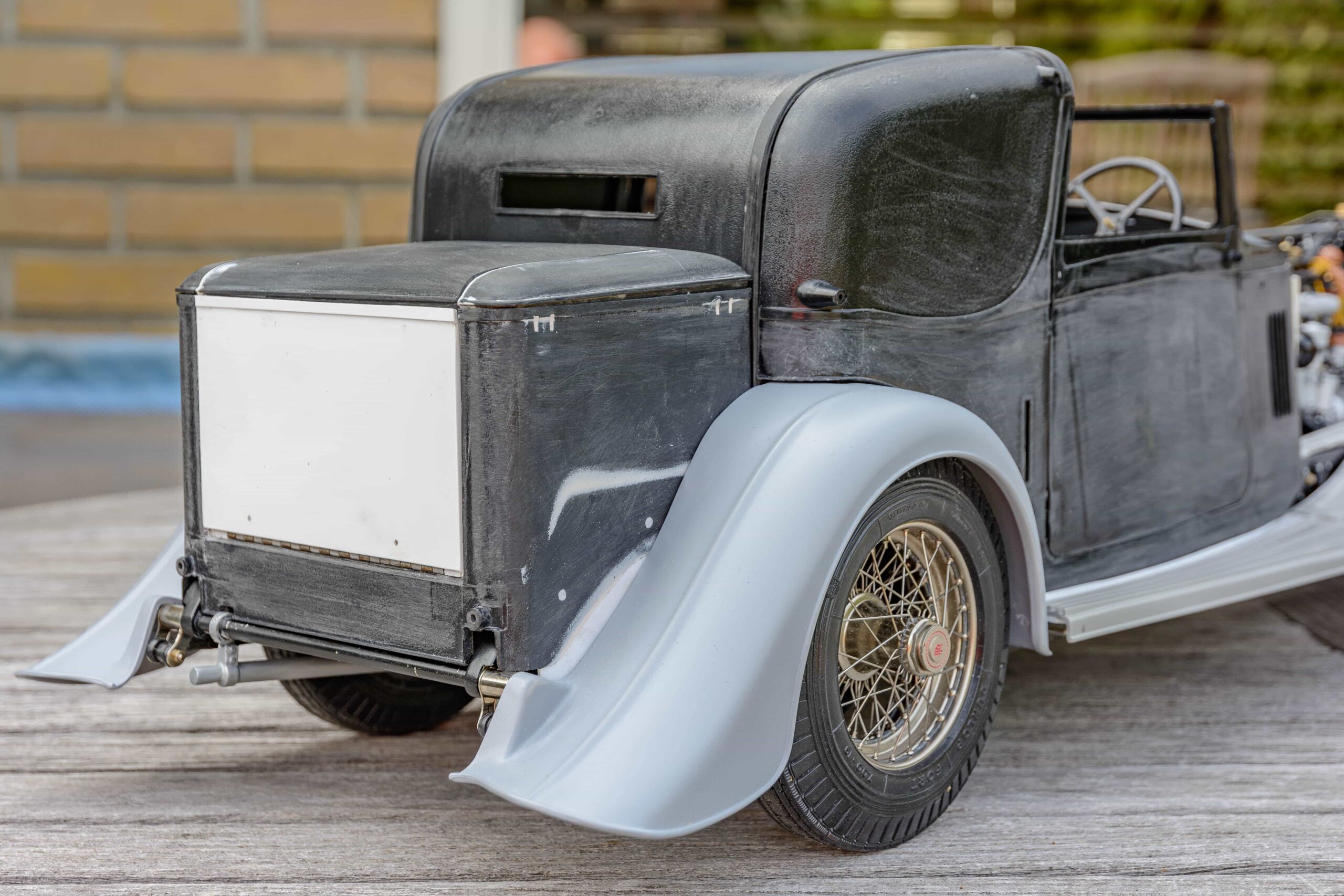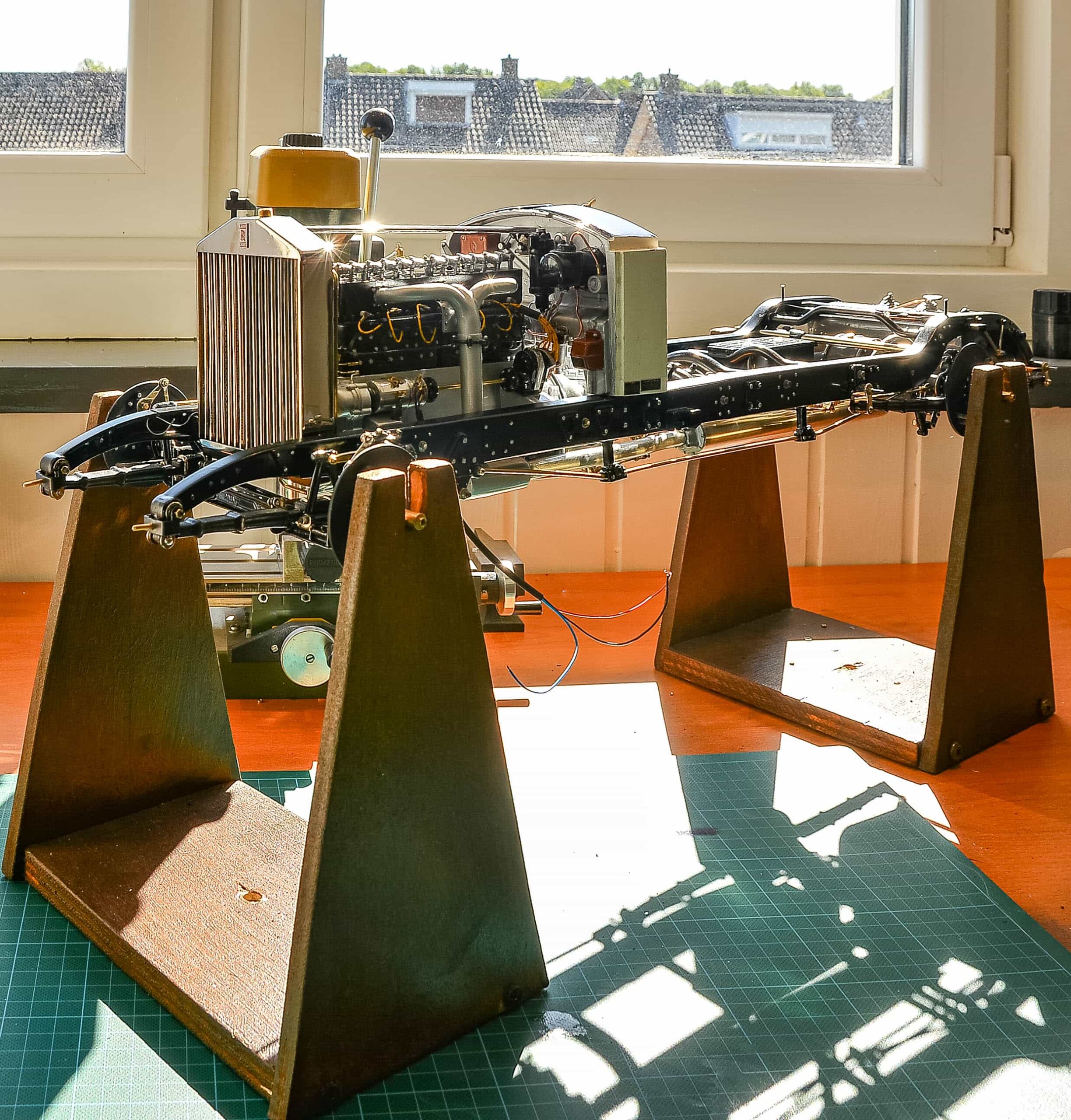 In addition to the usual demands presented by the Pocher Rolls-Royce (wire wheels, a forest of levers for the brake system, archaic body design depicting a rare and archaic thirties-era body style, wood dashboard, pleated leather seats, roll-up top, unusual wing and running board design) in addition to these standard torments, Mr. Bron has chosen to add brass window frames, a conversion to Torpedo fenders with side-mount spare wheels, and an assortment of brass details which, like the elaborate boot-lid supports, may never be seen by most viewers. In short, Mr. Bron has sent us a photographic record of how he has altered and enhanced nearly every assembly of his Rolls-Royce, which is all the more impressive when one notices that some of the components seem to have been painted before construction began, which suggests that he may have begun with a previously built model. Yikes. There is nothing quite like a bit of salvage work before digging into a complex model project.