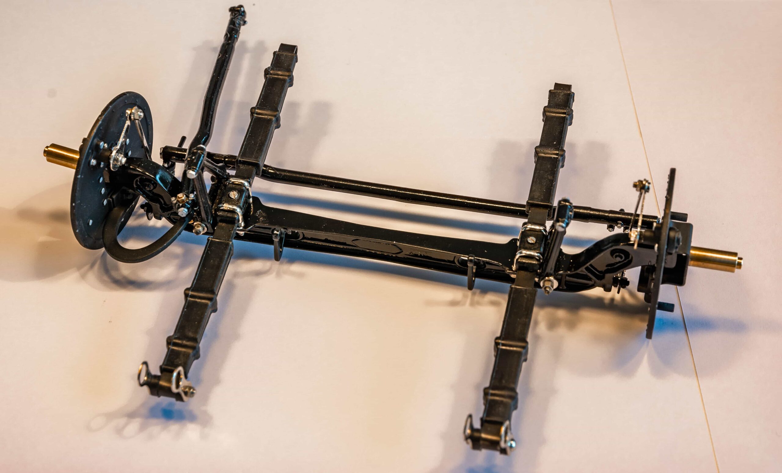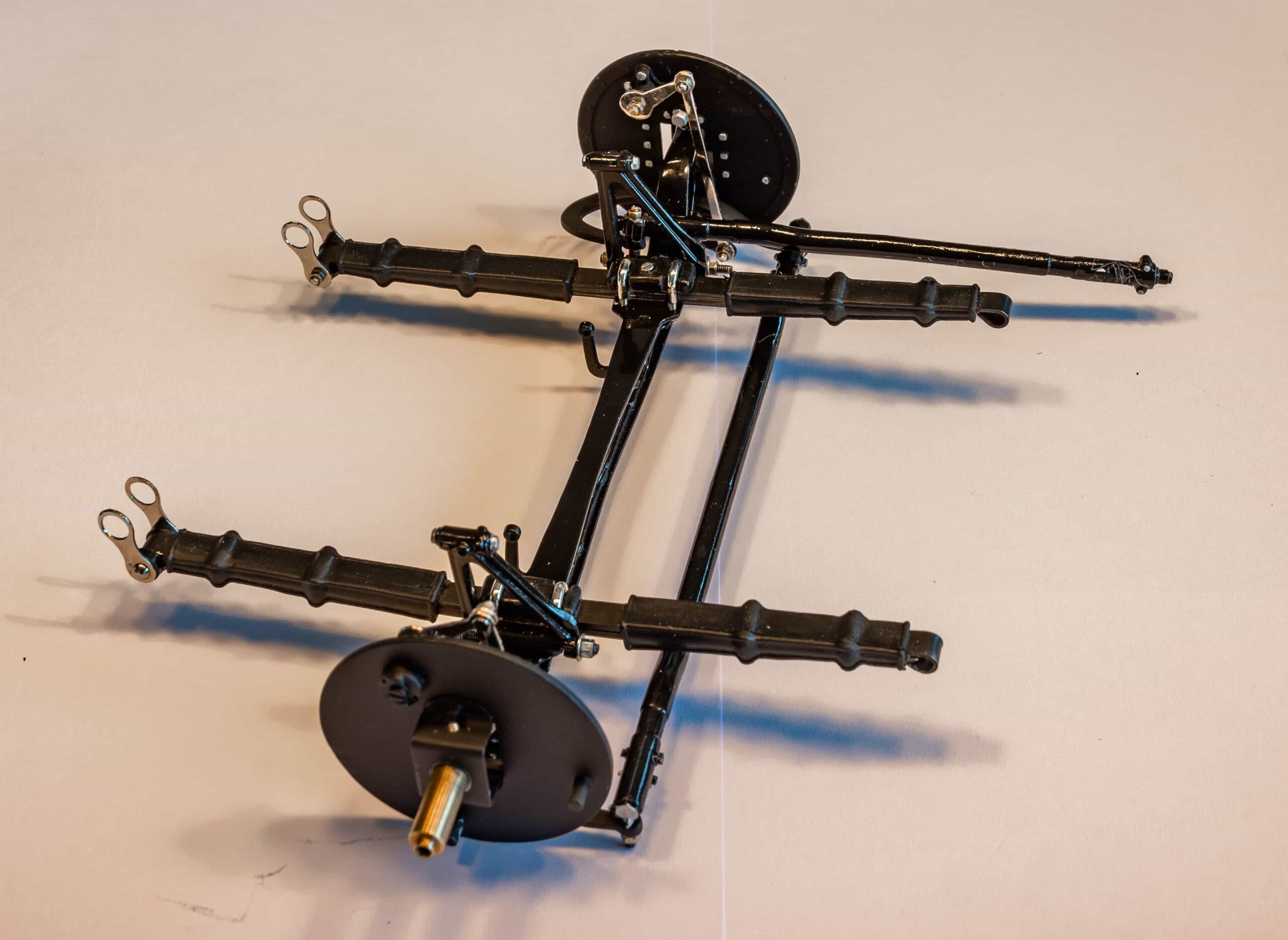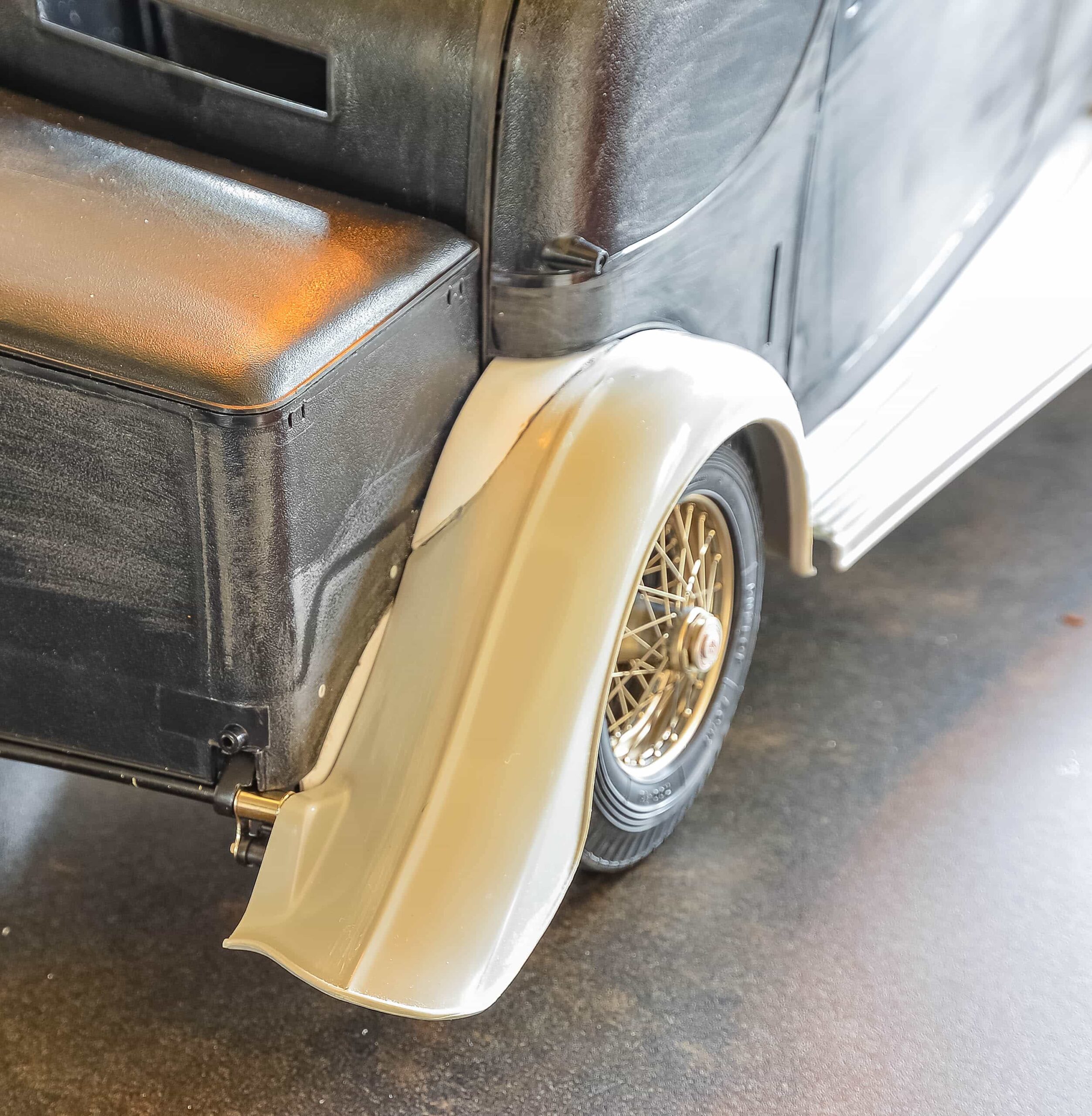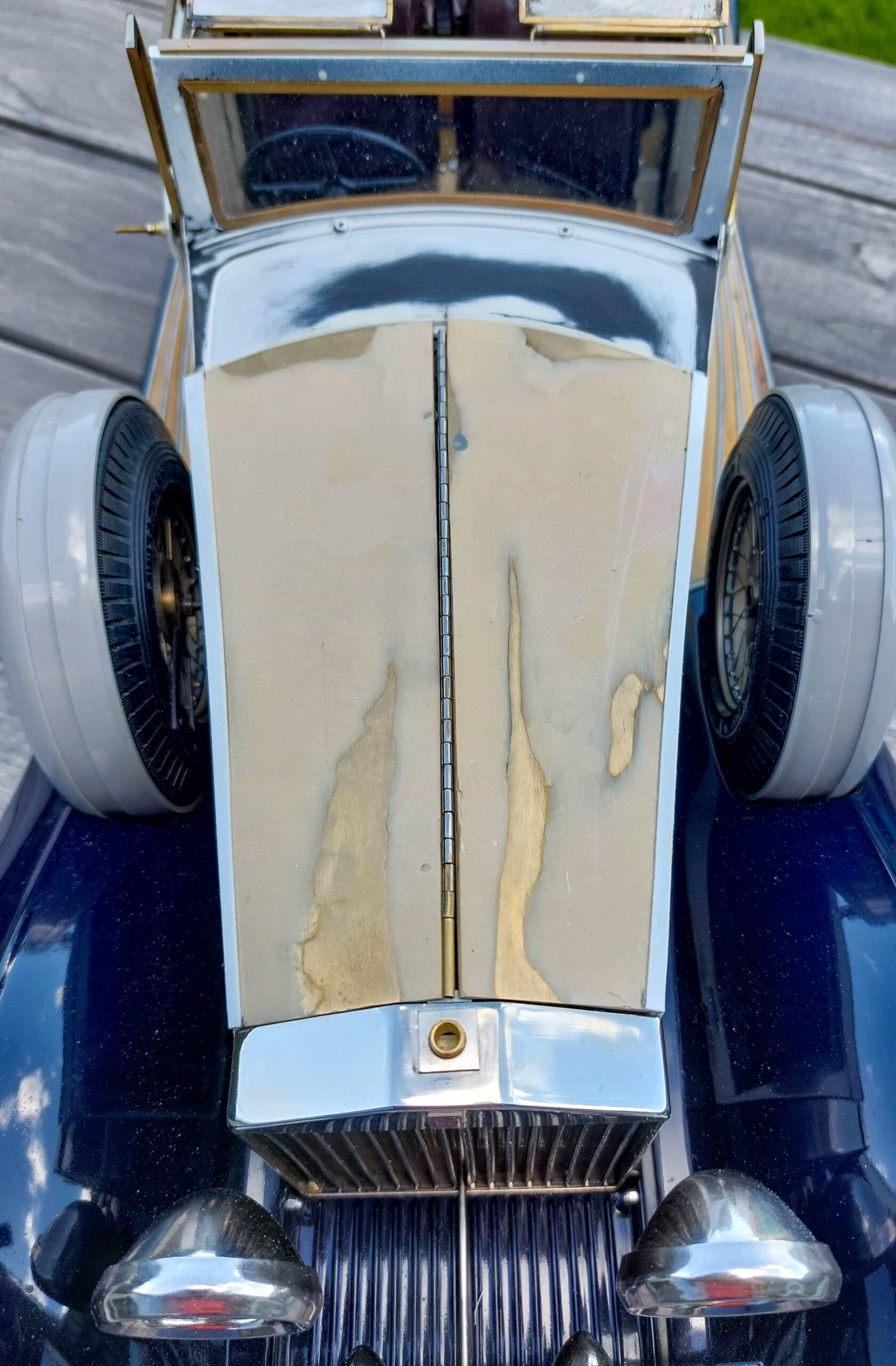 In addition to the usual demands presented by the Pocher Rolls-Royce (wire wheels, a forest of levers for the brake system, archaic body design depicting a rare and archaic thirties-era body style, wood dashboard, pleated leather seats, roll-up top, unusual wing and running board design) in addition to these standard torments, Mr. Bron has chosen to add brass window frames, a conversion to Torpedo fenders with side-mount spare wheels, and an assortment of brass details which, like the elaborate boot-lid supports, may never be seen by most viewers. In short, Mr. Bron has sent us a photographic record of how he has altered and enhanced nearly every assembly of his Rolls-Royce, which is all the more impressive when one notices that some of the components seem to have been painted before construction began, which suggests that he may have begun with a previously built model. Yikes. There is nothing quite like a bit of salvage work before digging into a complex model project.