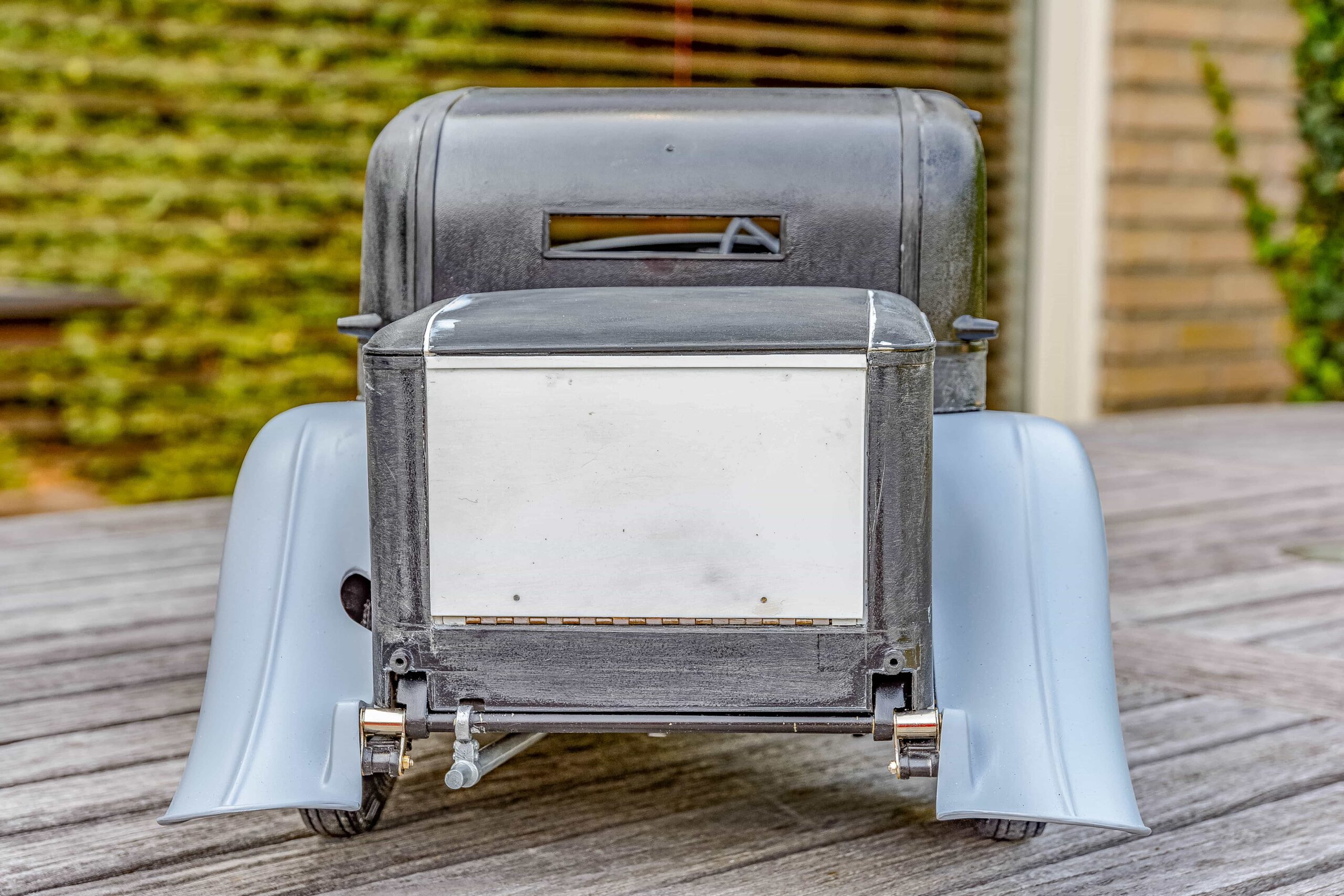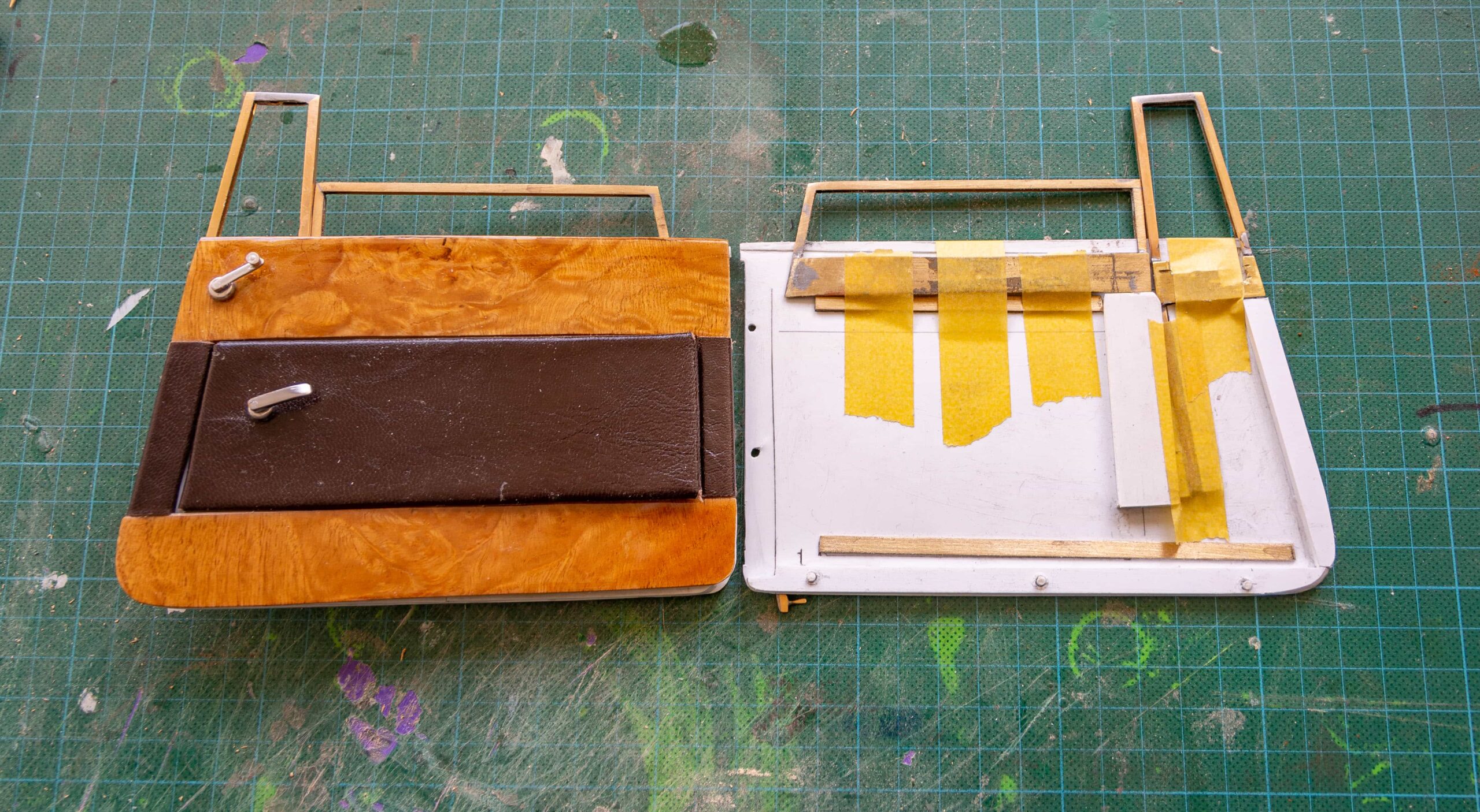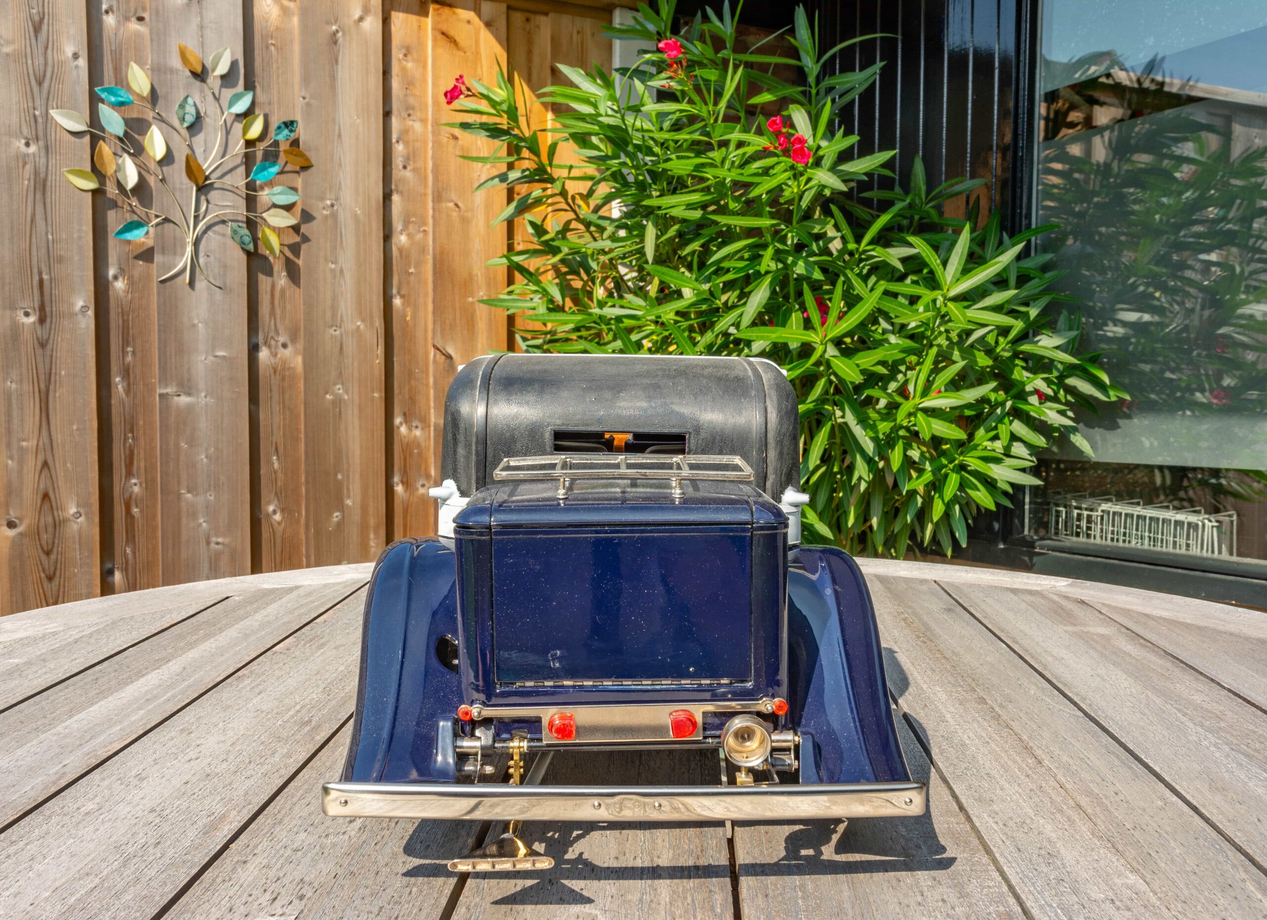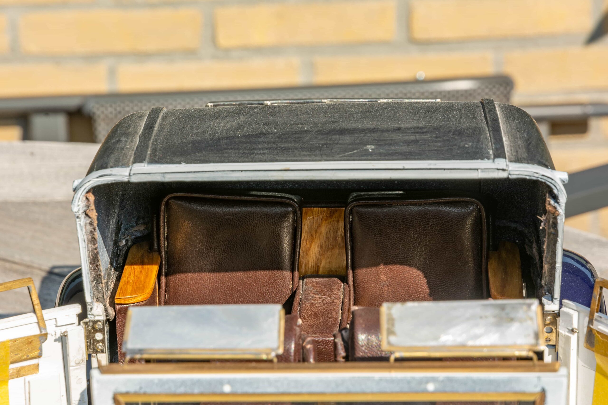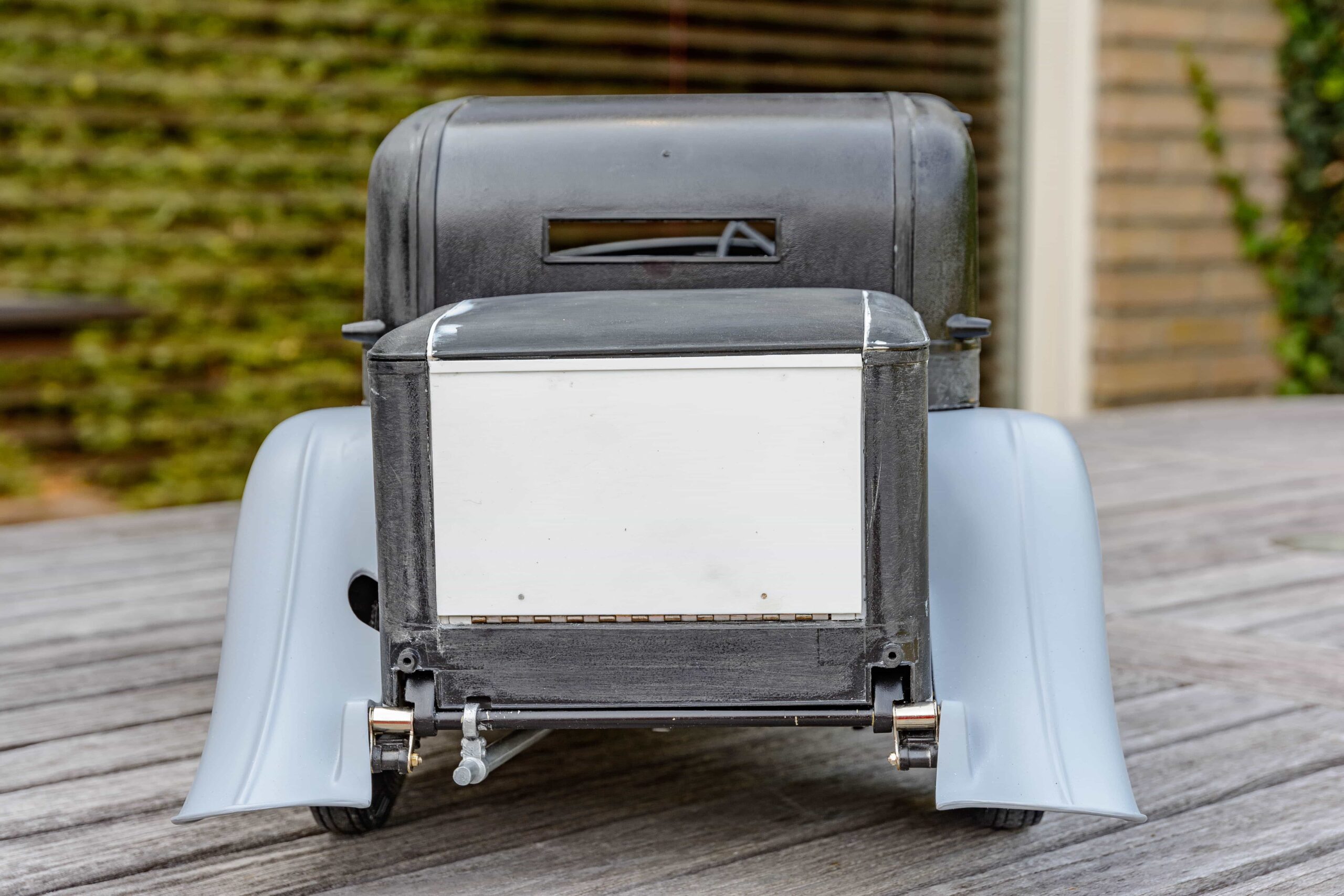 In addition to the usual demands presented by the Pocher Rolls-Royce (wire wheels, a forest of levers for the brake system, archaic body design depicting a rare and archaic thirties-era body style, wood dashboard, pleated leather seats, roll-up top, unusual wing and running board design) in addition to these standard torments, Mr. Bron has chosen to add brass window frames, a conversion to Torpedo fenders with side-mount spare wheels, and an assortment of brass details which, like the elaborate boot-lid supports, may never be seen by most viewers. In short, Mr. Bron has sent us a photographic record of how he has altered and enhanced nearly every assembly of his Rolls-Royce, which is all the more impressive when one notices that some of the components seem to have been painted before construction began, which suggests that he may have begun with a previously built model. Yikes. There is nothing quite like a bit of salvage work before digging into a complex model project.