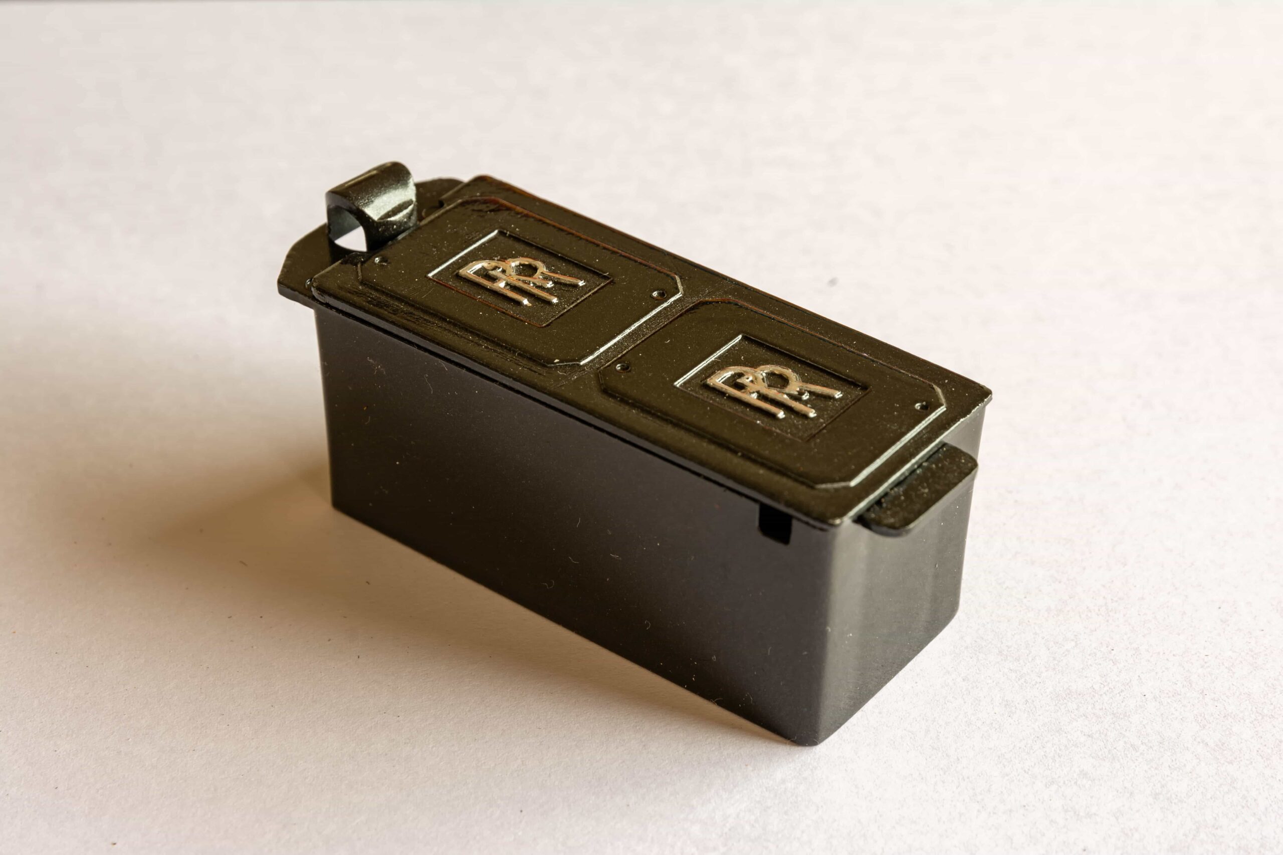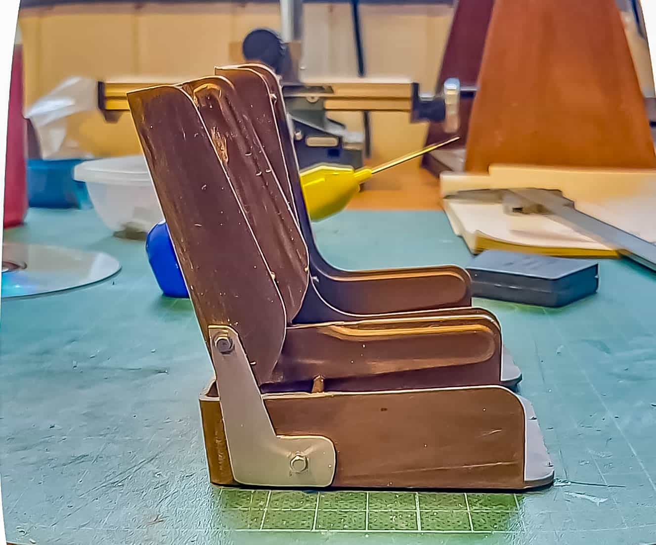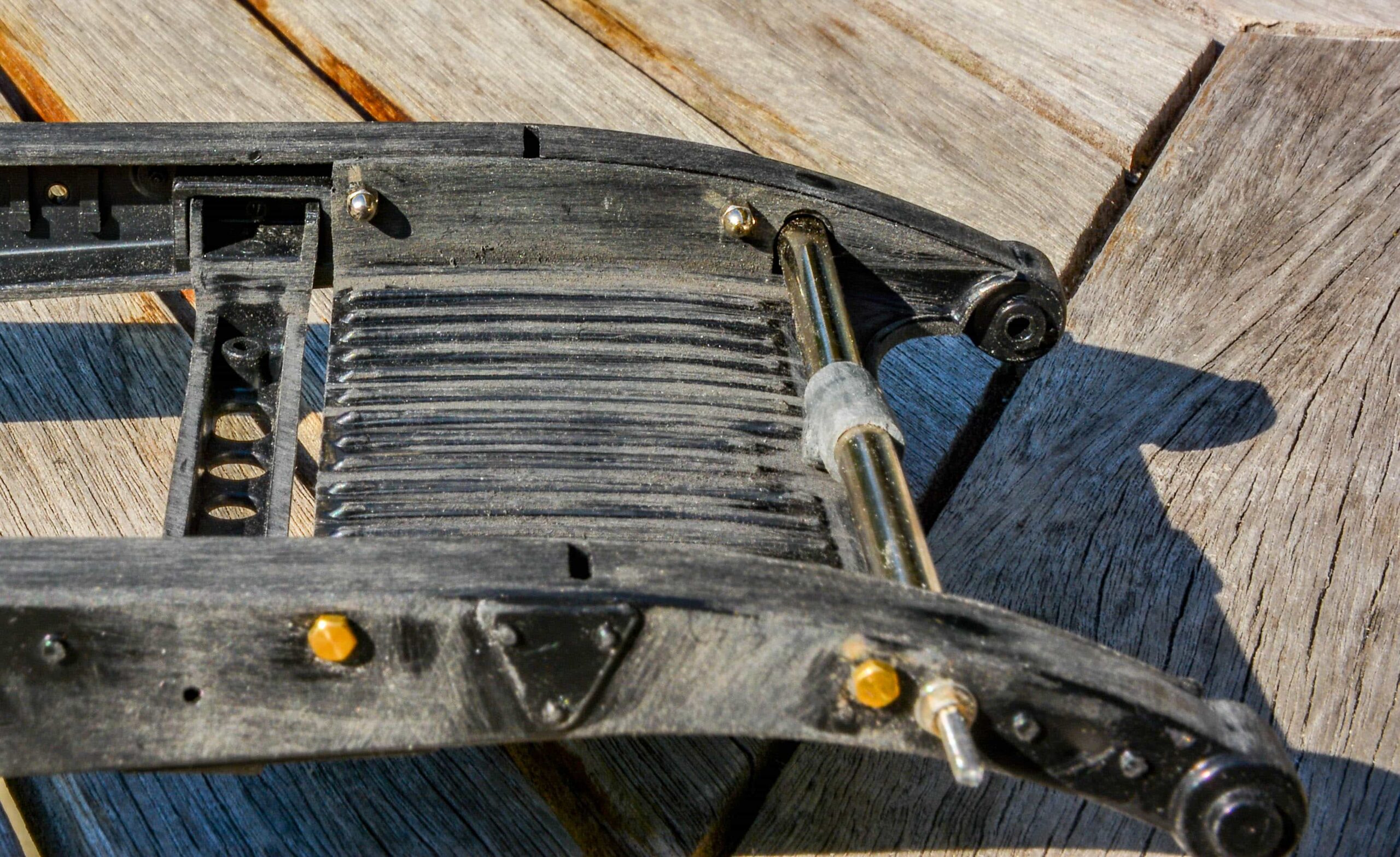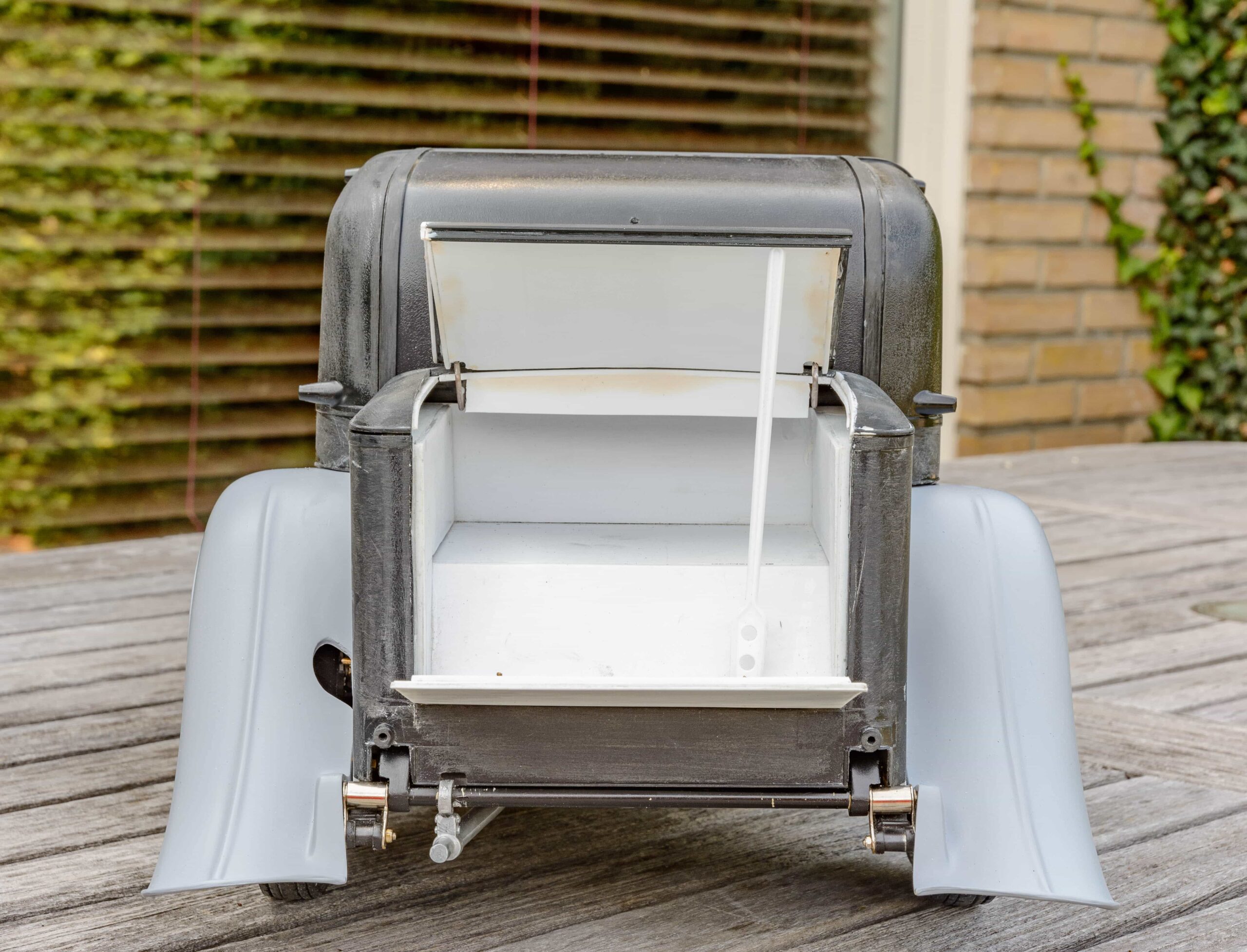 In addition to the usual demands presented by the Pocher Rolls-Royce (wire wheels, a forest of levers for the brake system, archaic body design depicting a rare and archaic thirties-era body style, wood dashboard, pleated leather seats, roll-up top, unusual wing and running board design) in addition to these standard torments, Mr. Bron has chosen to add brass window frames, a conversion to Torpedo fenders with side-mount spare wheels, and an assortment of brass details which, like the elaborate boot-lid supports, may never be seen by most viewers. In short, Mr. Bron has sent us a photographic record of how he has altered and enhanced nearly every assembly of his Rolls-Royce, which is all the more impressive when one notices that some of the components seem to have been painted before construction began, which suggests that he may have begun with a previously built model. Yikes. There is nothing quite like a bit of salvage work before digging into a complex model project.