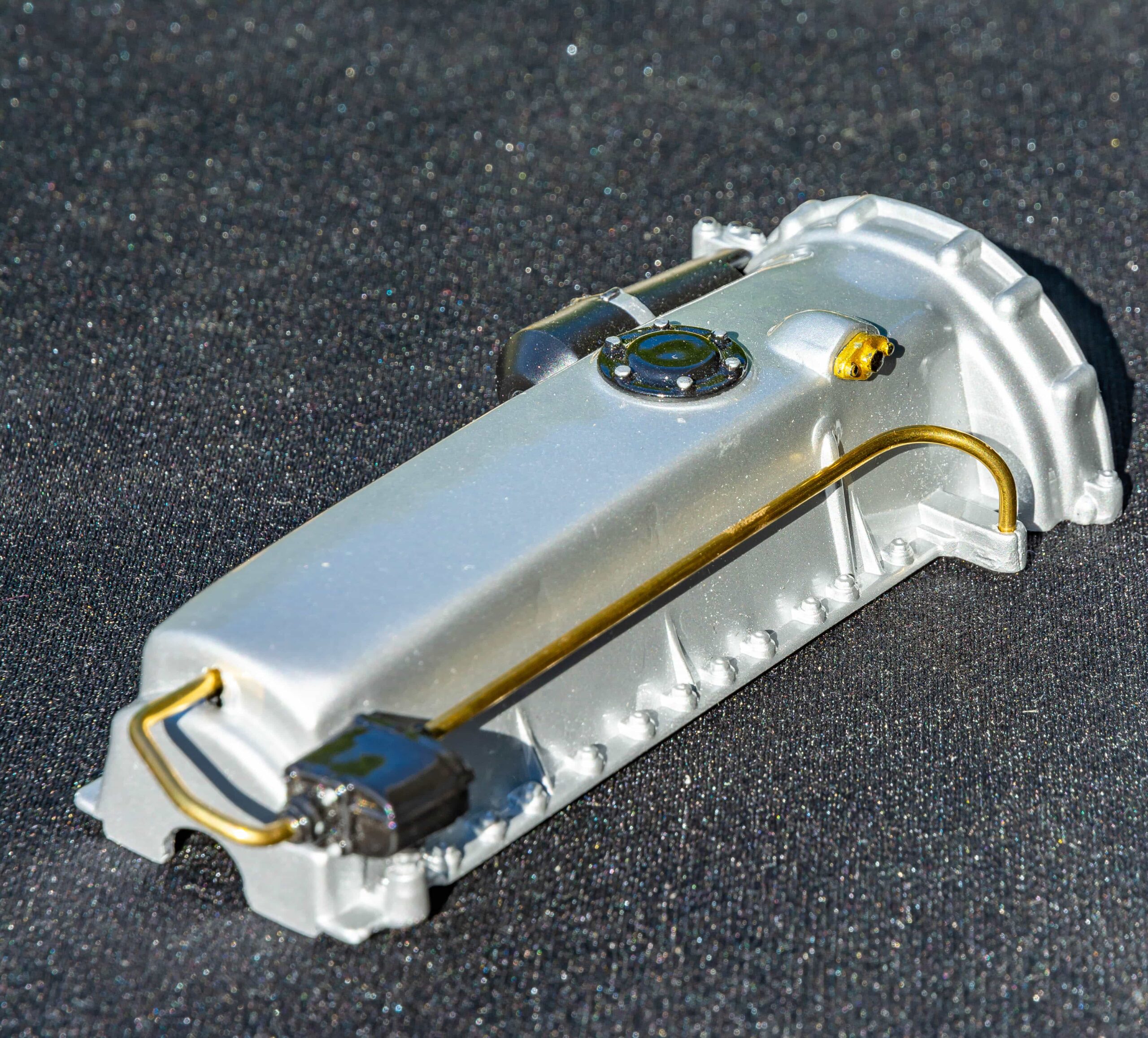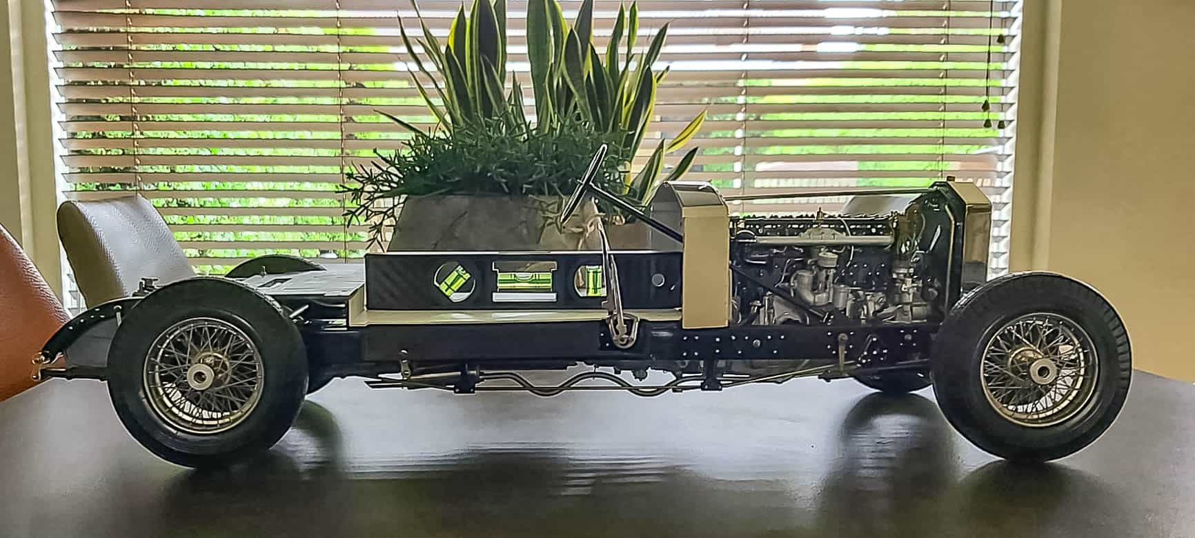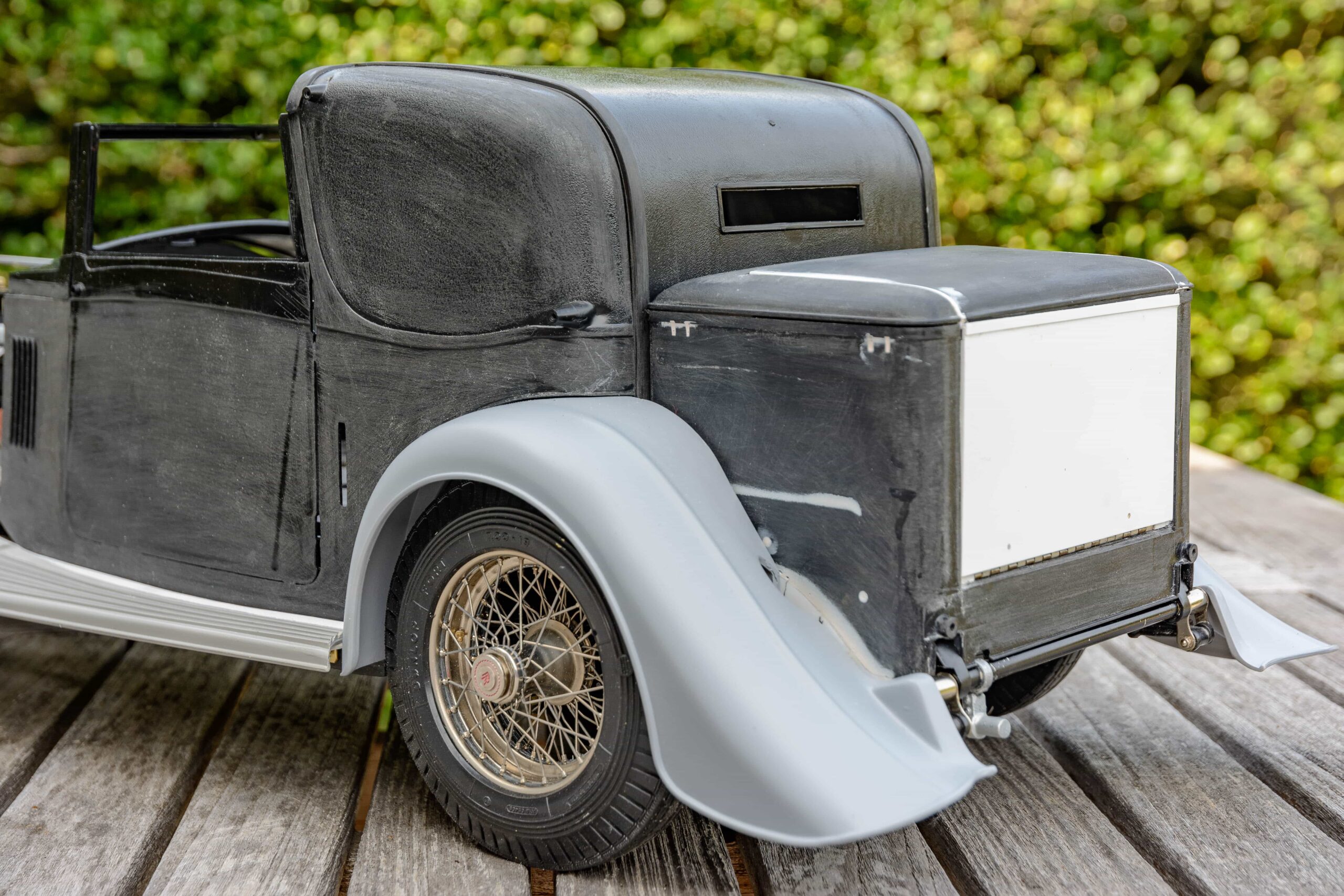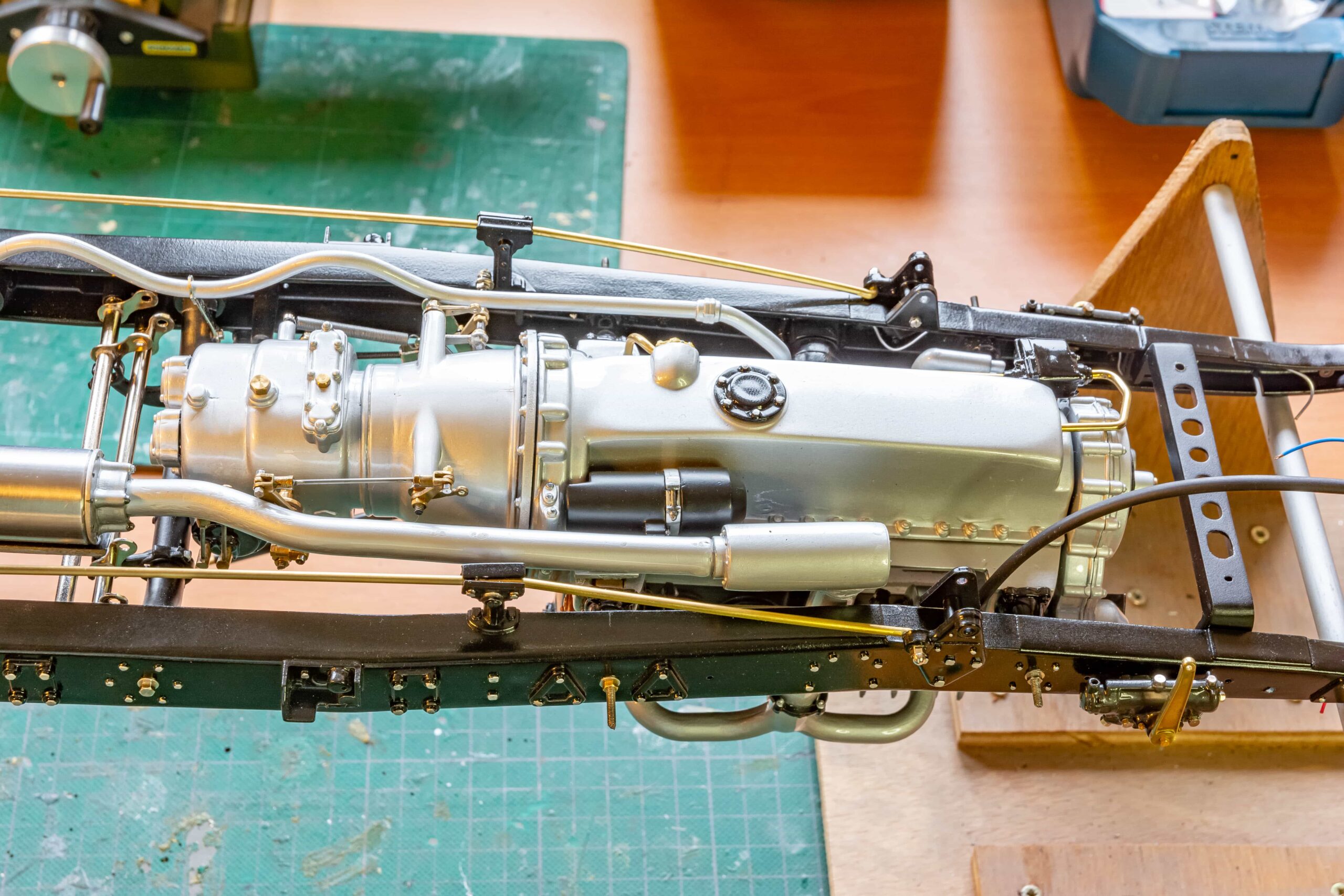 Regardless of whether the components were fresh or previously used, the fact remains that little of the original parts remain. Body components have been massaged, engine doodads have been enhanced or replaced, and even the chassis shows signs of having been given attention. The thorough construction photos attest to an attention to detail that had to be applied long before there was anything resembling a model sitting on the bench. Modifications also attest to the biggest challenge facing any model builder—planning. Mr. Bron must have known before he began where he was going.