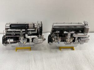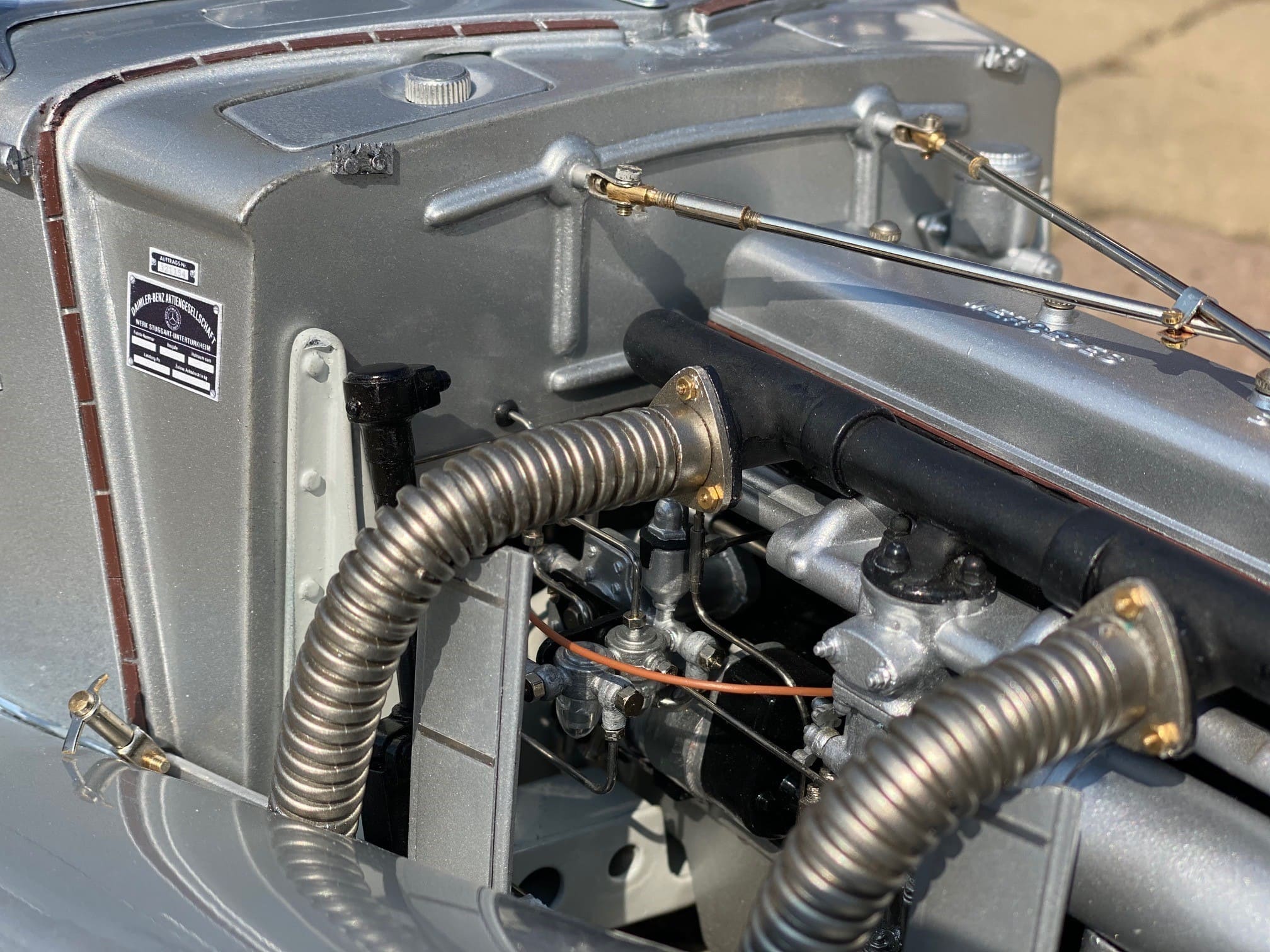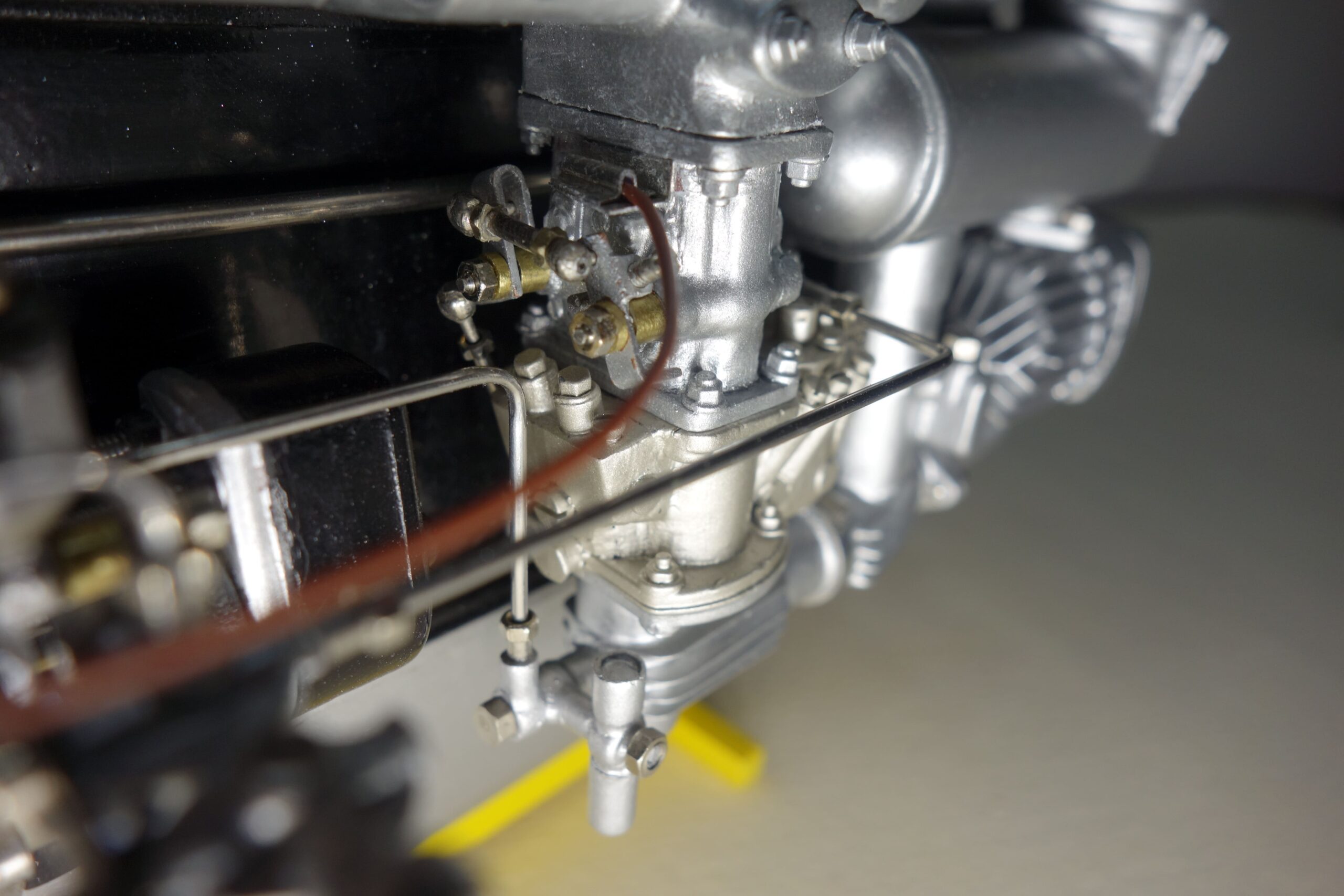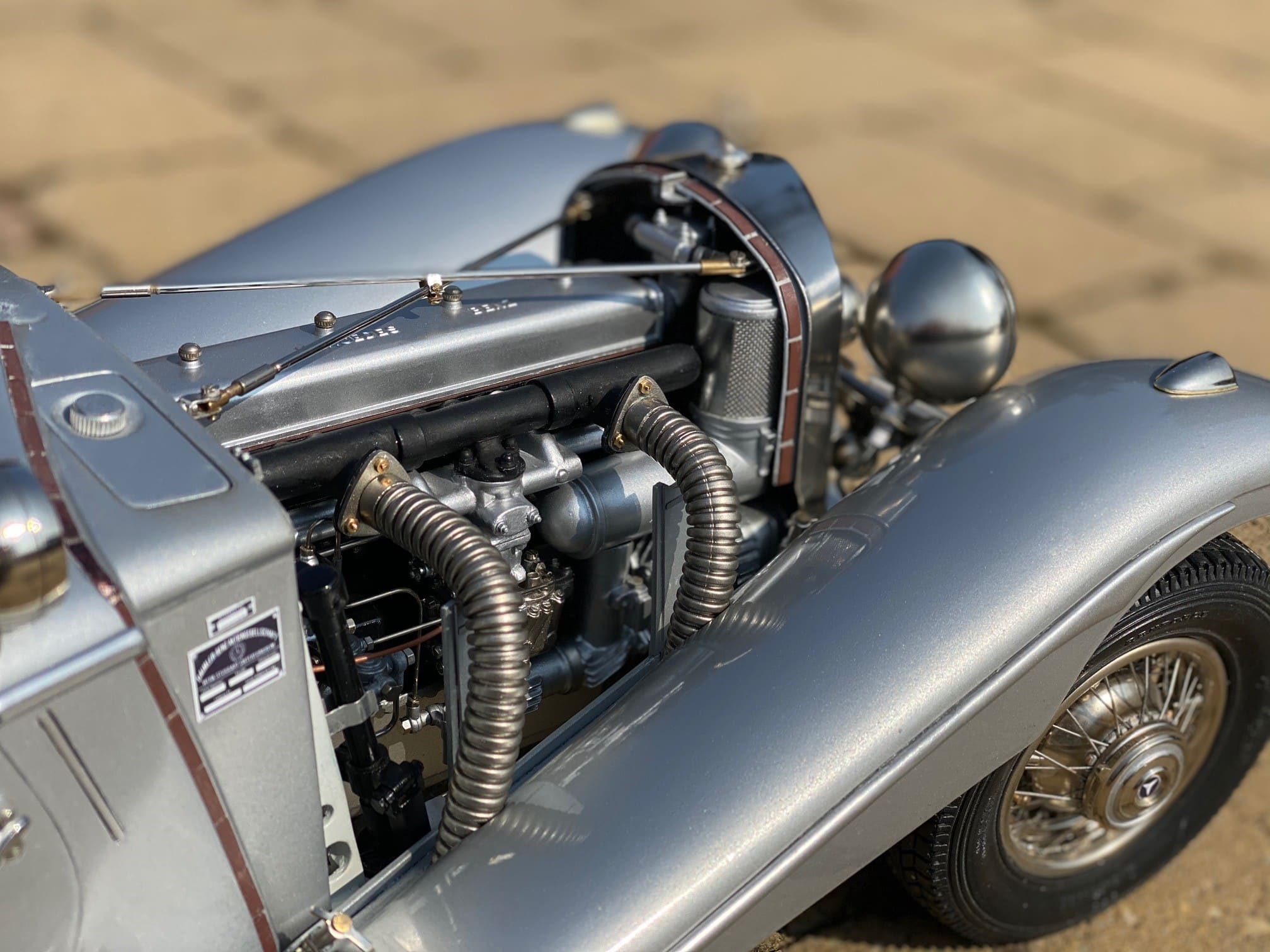 Putting aside all of the big stuff—the set-back engine, the shortened body, the re-shaped doors—Babej’s 540K went for the heart-breakers, the changes that only one in a thousand will notice, changes that take huge lumps of time to accomplish. Things like raising the door sills, changing the fender profiles, and adding an oil scraper to the engine, an engine which has been treated to having been lavishly converted to the details of the 540K specification, including the inverted manifolds, the relocated and fully plumbed Yunkers Motorenwerke Jumo fuel pump, and a full complement of secondary wiring and control levers. Even the radiator support rods have been lovingly enhanced into perfect replicas. Conspicuous by its absence is the unsightly gap around the Pocher firewall as it misses the embrace of the body around its edges, and the enormous trafficators have been trimmed down to be svelte jewelry of great subtlety.