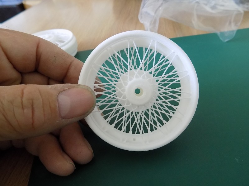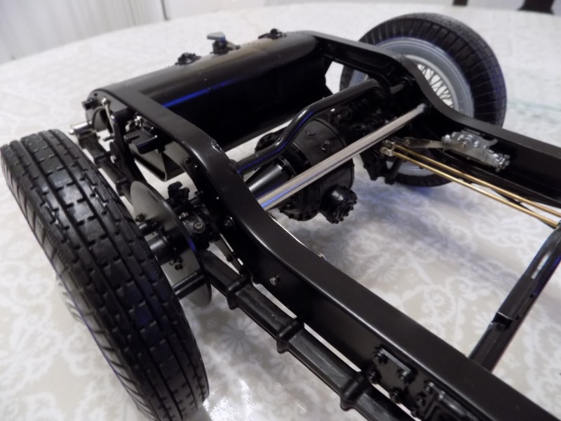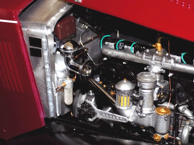 Acres of black plastic beg for some use of paint, and most of us are familiar with how easily the selection of colors can diminish an otherwise presentable result. Peter Turner pays homage to his American cousins with a color scheme right out of the Packard play book, leaving the somber tones for his fellow country- men. The handsome cream wire wheels are a wonderful match for the leather roof and interior, and bring the model forward nearly thirty years.