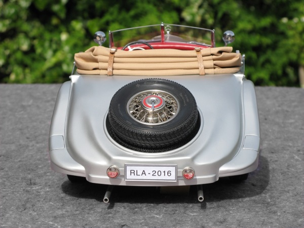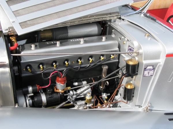 This handsome model built by Roger Antrobus has faithfully followed the Pocher instructions to produce an alternative appearance for #130859. Even Pocher experimented with colors (the car was available in later years in a red version) so this silver and tan version is in good company. The prototype's tan wire wheels have been changed to 'bright' or polished finish, and the bright red interior is a treat to see. The prototype was auctioned with wide whitewall tires-they must have been admiring the Pocher box top-but this model version uses the more traditional blackwall tires.
