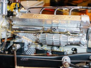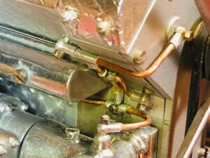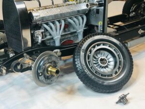 The stars of this show are a set of meticulously engine-turned inspection plates and cam boxes, backed up with delightful banjo fittings on the oil lines, as well as adjusters on the throttle linkage. From the elegant leather door pulls to the other-worldly stitching on the seats, McCuskey’s Bug is a paean to this iconic design. Clearly this Mr. McCuskey fellow is a man of discernment and talent. He has taken the Pocher components, added our pieces, and the result is a remarkable model. We applaud his efforts and praise his results.