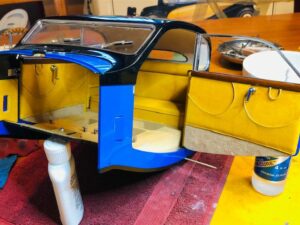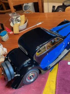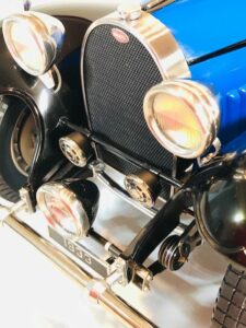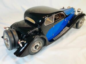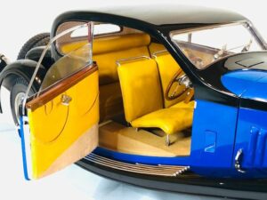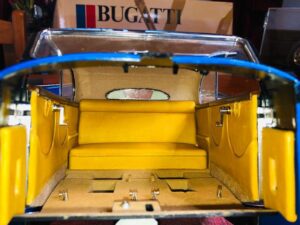 The choice of blue as the primary body color pays homage to Bugatti and elevates the Pocher model into the realm of an accurate scale replica. The fit and finish on all of the components is above reproach, and the wood door caps and wood dashboard serve as an inspiration to us all.