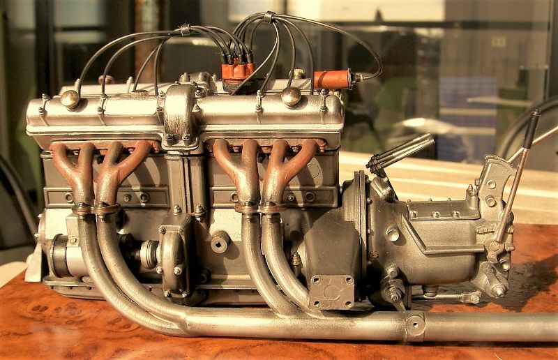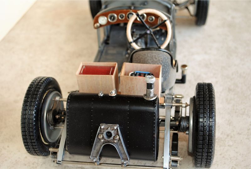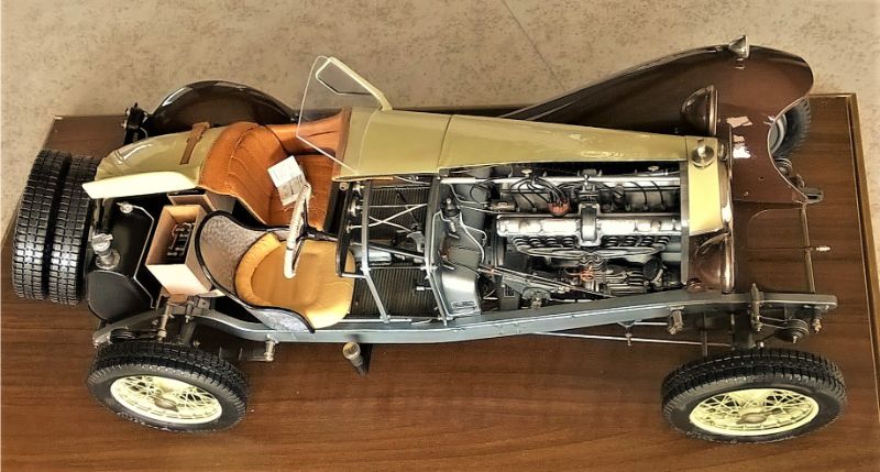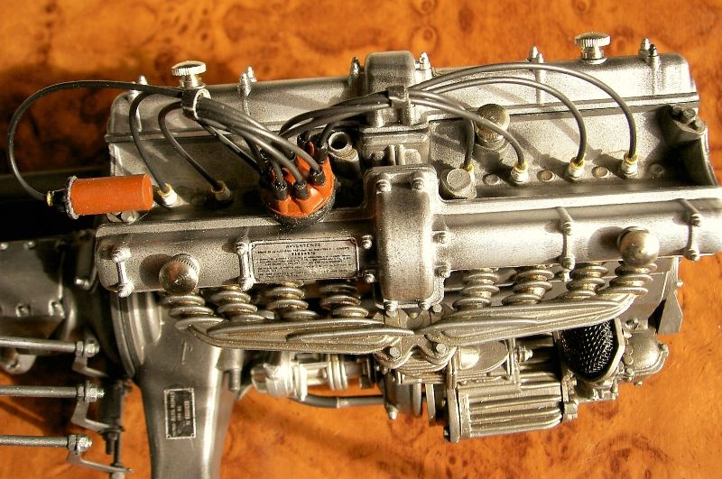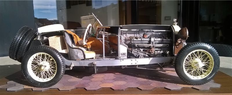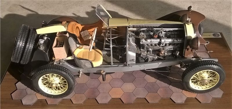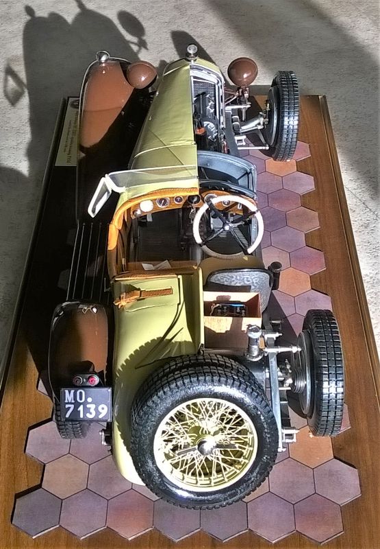 So what separates Mr. Rossi's Alfa from so many others? It is not the meticulous assembly, nor the glistening paintwork, nor the attention to detail, nor the wonderful colors, nor even remarkable craftsmanship and scratch-built components. We see lots of models with all of those features, and we celebrate them because of those features. What we seldom see-or even accomplish-is a concept that so powerfully joins the forces of teaching with entertaining. All models are in some way teaching tools, none more so that models of historic subjects like the Pocher Alfa. And all models seek to entertain the viewer with the startling effects of miniaturization. Mr. Rossi has taken these two impulses and moved them up a notch or two-- turned up the volume as it were-and the results are truly delightful. The fact that his concept is rooted in historical fact makes the model even more entertaining, rather like the distinction between listening to a recording or attending a live concert. Bravo! Bravely done.