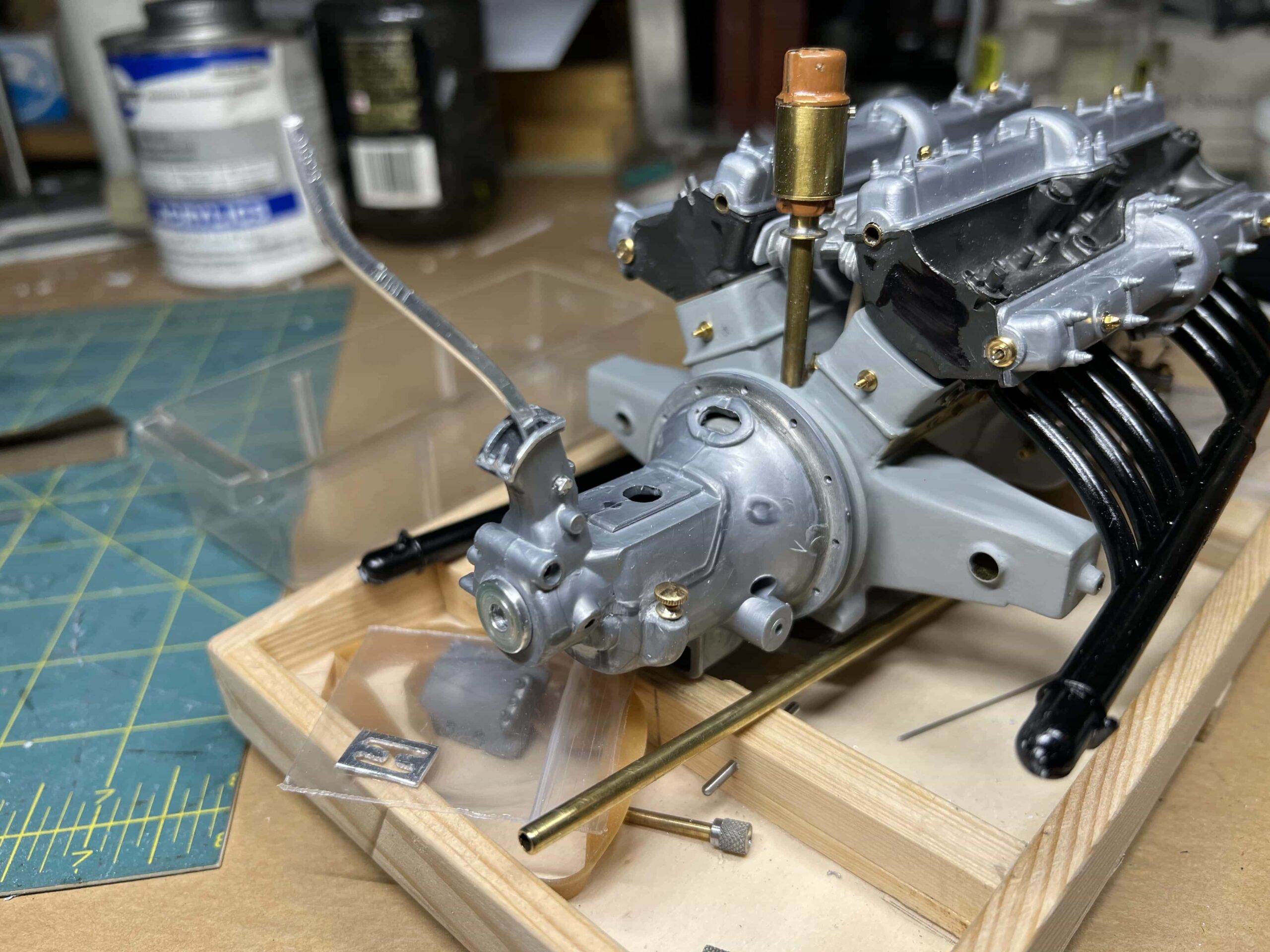 A careful rummage though the parts bin revealed two Alfa Romeo cylinder heads, lonely and abandoned, one with a complete set of bright red spark plug wires. These sorry pieces could not help but pull on any Pocher builder’s heart strings. Sad, so sad. But what could be done? There was no engine block, no timing cover, no doodads nor whatchamacallits, just a lonely pair of cylinder heads and four cam covers. The inventory of the missing pieces was insurmountable. Think of trying to find intake manifolds, exhaust manifolds, carburetors, or even distributors. Surely these heads were doomed to molder in the parts bin until their very resin turned to dust. But there were two Mercedes distributors in an adjacent parts bin, and among the Mercedes parts were two Alfa carburetors, one missing its top. What the Alfa carburetors were doing in the Mercedes bin is beside the point, but this happy accident led to the creation of the Sweet Sixteen. It was truly an example of thinking outside the box, which In this case was a bin.